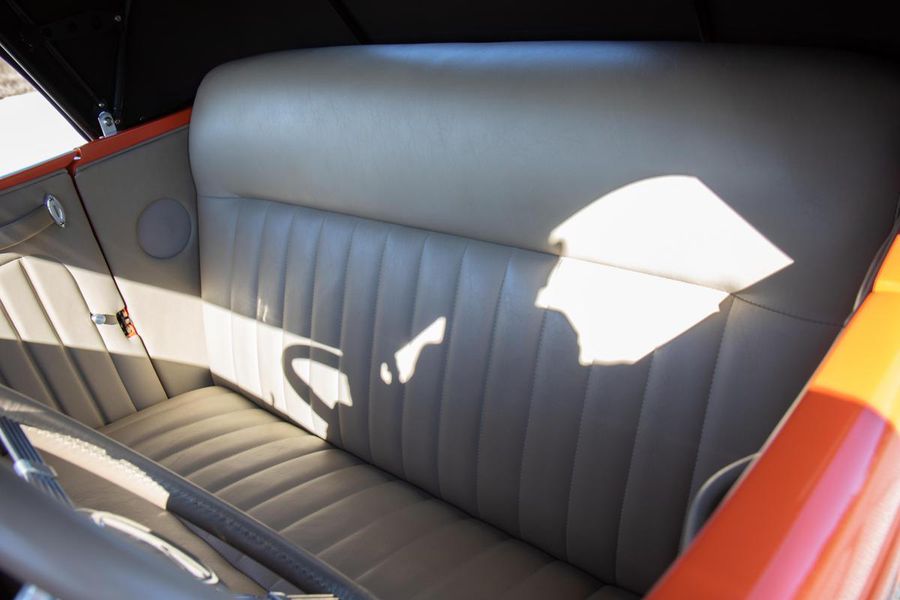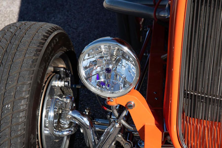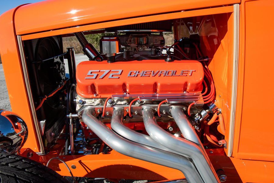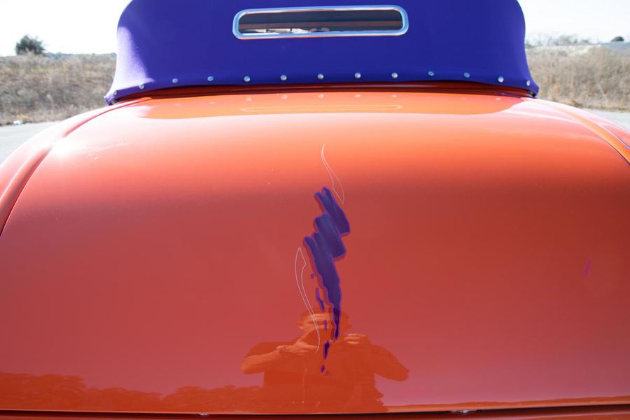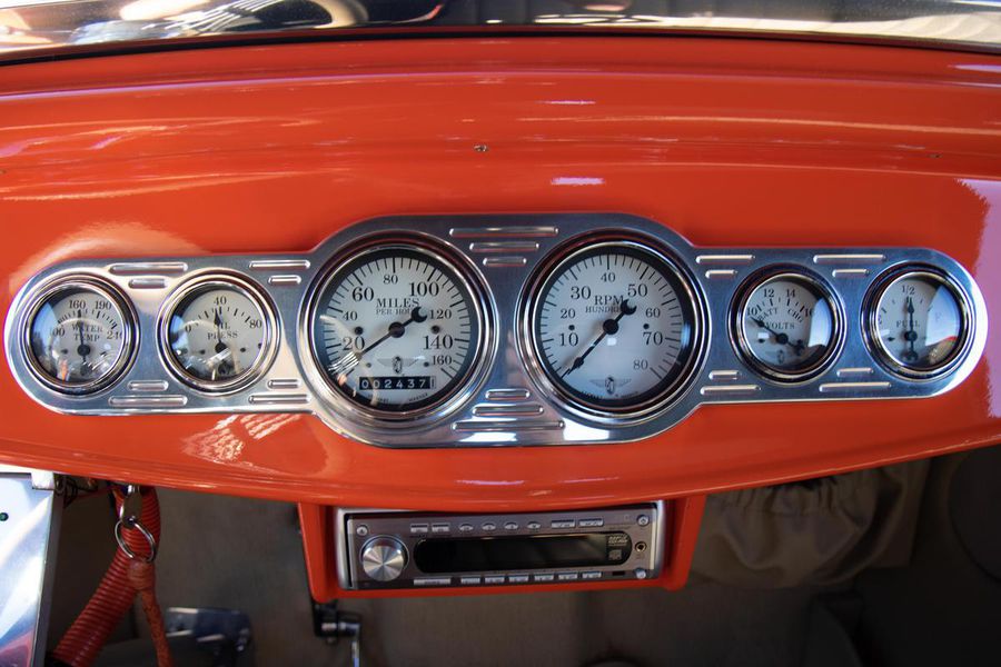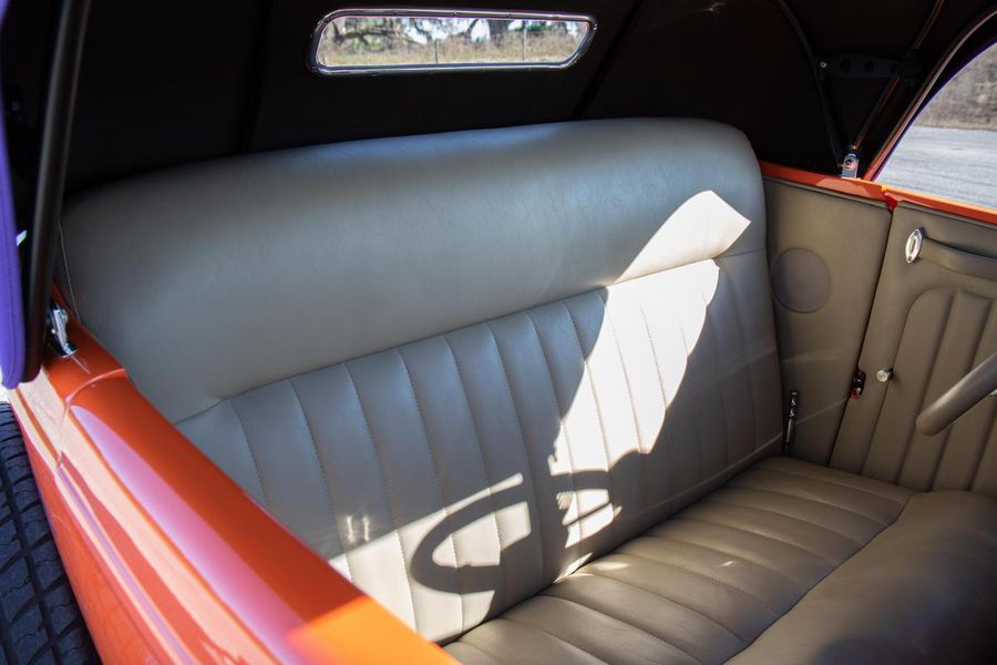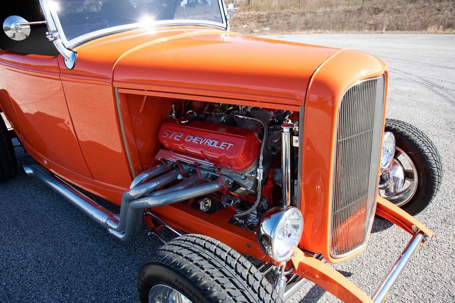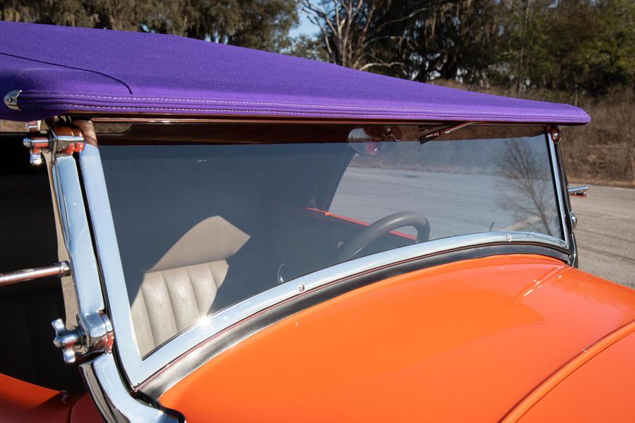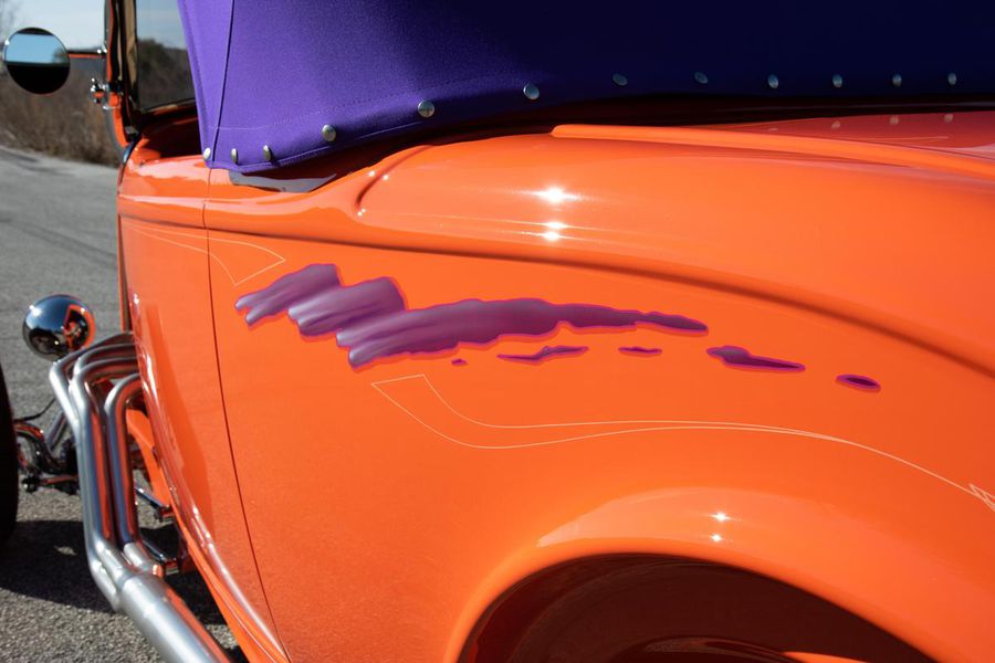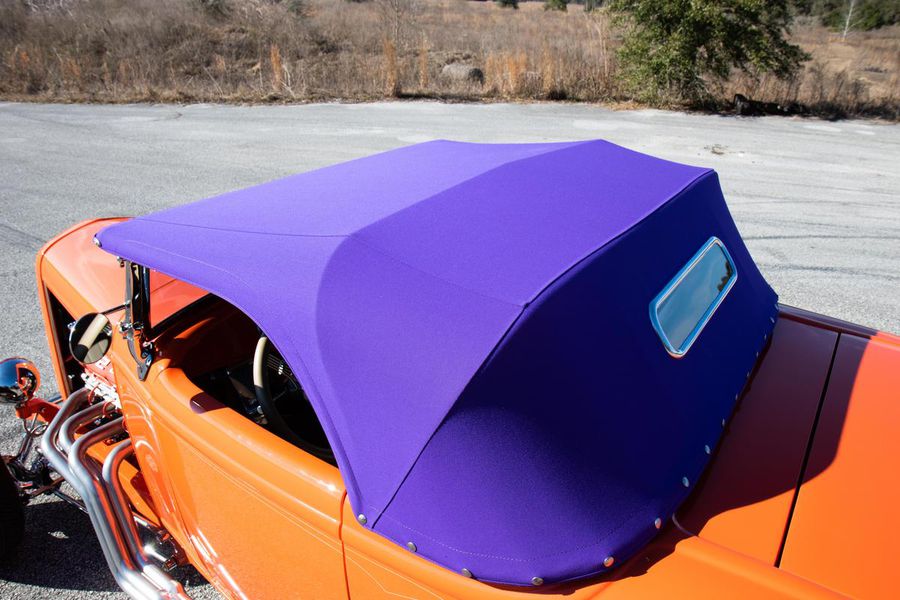 Starting with custom 1932 Ford frame rails, the chassis received a TCI 4 bar dropped tube axle, 9″ Ford Currie rear axle with 3.00:1 gears, and custom 31 spline axles. Then came the monster….a massive, herculean, 572 cubic inch big block Chevrolet engine from GM Performance division making 620 horsepower at 5000rpm and a whopping, earth spinning, 650lb ft. of torque. This cast iron beast was topped with a Demon carburetor, bolted to a professionally built GM Turbo 400 automatic transmission with a 2000rpm stall converter and heavy duty shift kit, then stuffed down between the front frame rails. Power disc brakes in front and drums in back do an excellent job at hauling this animal down from speed in a hurry. Definitely a necessity when you are wielding this kind of power in such a lite weight chassis. A custom AFCO aluminum heavy duty radiator keeps all these rampaging horses cool while the custom Sanderson headers and side pipes make sure you hear each horsepower clearly! This automotive art work chassis was painted to match the body and then covered with a fiberglass Hi-Boy Roadster body by Show Me Rod and Custom. This sleek body was finished in an attention grabbing Dupont orange basecoat/clearcoat paint and polished to perfection. It is literally as smooth as glass, and shines as though it is a mile deep. Finished off with a beautiful purple cloth “Bop Top” convertible top and offset 15X6″ and 15×10″ Polished American Racing Torq-Thrust II wheels wrapped in Hoosier Pro Street tires that cannot hope to maintain traction when the loud pedal goes down. The inside of this classic Ford is a very nice place to spend some time with soft leather bench seating surfaces, Stewart Warner white face gauges in a billet aluminum panel, polished “Ididit” tilt steering column, Lokar floor shifter, and a custom sound system courtesy of JVC/Cadence.