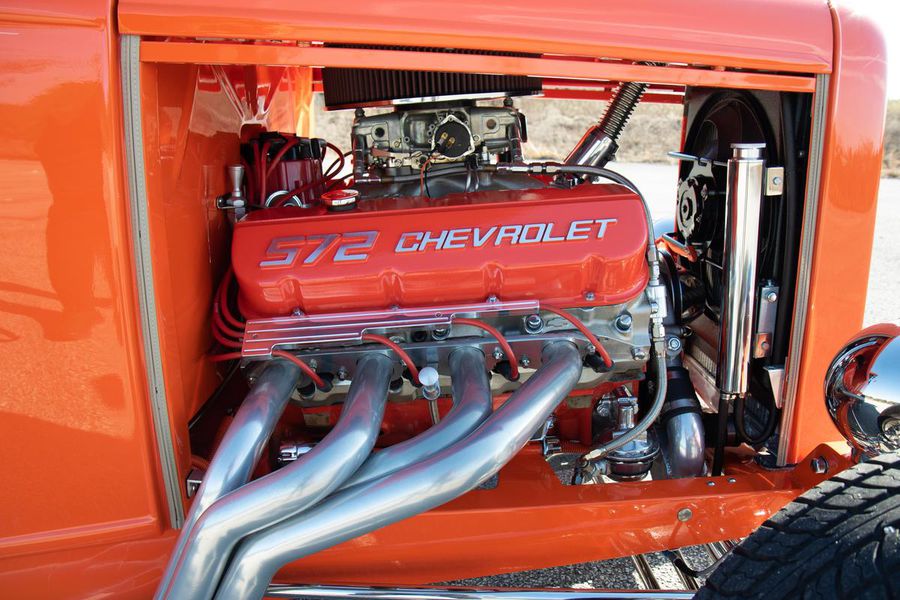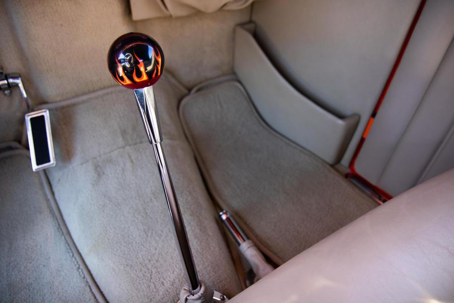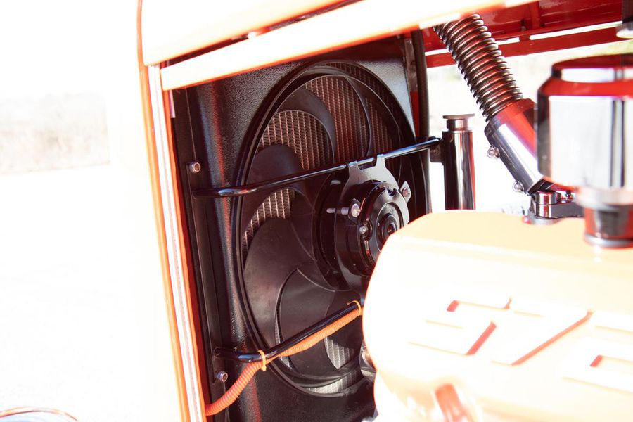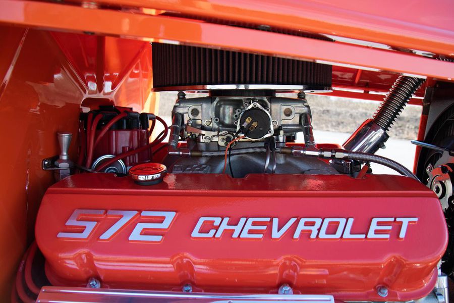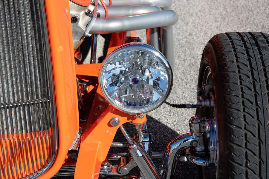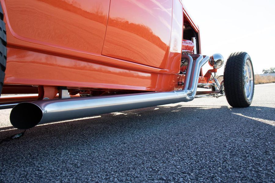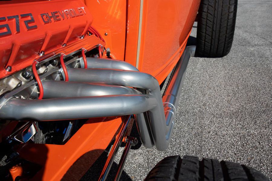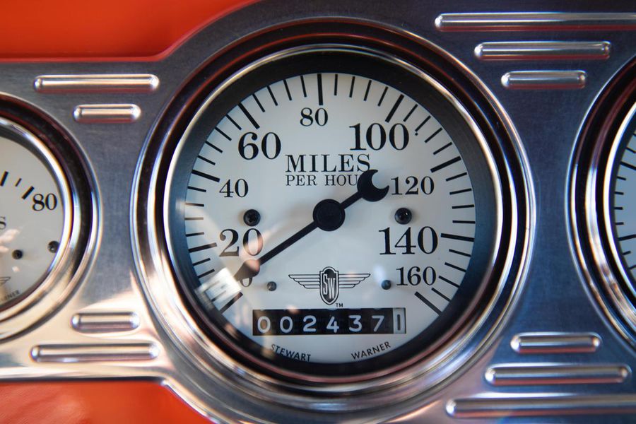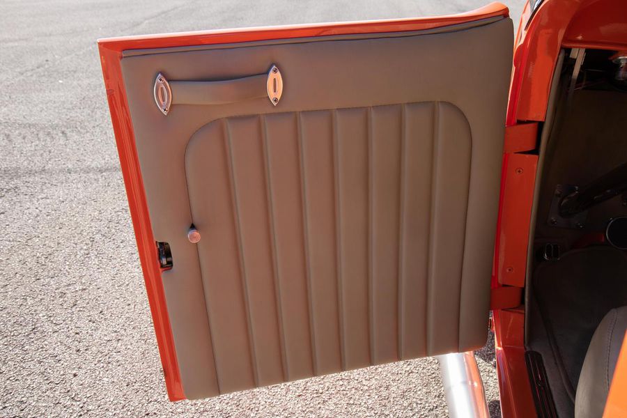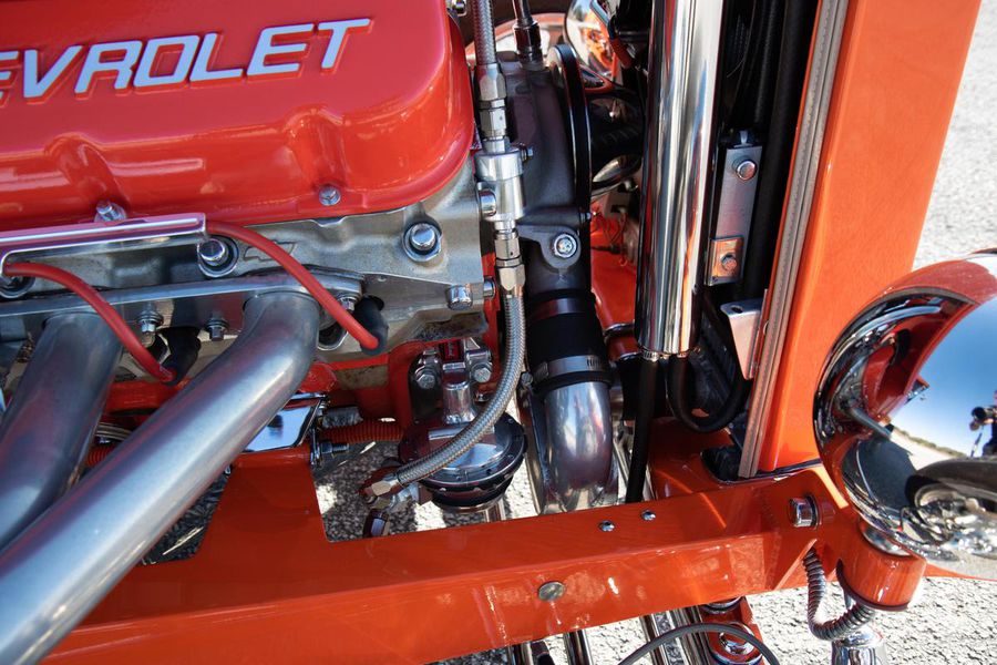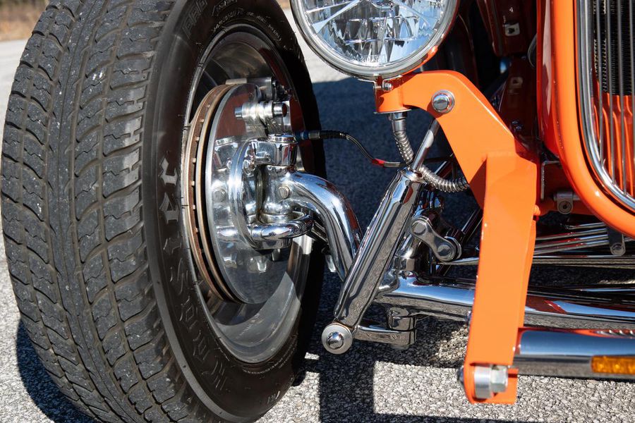 Starting with custom 1932 Ford frame rails, the chassis received a TCI 4 bar dropped tube axle, 9″ Ford Currie rear axle with 3.00:1 gears, and custom 31 spline axles. Then came the monster….a massive, herculean, 572 cubic inch big block Chevrolet engine from GM Performance division making 620 horsepower at 5000rpm and a whopping, earth spinning, 650lb ft. of torque. This cast iron beast was topped with a Demon carburetor, bolted to a professionally built GM Turbo 400 automatic transmission with a 2000rpm stall converter and heavy duty shift kit, then stuffed down between the front frame rails. Power disc brakes in front and drums in back do an excellent job at hauling this animal down from speed in a hurry. Definitely a necessity when you are wielding this kind of power in such a lite weight chassis. A custom AFCO aluminum heavy duty radiator keeps all these rampaging horses cool while the custom Sanderson headers and side pipes make sure you hear each horsepower clearly! This automotive art work chassis was painted to match the body and then covered with a fiberglass Hi-Boy Roadster body by Show Me Rod and Custom. This sleek body was finished in an attention grabbing Dupont orange basecoat/clearcoat paint and polished to perfection. It is literally as smooth as glass, and shines as though it is a mile deep. Finished off with a beautiful purple cloth “Bop Top” convertible top and offset 15X6″ and 15×10″ Polished American Racing Torq-Thrust II wheels wrapped in Hoosier Pro Street tires that cannot hope to maintain traction when the loud pedal goes down. The inside of this classic Ford is a very nice place to spend some time with soft leather bench seating surfaces, Stewart Warner white face gauges in a billet aluminum panel, polished “Ididit” tilt steering column, Lokar floor shifter, and a custom sound system courtesy of JVC/Cadence.