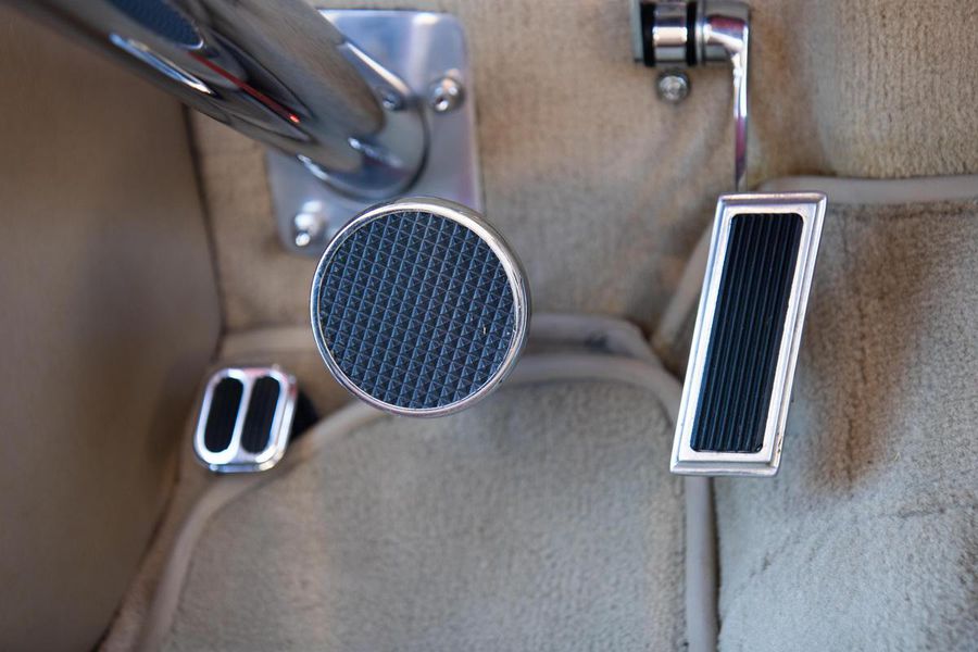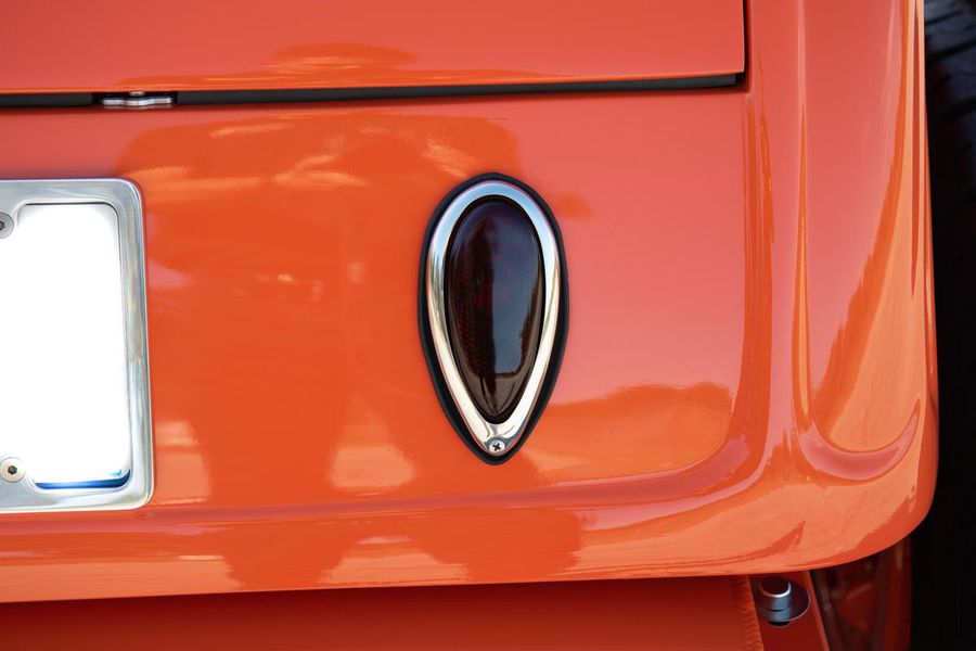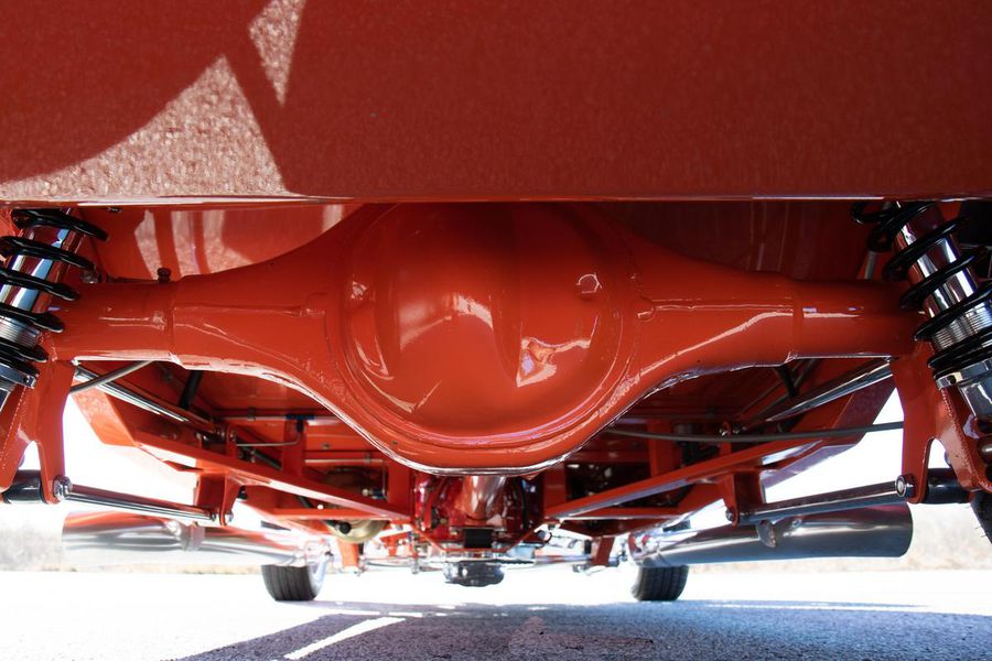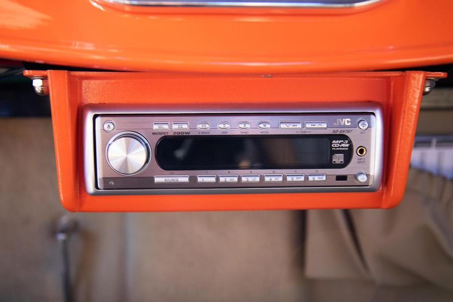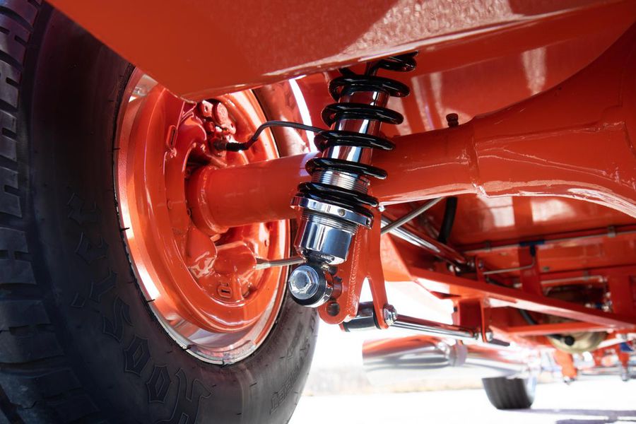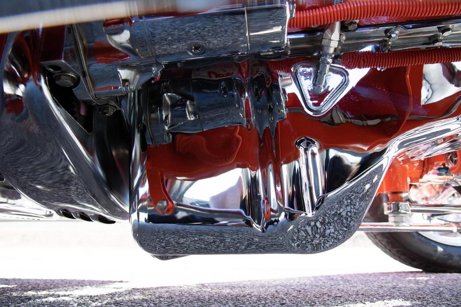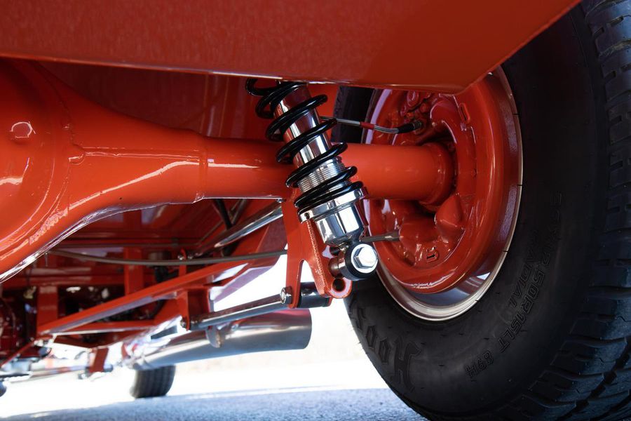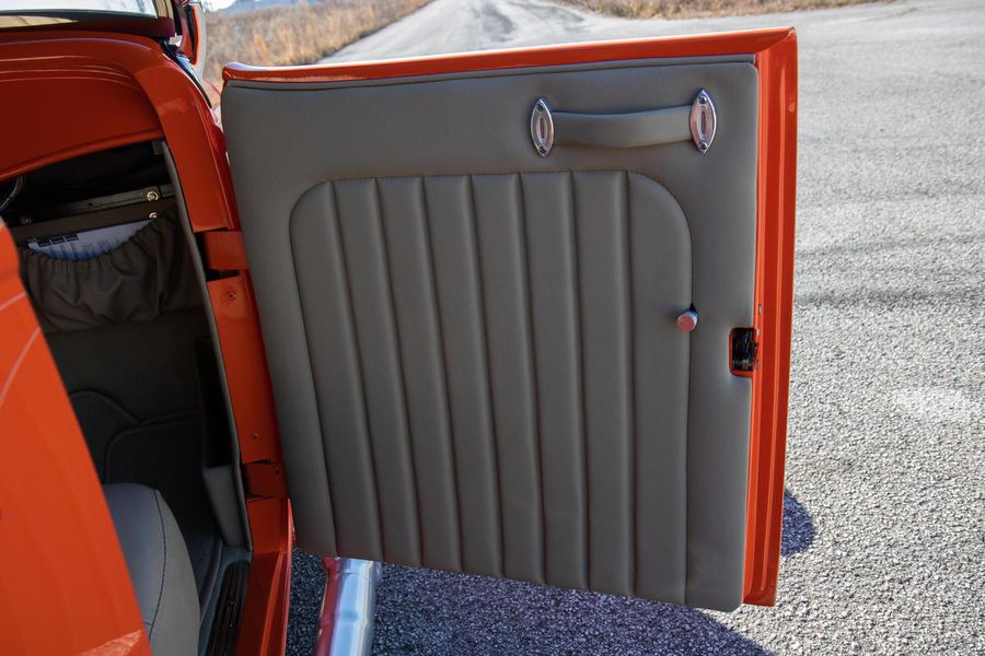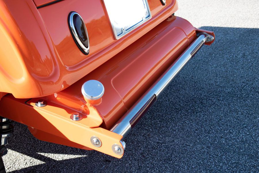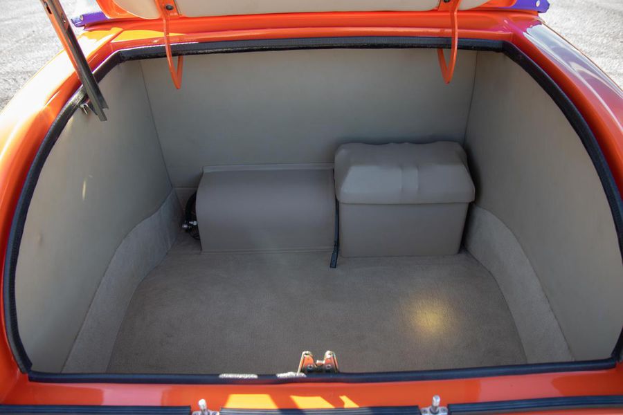 Starting with custom 1932 Ford frame rails, the chassis received a TCI 4 bar dropped tube axle, 9″ Ford Currie rear axle with 3.00:1 gears, and custom 31 spline axles. Then came the monster….a massive, herculean, 572 cubic inch big block Chevrolet engine from GM Performance division making 620 horsepower at 5000rpm and a whopping, earth spinning, 650lb ft. of torque. This cast iron beast was topped with a Demon carburetor, bolted to a professionally built GM Turbo 400 automatic transmission with a 2000rpm stall converter and heavy duty shift kit, then stuffed down between the front frame rails. Power disc brakes in front and drums in back do an excellent job at hauling this animal down from speed in a hurry. Definitely a necessity when you are wielding this kind of power in such a lite weight chassis. A custom AFCO aluminum heavy duty radiator keeps all these rampaging horses cool while the custom Sanderson headers and side pipes make sure you hear each horsepower clearly! This automotive art work chassis was painted to match the body and then covered with a fiberglass Hi-Boy Roadster body by Show Me Rod and Custom. This sleek body was finished in an attention grabbing Dupont orange basecoat/clearcoat paint and polished to perfection. It is literally as smooth as glass, and shines as though it is a mile deep. Finished off with a beautiful purple cloth “Bop Top” convertible top and offset 15X6″ and 15×10″ Polished American Racing Torq-Thrust II wheels wrapped in Hoosier Pro Street tires that cannot hope to maintain traction when the loud pedal goes down. The inside of this classic Ford is a very nice place to spend some time with soft leather bench seating surfaces, Stewart Warner white face gauges in a billet aluminum panel, polished “Ididit” tilt steering column, Lokar floor shifter, and a custom sound system courtesy of JVC/Cadence.