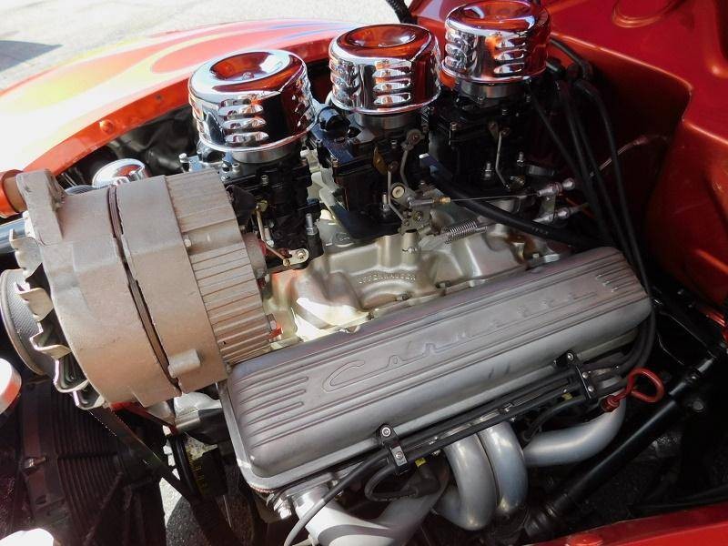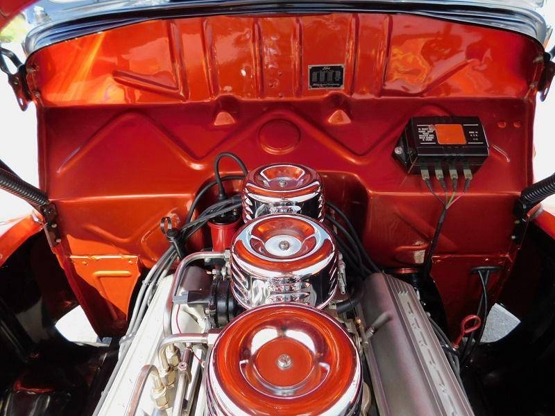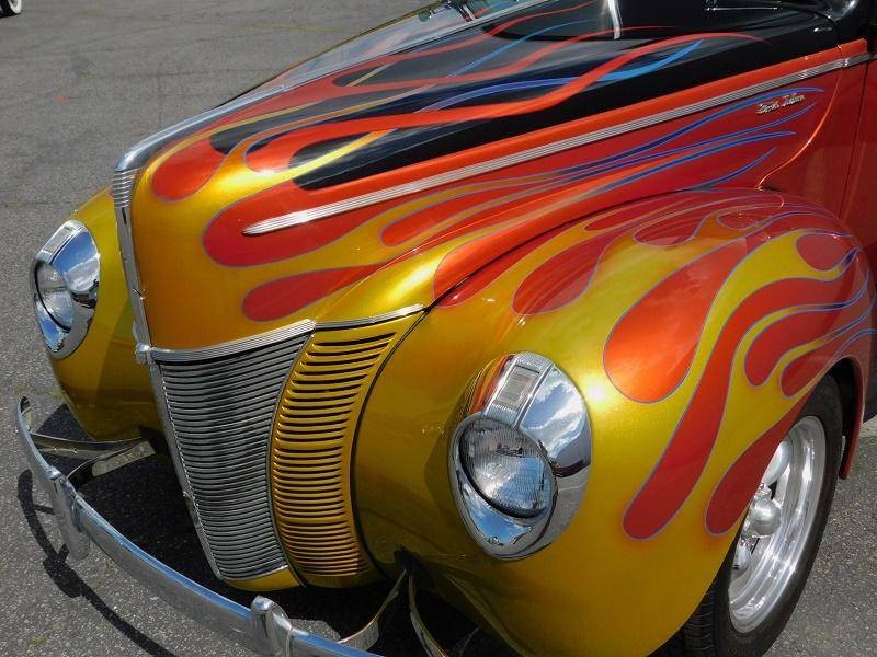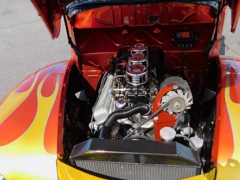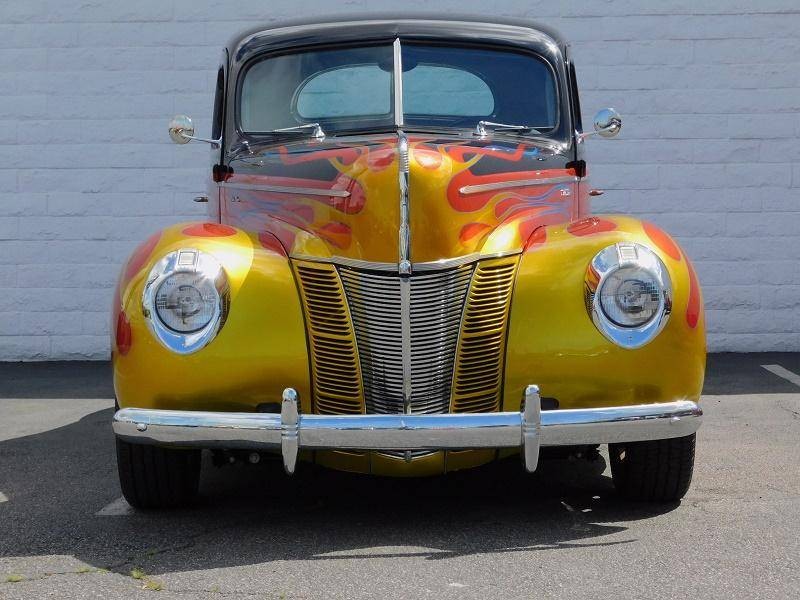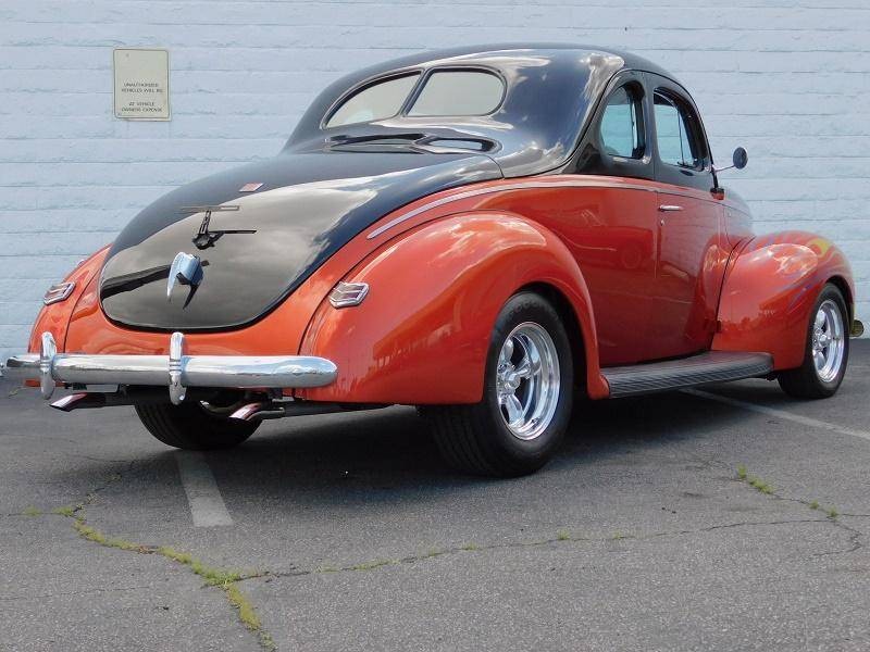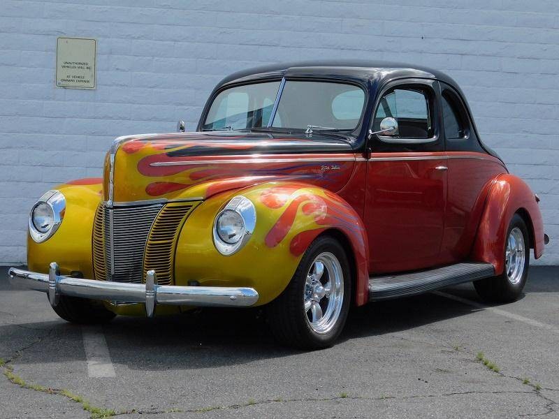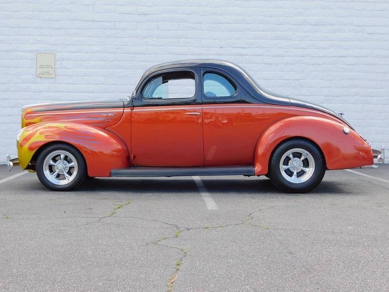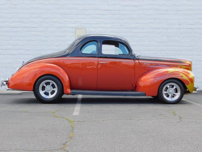 You are looking at a restored custom 1940 Ford Coupe hotrod. This restoration is not recent and has been done sometime around 2005 and comes with receipts of many upgraded parts including suspension upgrades. This quality build not only looks good but drives great with a Chevrolet 350 V8 that is connected to a Turbo Hydro 350 automatic rebuilt transmission. It also features triple Roschester carburetors, headers, camel hump heads, Mallory electronic distributor, custom brass radiator, and an MSD coil under the hood. The interior is in excellent condition and comes in two tone gray velour throughout, including the rear seat cover, and headliner. The Black dash features a custom gauge cluster done very nicely out of billet aluminum filled with VDO gauges, and also features its original steering wheel and a Sun tachometer. Other interior features include a kill switch, and custom pull start ignition. The custom two-tone Sun burnt Orange and Black exterior paint with flames up front is loud and aggressive and suites the hotrod style-build. Other exterior features include original style running boards, dual exhaust, and iconic a split rear window. This 40 sits on polished American Racing 5 spoke wheels that are wrapped in 235/70/15 BFGoodrich Radial T/A tires in the rear and 195/60/15 upfront and are stopped by disc brakes upfront and drum in the rear.