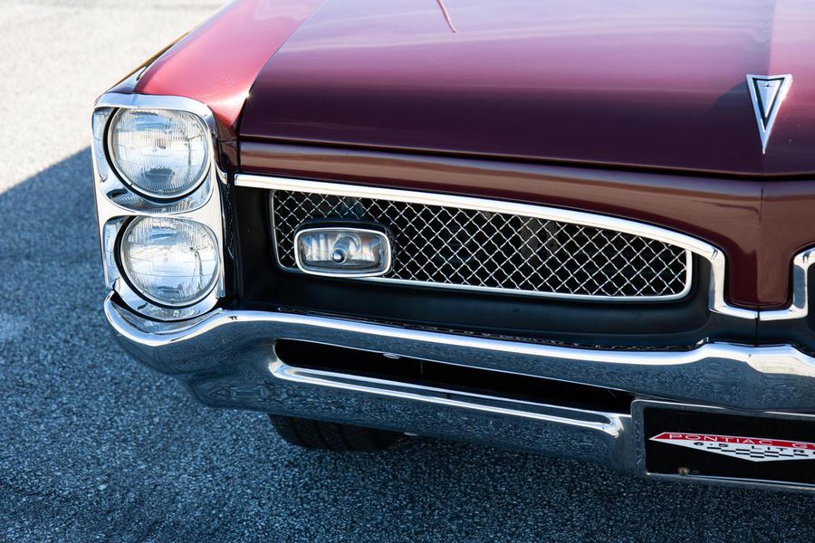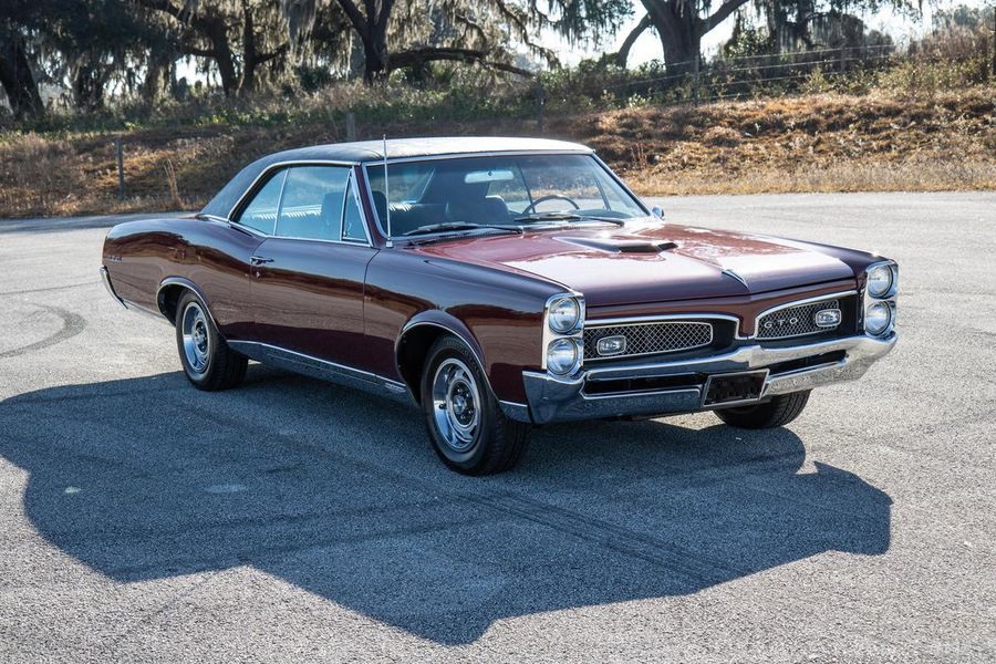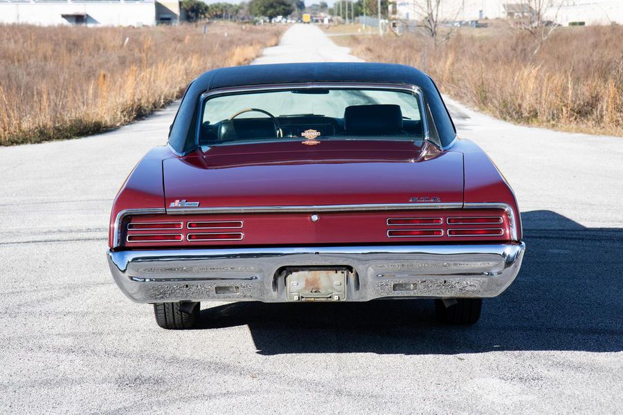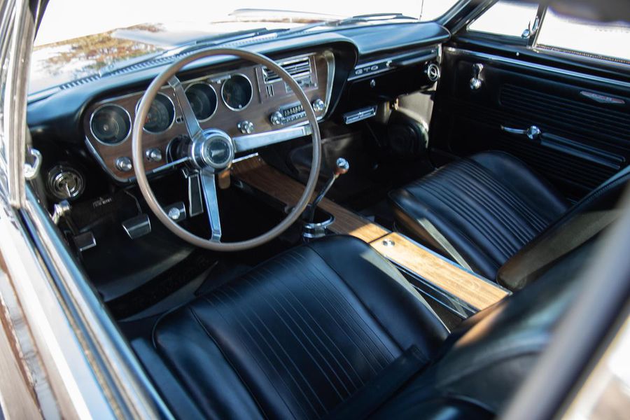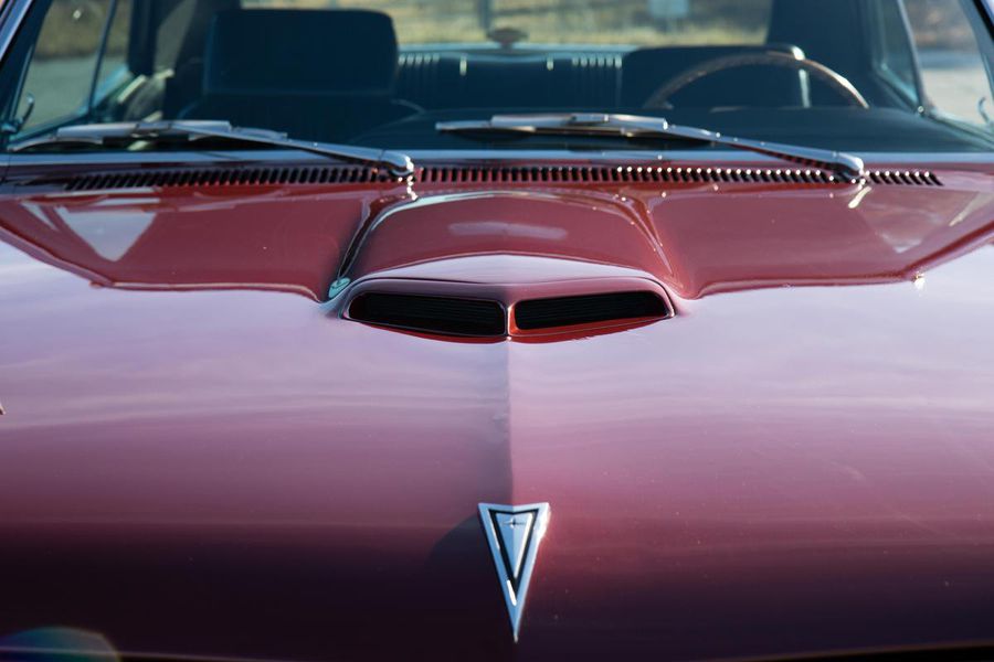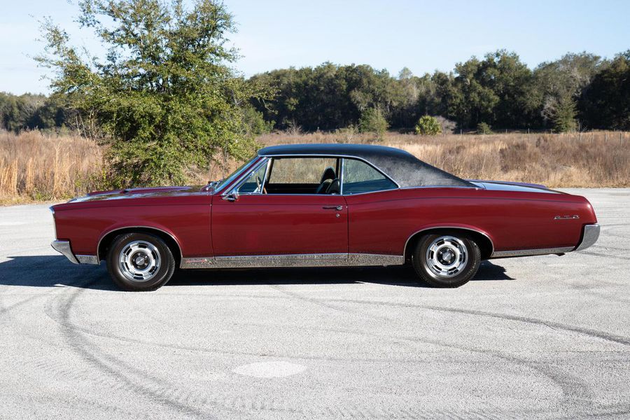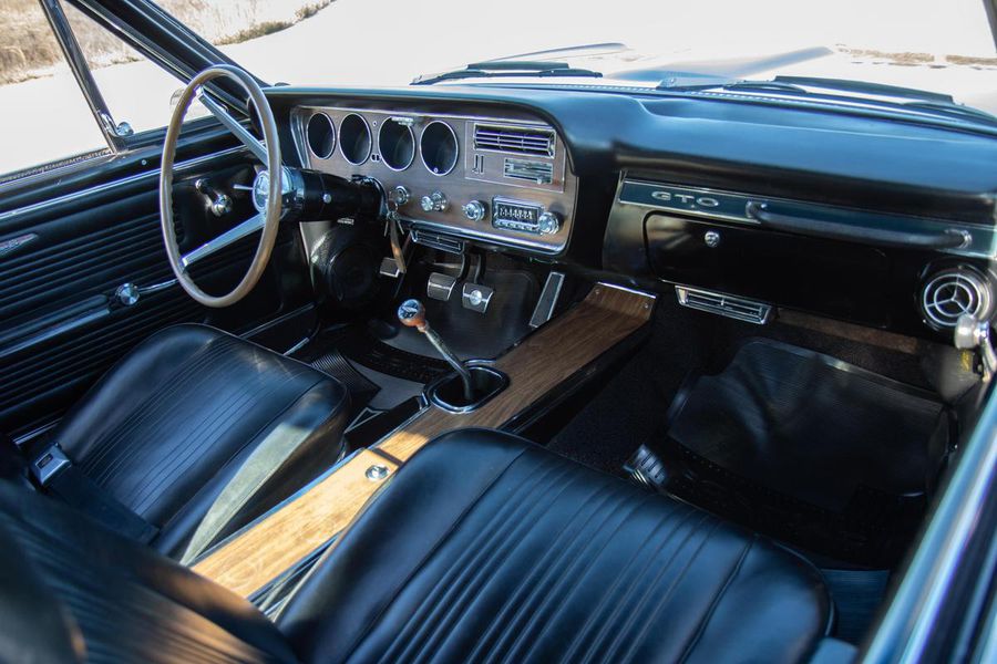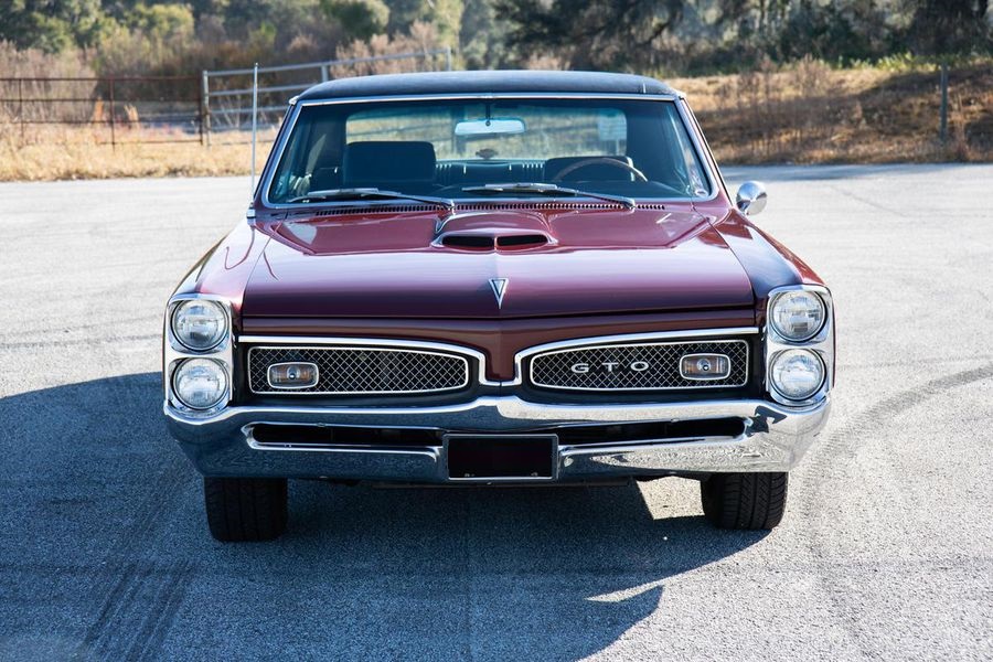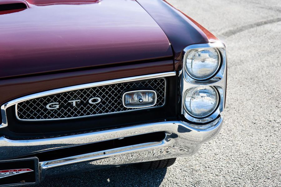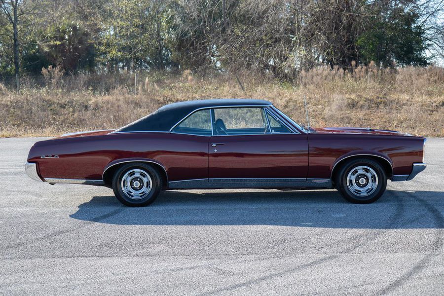 This gorgeous and well optioned example of the breed is a perfect sample of what makes these cars so amazing to own, drive, and collect. Finished in it’s original and rather lovely color of code “N” Burgundy with the black Cordova vinyl top, this GTO has a look that is at once classy and sporty, with a timeless appeal. The body was taken down to bare metal and refinished in modern basecoat/clearcoat paint, while the original vinyl roof was refinished in the correct materials. The paint is around eight years old at this time and shows some flaws, but they do not take away from the presence this car has. All chrome and stainless moldings are in excellent condition, while the “Soft Ray” factory tinted glass is in very good condition with minor scratches on the rear windshield. The front windshield is a newer replacement and crystal clear. The factory date code correct 14x6J 6 hole Pontiac steel wheels with chrome trim rings and caps are wrapped in modern Uniroyal Tiger Paw radial tires that give this GTO a boulevard ride that engineers could only dream of back in the 60’s. The interior of this classic goat is original and in excellent condition. It is unrestored with only the carpets having been replaced. It is a very comfortable place to be with wide bucket seats, simulated walnut wood grain trim and steering wheel, full length center console, full instrumentation, seat belts, AM/FM Bluetooth sound system from RetroSound with “Verba-Phonic” rear speaker, and that most important and desirable muscle car option, factory A/C! The factory original AM radio is included with purchase. Under the hood is where the magic happens, and under this hood beats the heart of a tiger! This heavy duty performance engine features flat top pistons with valve reliefs, high performance cam with hydraulic lifters and HD valve springs, 2.11″ intake and 1.77″ exhaust valves in high flow cast iron heads, with a low restriction air cleaner and dual exhausts to get the air in and out as quickly and efficiently as possible. This engine was recently completely rebuilt, align honed, balanced and blue printed, and has only approximately 1000 road miles since it was completed. It fires at a simple twist of the key and idles with a turbine like smoothness. This powerhouse is mated to a sweet shifting, fully synchronized “W” code wide ratio 4-speed manual transmission and hands power back to a retro-fitted 12-bolt GM axle with 3.23 gears and Posi-traction. Optional front disc brakes work in conjunction with the rear drum brakes to help bring you back to normal speeds when things get a little out of hand, while the smooth ride of a full frame car with power steering make this GTO an absolute joy to drive mile after mile.