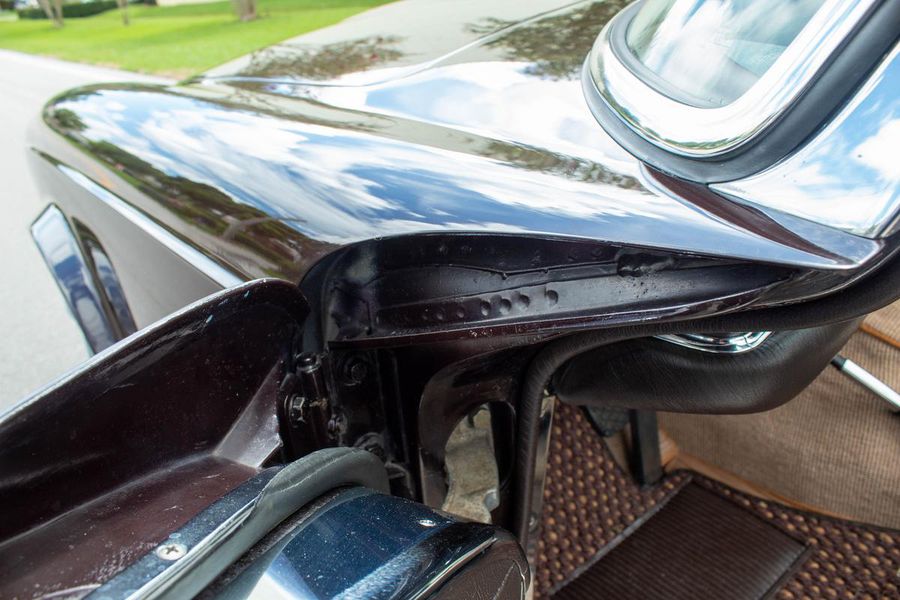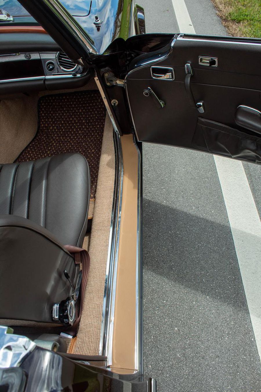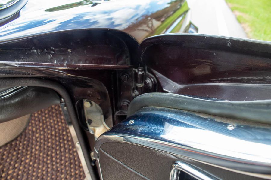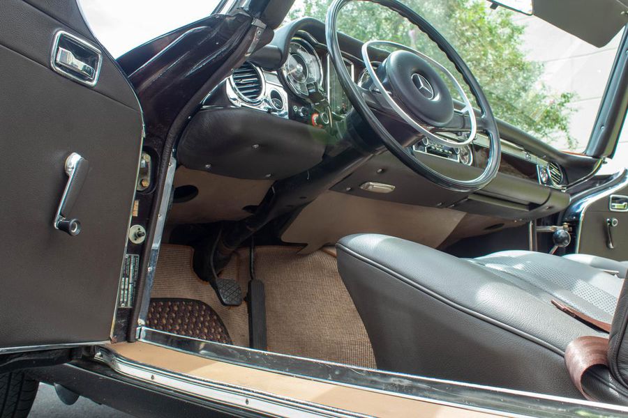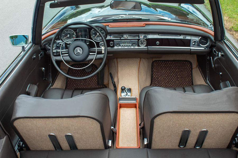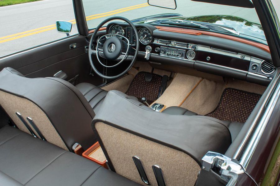 1968 Mercedes-Benz 250sl California Coupe in 450G “Dark Maroon” with Dark Brown leather interior. 64501 original miles based on its history. The paint shows wonderfully well with excellent integrity. Interior was completely redone less than a year ago with new loop carpeting, leather upholstery and new wood trim. New seatbelts and sun visors were added in June of this year. The car comes with new Coco mats and a second pair of plush carpets, also new. Tool kit is complete and still has original spare tire. Engine bay has been kept original with all the components working as they should. Current on all services and maintenance including new brakes and tires. Engine is strong with excellent compression. Transmission shifts smoothly up and down, including last down shift that is rough on most pagodas if they have the venturi out of adjustment. Zero rust and no previous bodywork with all original weld points and bodystyle markings. Car comes with original books.