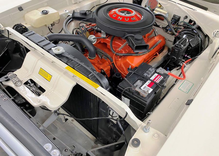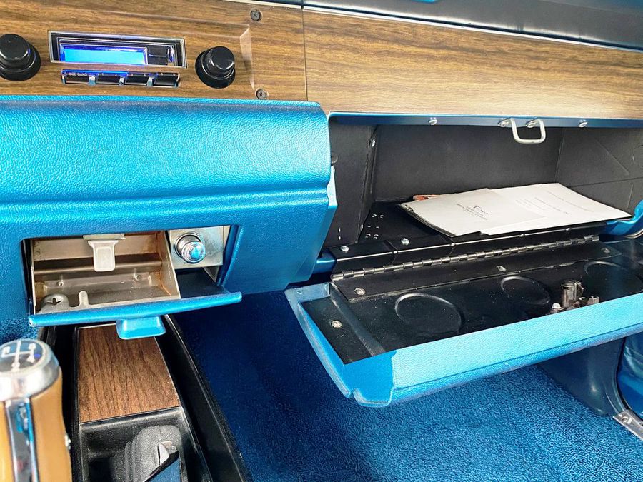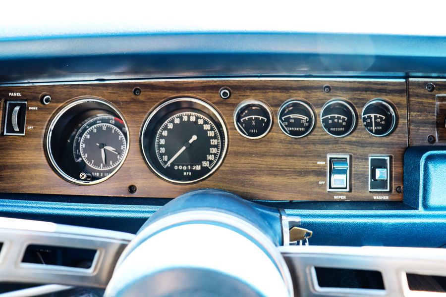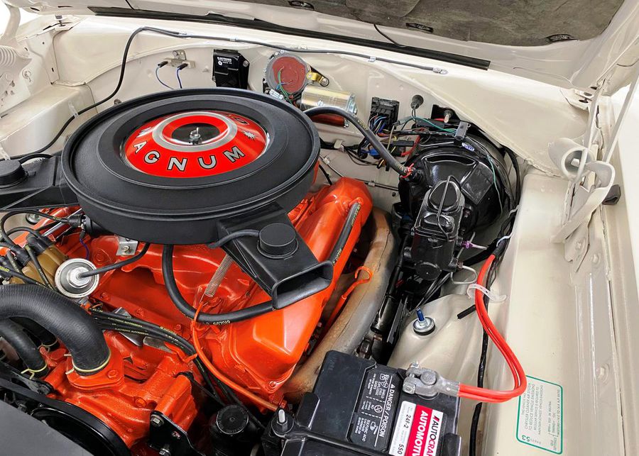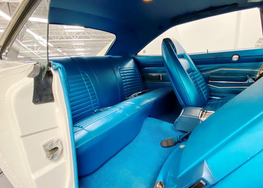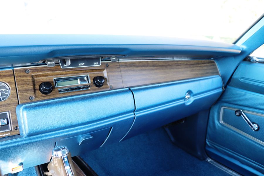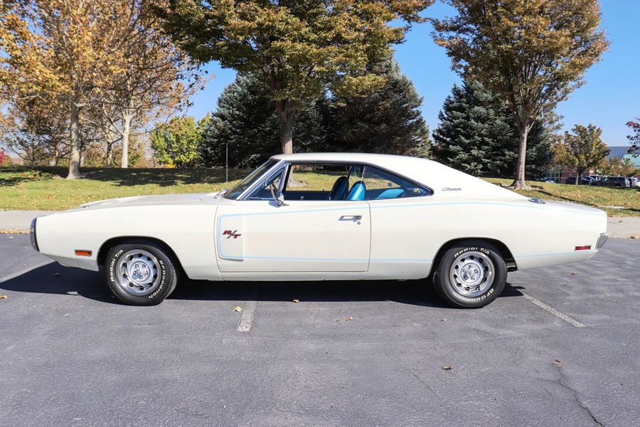 This 1970 Dodge Charger R/T is an all matching numbers 440 V8 4-speed manual and Super Track Pak car. This Charger R/T is documented with the original broadcast sheet, and consumer information sheet. This R/T was built from the factory with the 440 Magnum V8, four-barrel carburator and dual exhaust. It was also equipped with the R/T suspension package, heavy-duty brakes, and longitudinal stripe. Its unique EW1 white exterior, B5 blue interior, and longitudinal blue stripe dramatically contrast with each other and make this R/T very unique. Only 394 (4.2%) of the Chargers were built with the A34 Super Track Pak. The Super Track Pak car includes a upgraded 4.10:1 gear ratio, 9.75″ Dana 60 axle with Sure Grip, 7 blade torque drive fan, 26″ high performance radiator with fan shroud, and power disc brakes. This authentic, numbers matching, fully documented Charger R/T has just completed a 3 year detailed professional restoration by Dave Rea of DB Restorations. Its 440 cubic inch High Performance 375 hp V8 and 4-speed manual transmission have also been completely rebuilt and run flawlessly. The interior has been finished in correct B5 blue with bucket seats and a factory console. All gauges have been restored to factory specifications, including the rare Tic-Toc-Tachometer option.