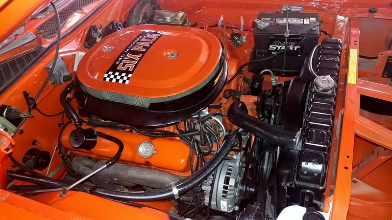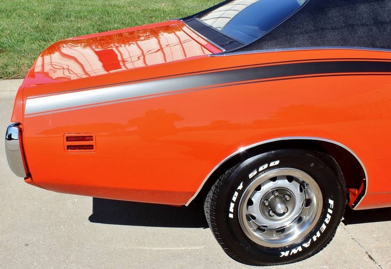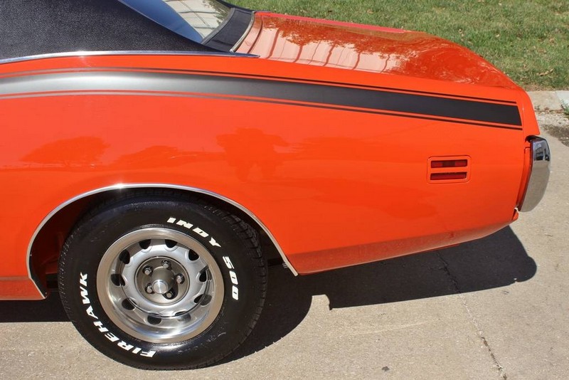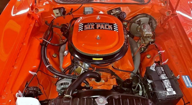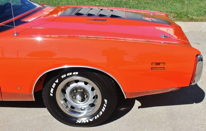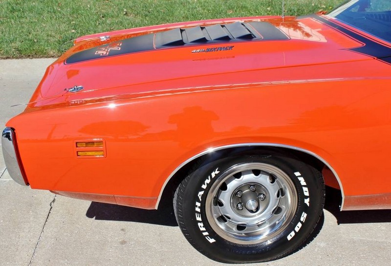 This 1971 Dodger Charger R/T V code 440-six pack is in outstanding condition and runs as good as it looks. It comes with the numbers matching 440 Six Pack mated to a numbers matching 727 automatic transmission, both of which were rebuilt. All that power is put to the ground through the optional A34 Super Track Pack giving it the 9.75in Dana rear end with 4.10 gears. 15×7 Rally wheels. Fully restored numbers matching with build sheet, owner history. 1 of only 178 built, only about 5 Hemi Orange cars and only 2 in Automatic. This car has spectacular paint with a fit and finish is near perfect. Bottom as pretty as the top. Miles are actual!