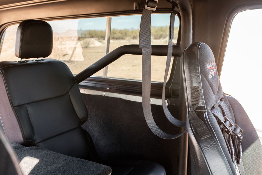 This completely restored build has been gone through from the ground up with less than 500 miles since it was all done. From the frame being blasted then painted, to the whole body being newly painted Summit White. The complete inside of the cab and bed has been re-upholstered with fresh Carpet, New Buckets, and a leather rear 3-Seat bench over a full cab of DynoMat. The plush interior sports a complete set up with comfortability and functionality in mind.