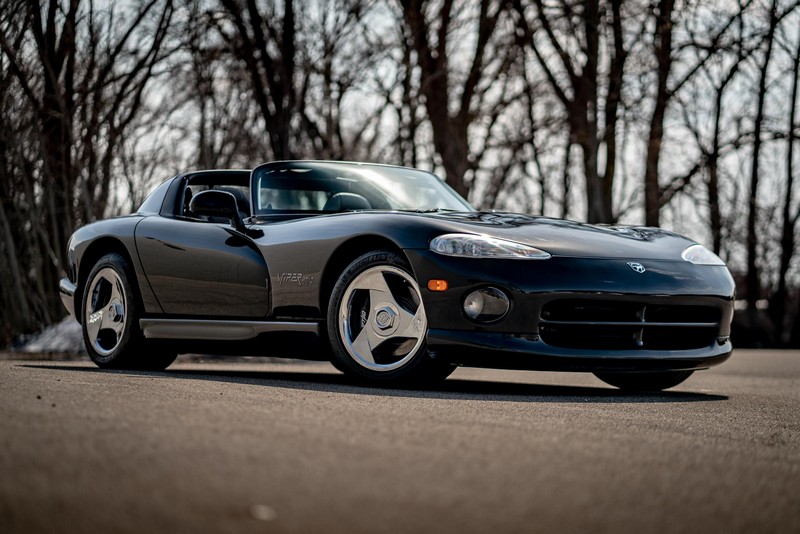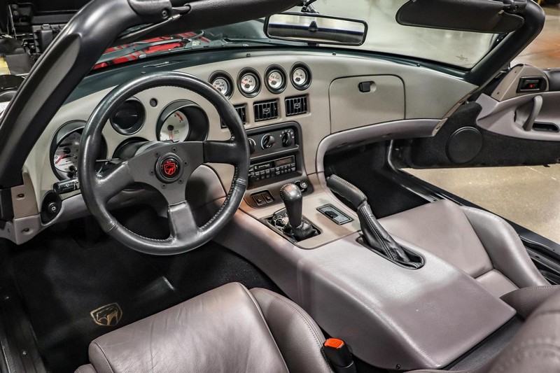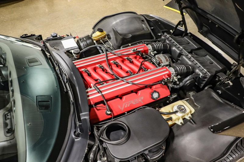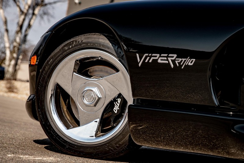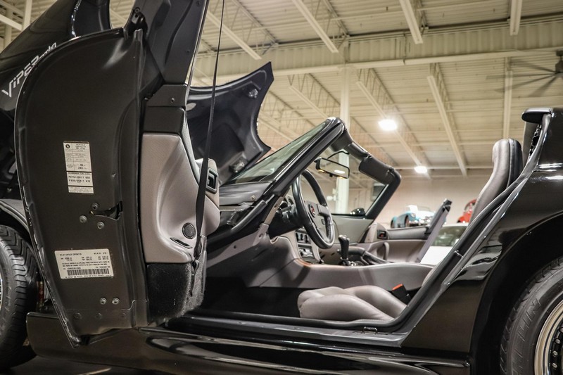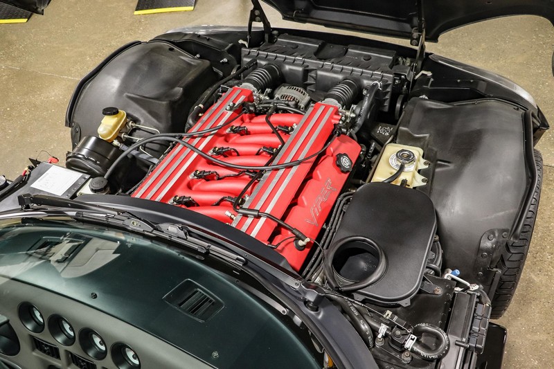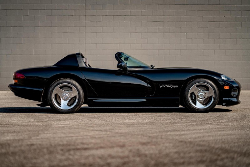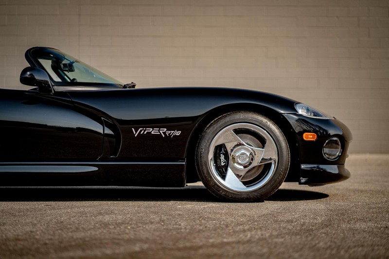 Make:Dodge Model:Viper Mileage:9,700 Engine:8.0L V10 Drivetrain:Rear-wheel drive Transmission:Manual (6-Speed) Body Style:Convertible Exterior Color:Viper Black Interior Color:Black/Grey THIS… is a 1994 Dodge Viper RT/10, finished in Viper Black with a black and grey interior. The attached Carfax vehicle history report shows no accidents in this Viper’s past. Factory equipment includes a limited-slip differential, a removable fabric top and side windows, leather seats with manual adjustment, and an AM/FM/cassette stereo. Power comes from an 8.0-liter V10 engine, rated at 400 horsepower and 465 lb-ft of torque. Output is sent to the rear wheels via a 6-speed manual transmission. Equipment -Limited-slip differential -Removable fabric top -Removable side windows -Leather seats -AM/FM/cassette radio Modifications Modifications reported by the seller include: -18-inch HRE wheels -Aftermarket side skirts -Aftermarket rear-exit exhaust system Known Flaws -Scuff on bottom passenger-side corner of front bumper -Some scuffs and scratches on interior plastics Recent Service History Service documentation in the photo gallery indicates that the following maintenance has been performed: -June 2021 (9,416 miles): Multi-point inspection performed, crankcase cleaning procedure performed, engine oil and filter changed, air filters replaced, power steering fluid changed, brake fluid changed, coolant flushed, rear differential fluid changed, battery replaced, front wiper blades replaced, fuel tank cleaned, 4 tires replaced The selling dealer reports that this Viper received an engine oil and filter change in the Fall of 2021. Other Items Included in Sale -1 set of keys -Owner’s manuals -Factory 17-inch wheels -Tonneau interior cover -Car cover -Parts shown in gallery