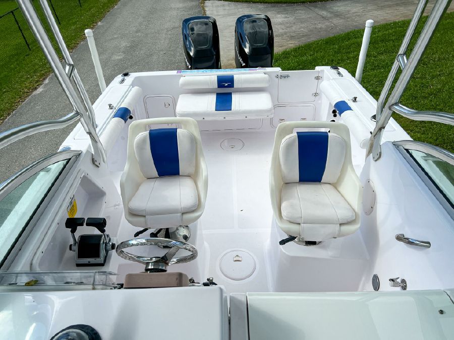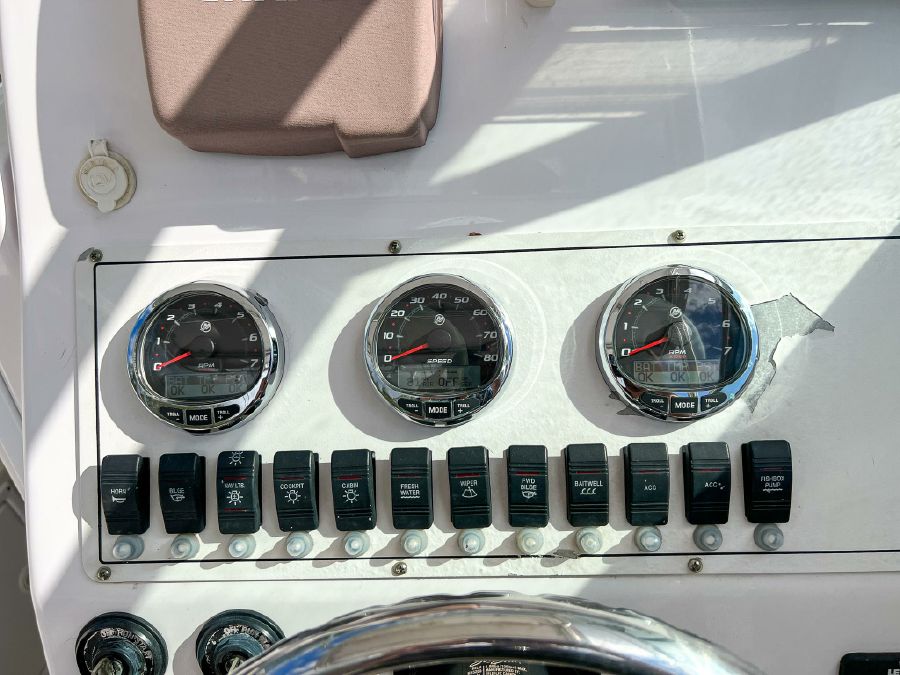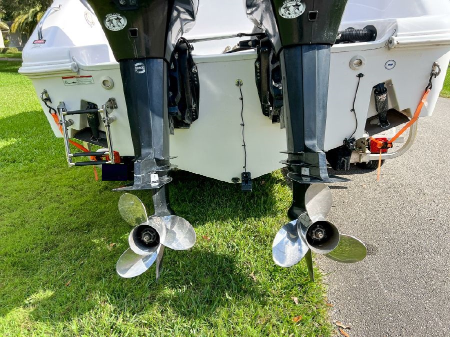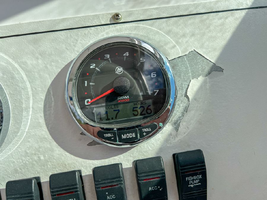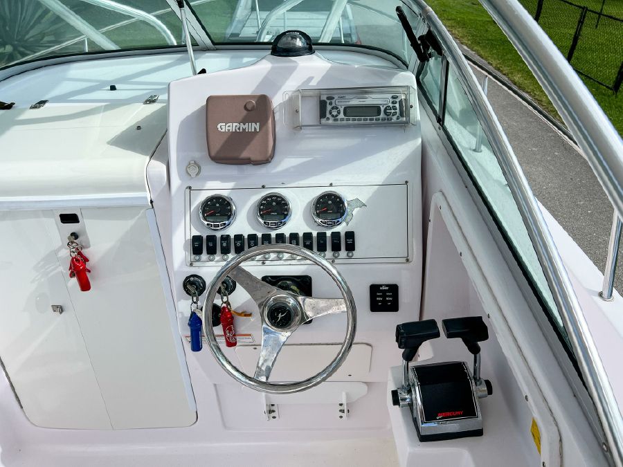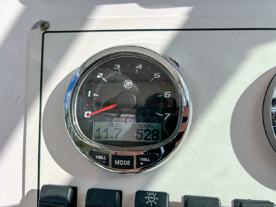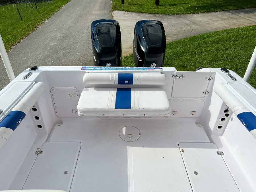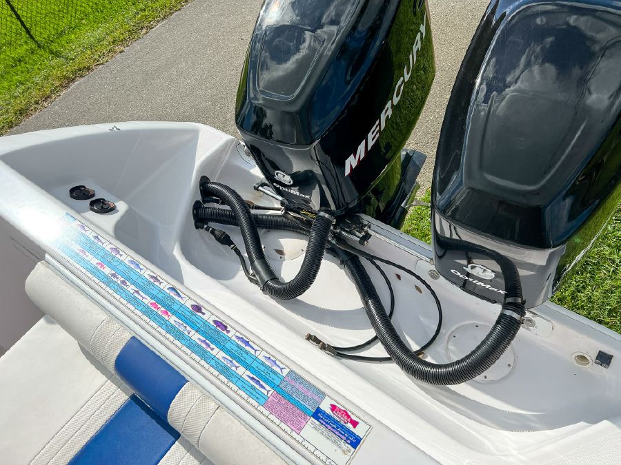 Garmin GPS, Fusion Audio sound system, updated Mercury SmartCraft gauges, Lenco trim tabs, cockpit lights, cabin lights, spreader lights, windlass, swim ladder, baitwell, full boat cover, and Continental tandem axle aluminum trailer included.