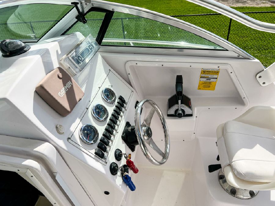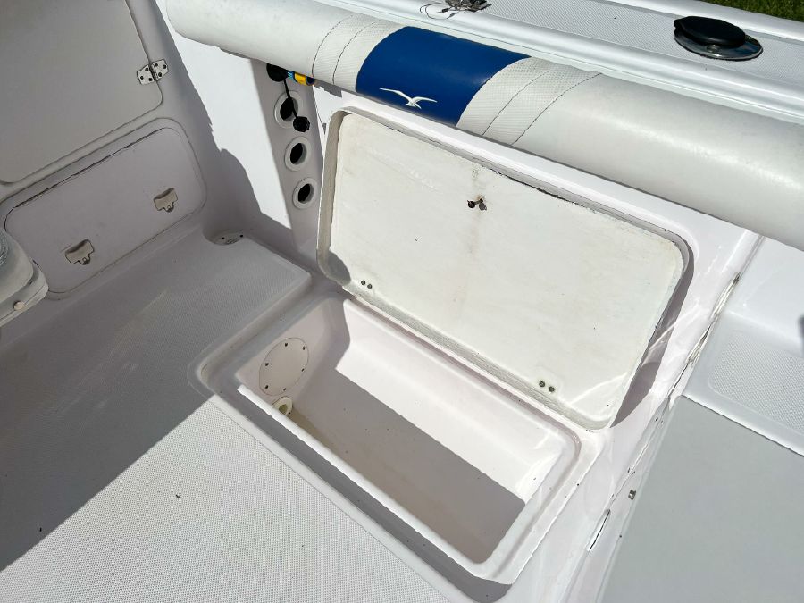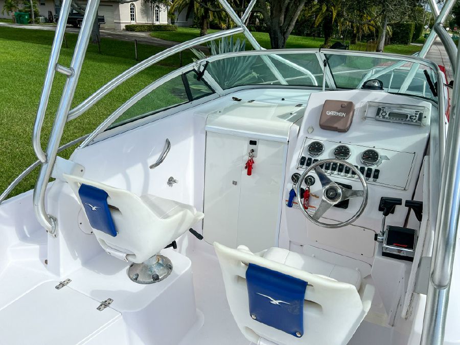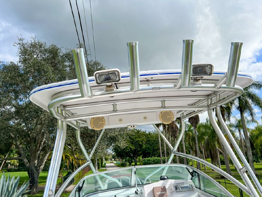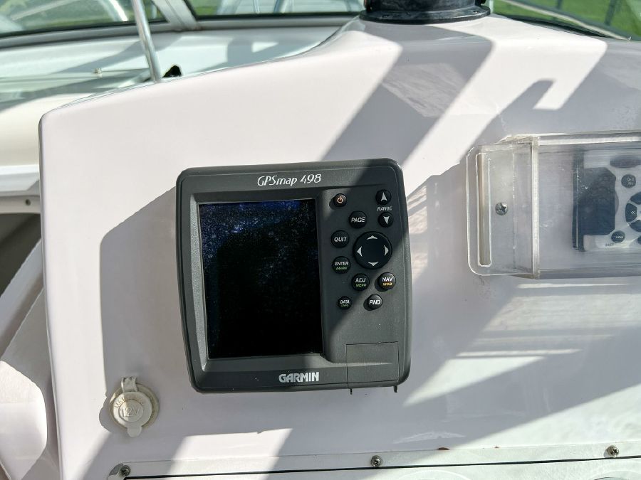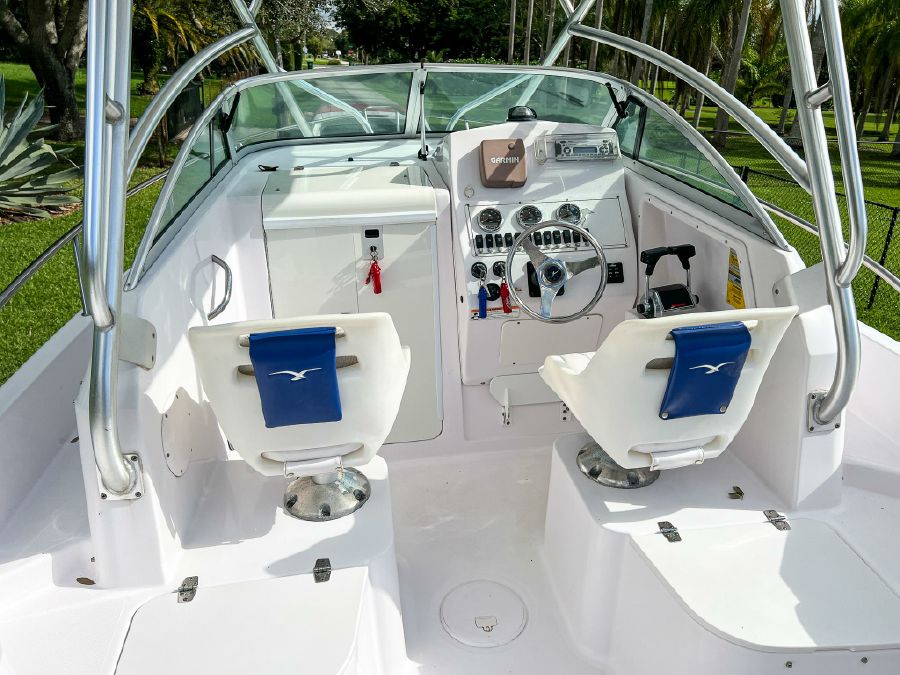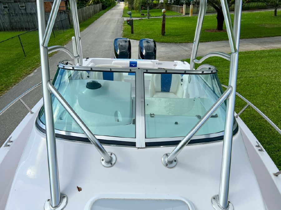 Garmin GPS, Fusion Audio sound system, updated Mercury SmartCraft gauges, Lenco trim tabs, cockpit lights, cabin lights, spreader lights, windlass, swim ladder, baitwell, full boat cover, and Continental tandem axle aluminum trailer included.