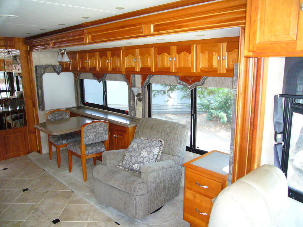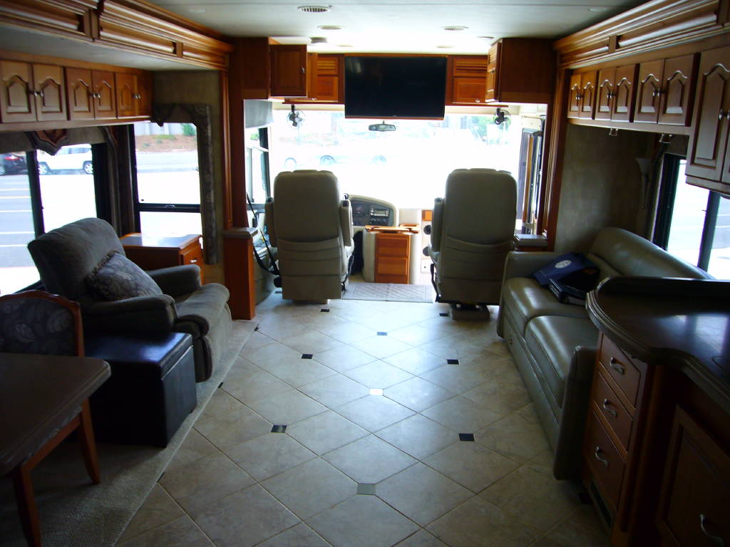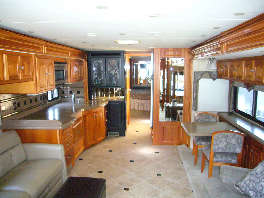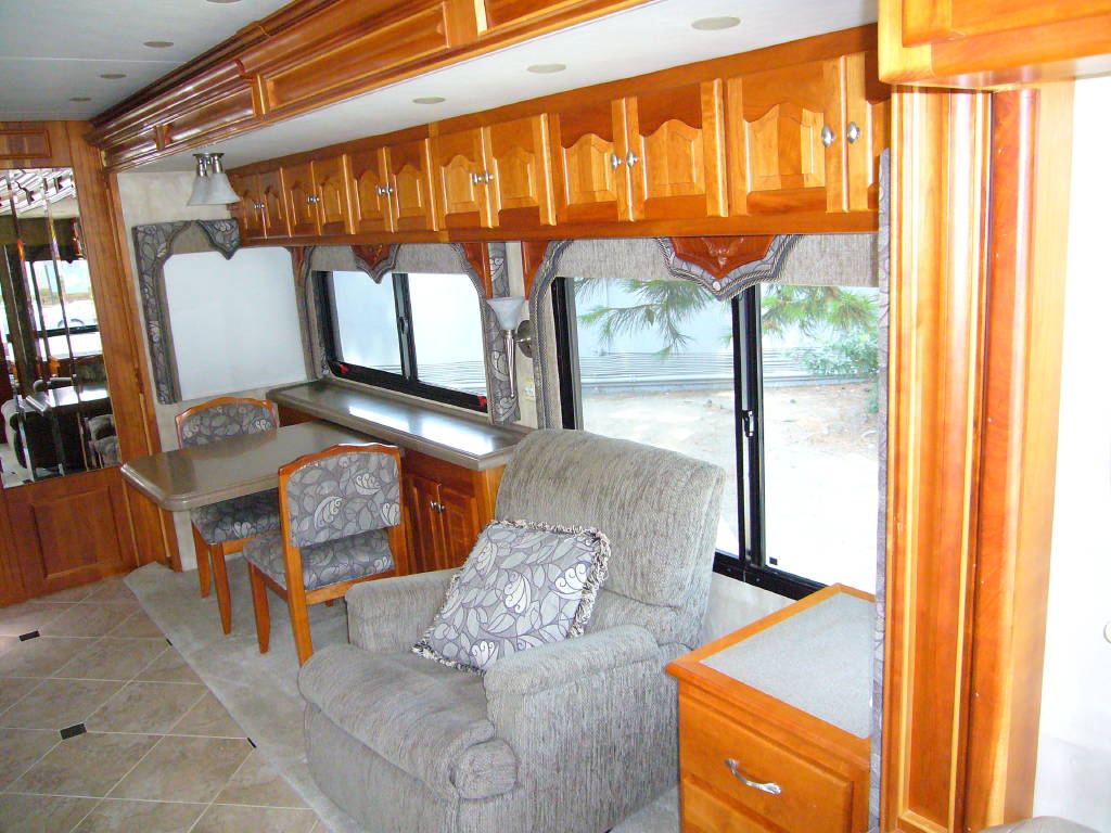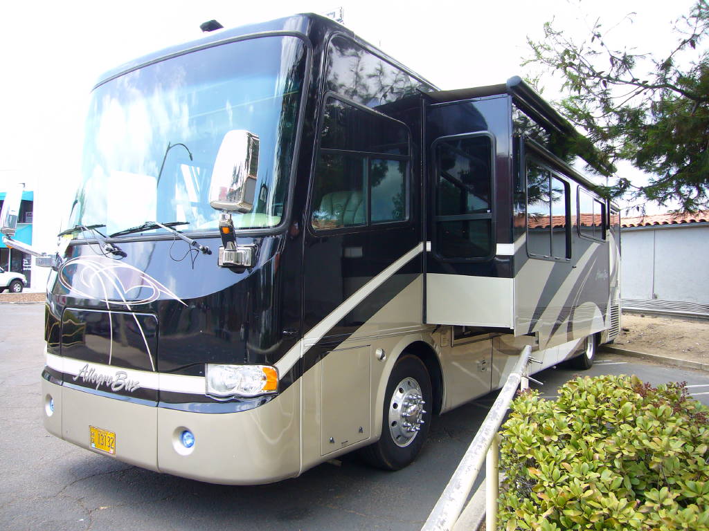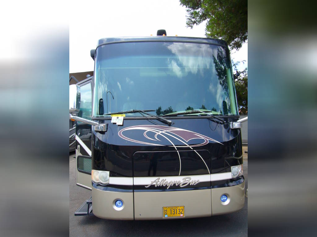 2008 Tiffin Allegro Bus (40QSP) with 4 slides and 64,793 miles and in excellent condition. Solid cherry cabinets with beautiful matching earth tone fabrics. This is the most desired and hardest to find floor plan for this model. The RV is approximately 40′ in length and has a 400 HP ISL Cummins Diesel with side drafted hydraulic cooling with an Allison 3000 6 speed MH transmission on a Spartan chassis with Tutthill Independent Front Suspension with VIP soft touch and smart wheel, 7.5 KW Onan diesel engine on slide just serviced by Cummins, power patio and door awnings, slide-out room toppers, Hydra Unlimited Heat, 50 Amp power cord reel, pass-thru storage, full length slide-out cargo trays, power water hose reel, 10K lb. hitch, automatic hydraulic leveling system, back-up camera with side cameras, Xantrax inverter, ceramic tile floors, solid surface, dual ducted roof A/Cs with heat pumps, kitchen dishwasher and 2 HD TVs and satellite, central vacuum system, stackable washer and dryer, residential Samsung refrigerator freezer with ice maker, upgraded main cabin led bulbs. Front outside screen and wheel covers.. Well maintained and cared for. Chassis and house batteries are one year old. This coach is stunningly beautiful and is an amazing luxury motorhome.
