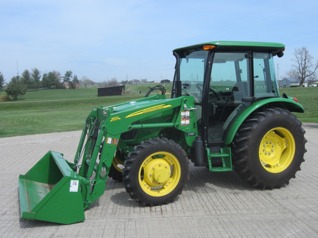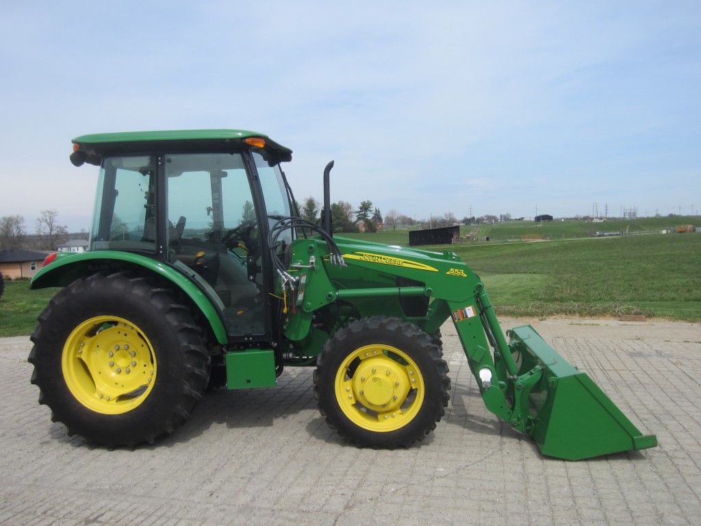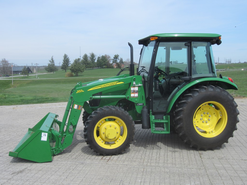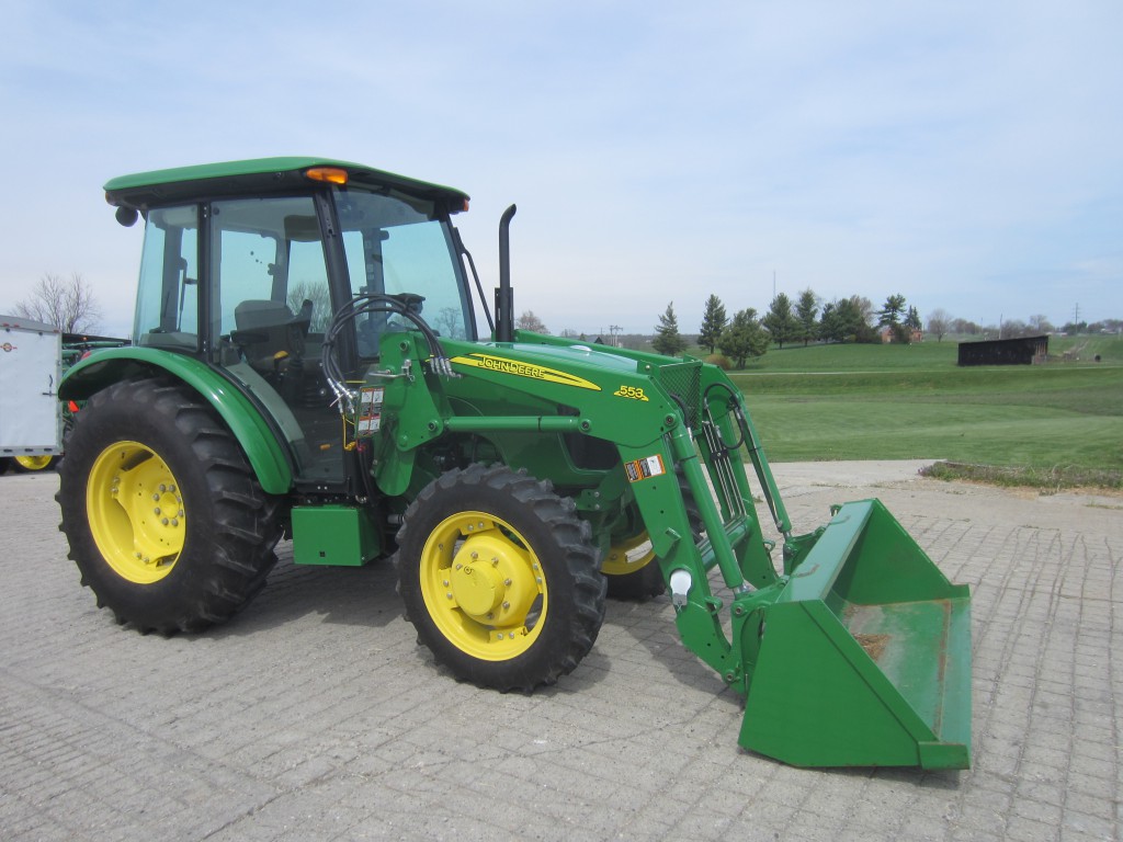C/H/A, MFWD, John Deere 553 Loader, 500 Series 80″ QT Bucket, Joystick Control, 12 x 12 Trans, Left Hand Reverser, 53 Hours, 55 Engine/45 PTO HP, AM/FM/CD, Grill Guard, 1 Remote, Toplink, 16.9-28 98%, 9.5-24 98%