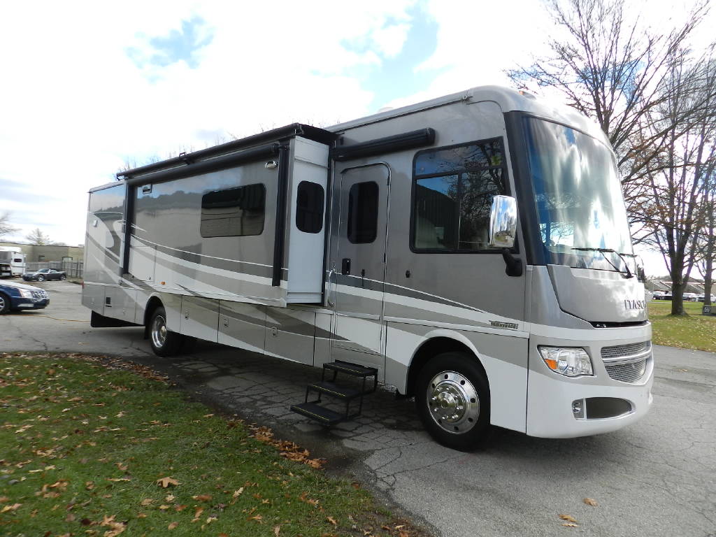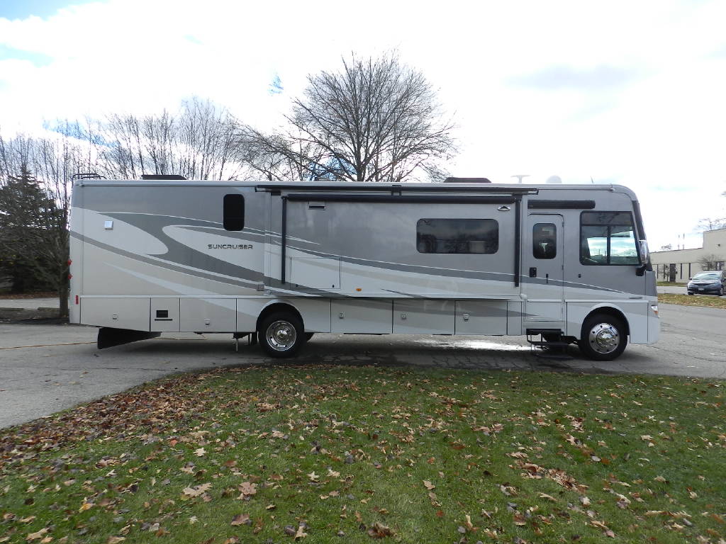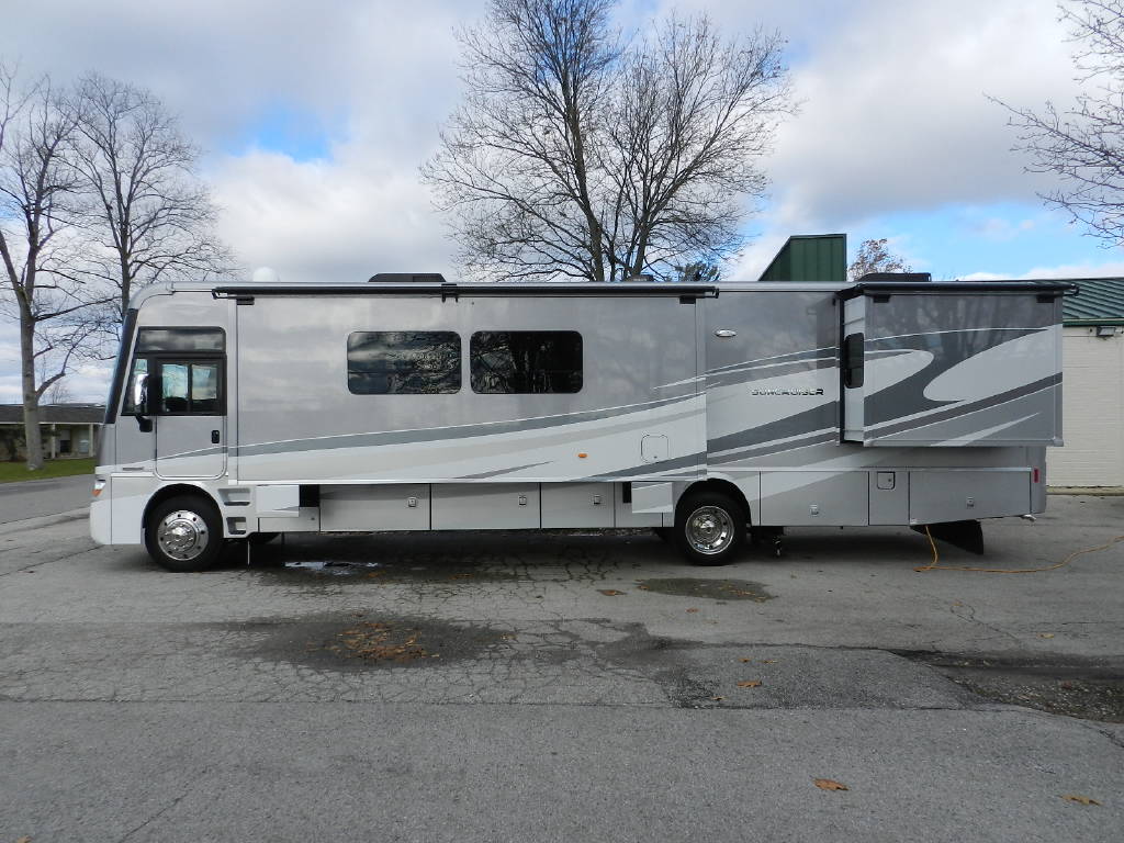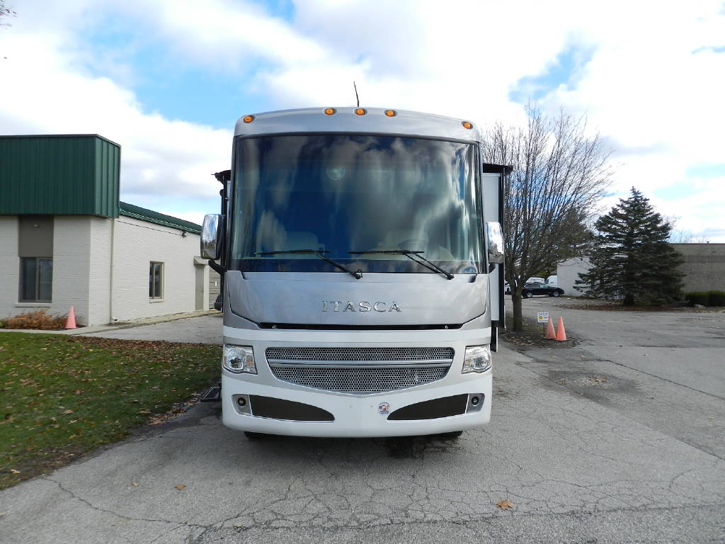 Industry leader in quality and comfort Winnebago Itasca Suncruiser 38Q Class A with 3 slides and only 5,000 miles per year of use. The Suncruiser 38Q is by far the nicest Gas Class A on the market. Premium features include; 1 piece fiberglass roof, full body paint, upgraded large power reclining L Sectional Sofa queen bed, large screen tv, in motion satellite, surround sound, fireplace, Corian solid surface counters throughout, solid wood cabinetry throughout, large fiberglass shower with glass doors, king size power adjustable bed, polished alloy wheels, huge amount of basement storage, towing package, slide awnings, power awning, rear camera with turn signal cameras, bluetooth, Kitchen Aid home refrigerator, stackable washer and dryer along with outside entertainment with TV and stereo. Fully inspected and serviced.