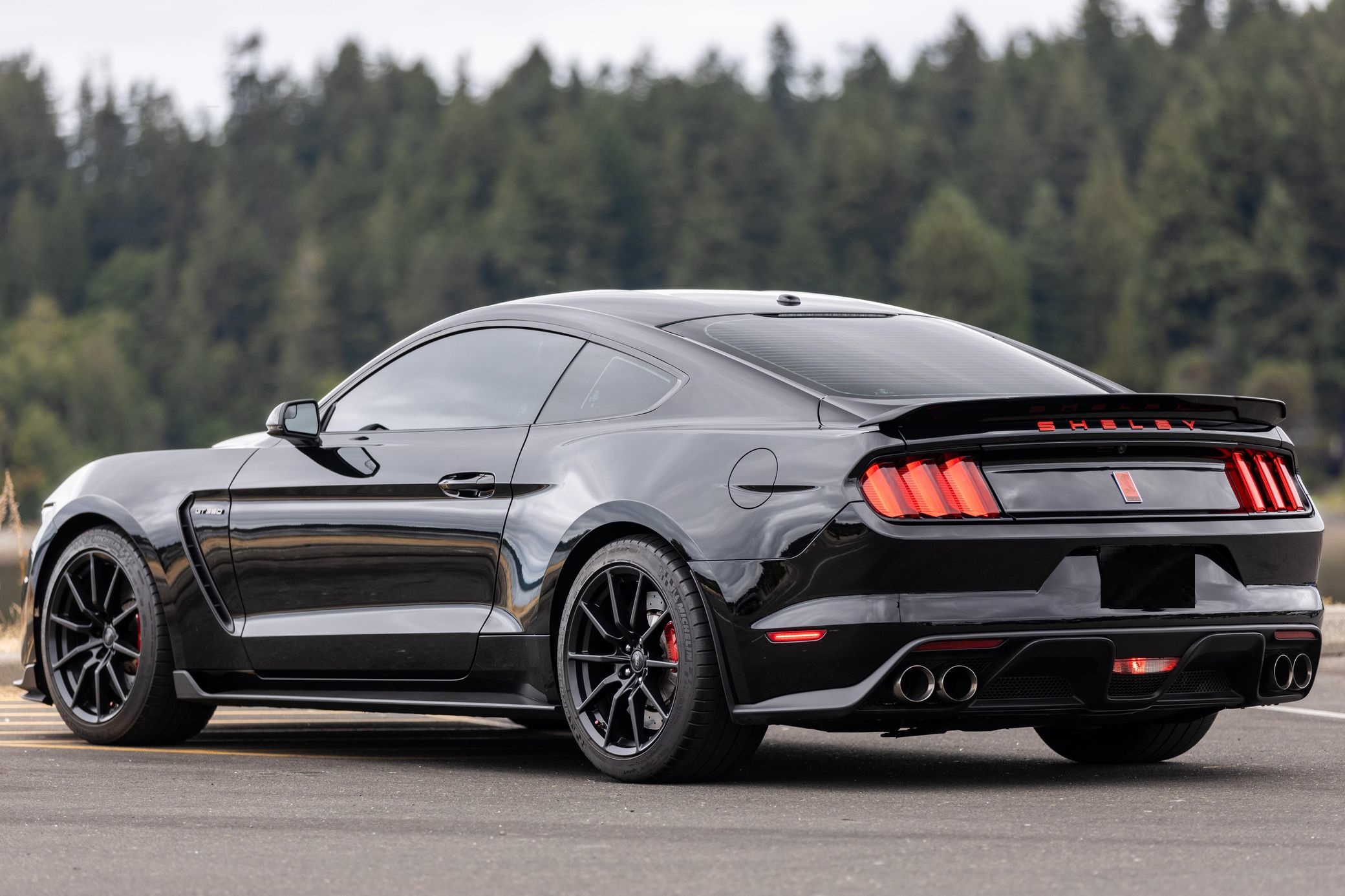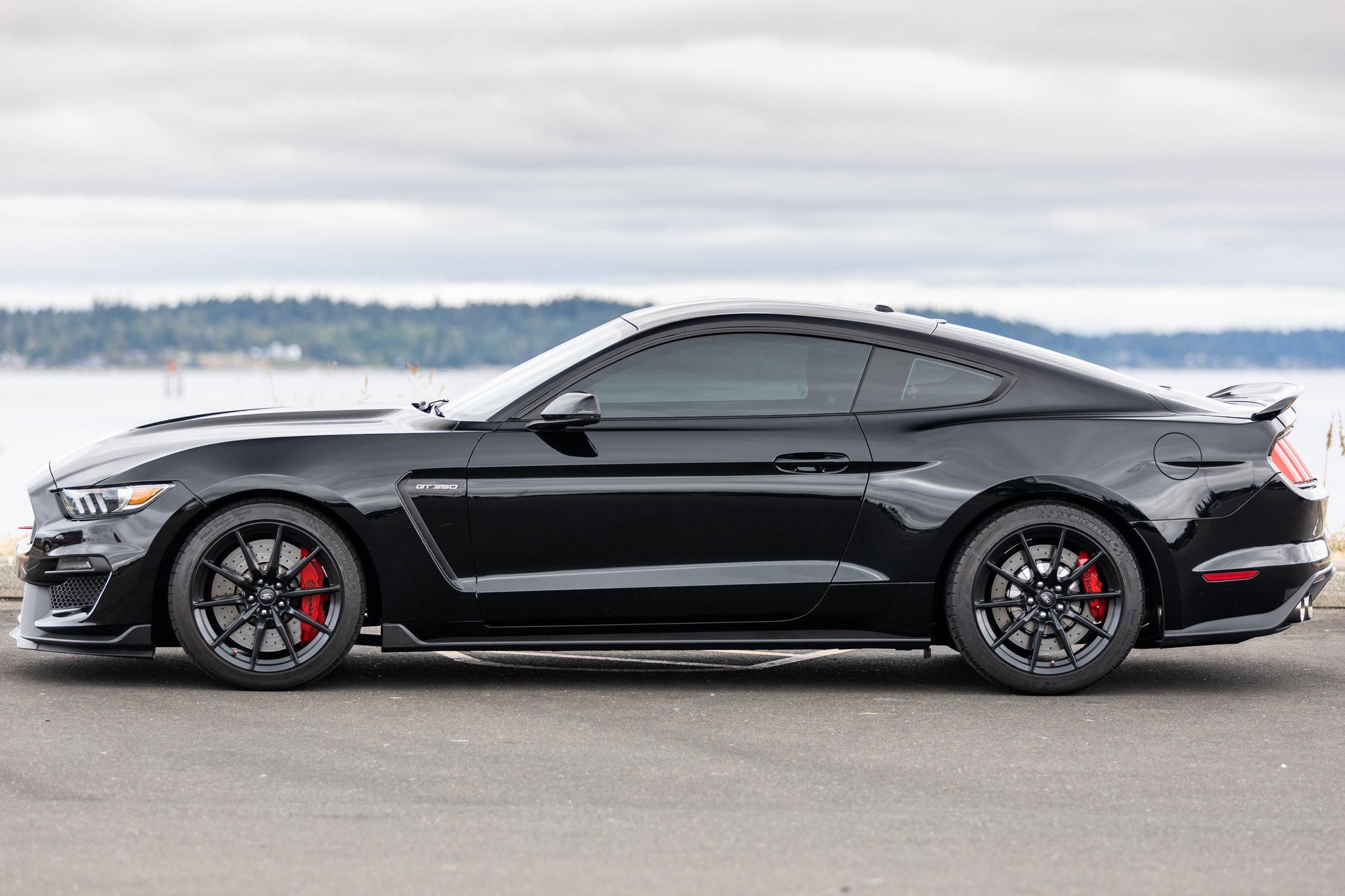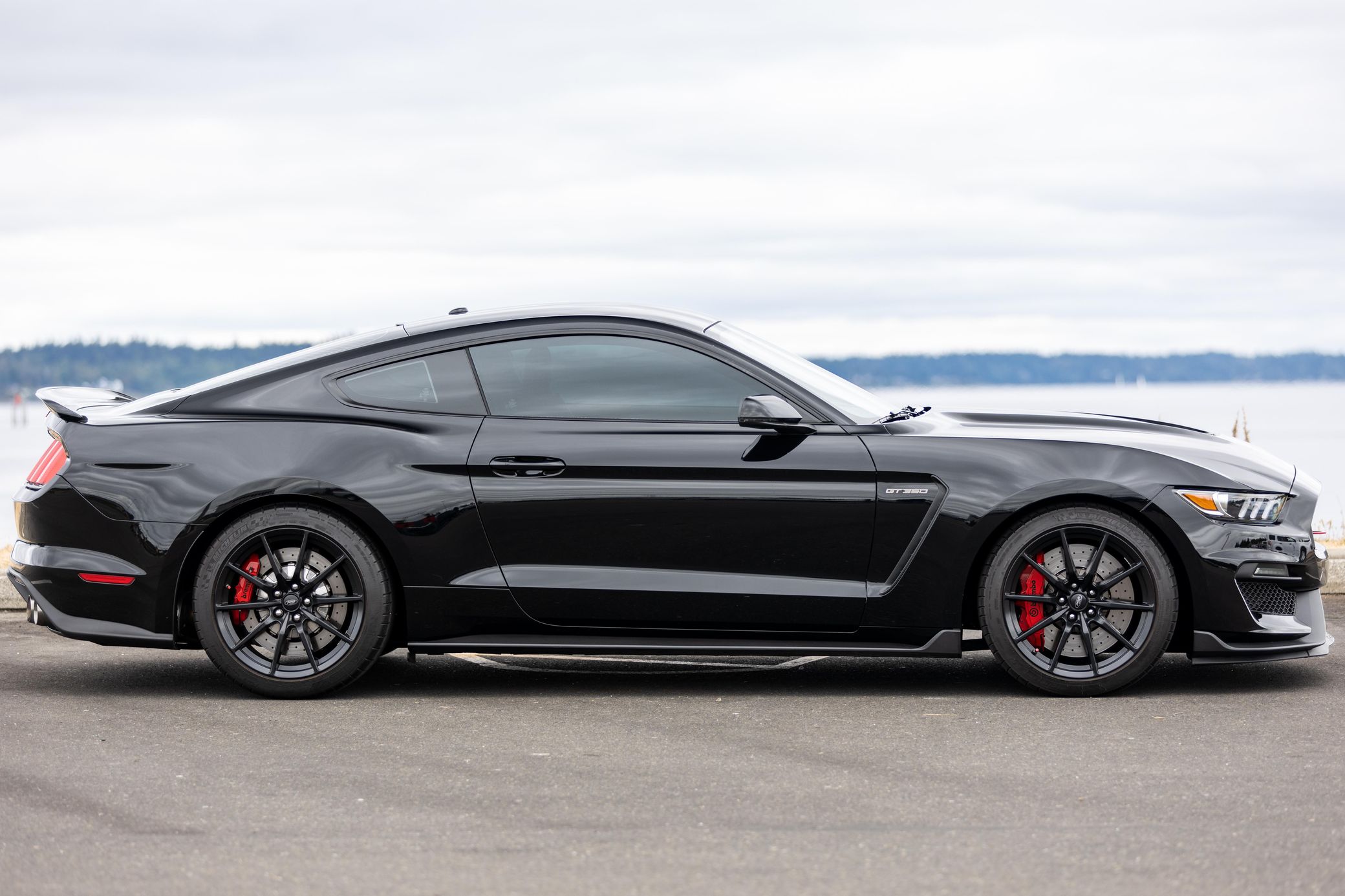 THIS… is a 2017 Ford Mustang Shelby GT350, finished in Shadow Black with an Ebony leather and Miko suede interior. No accidents; it also shows that this GT350 has been registered to a single owner in Washington since new. It came equipped with the Electronics Package, as well as 19-inch wheels, vented brake rotors with Brembo calipers, Alcantara-wrapped steering wheel, launch control, Magneride dampers, Recaro sport seats, remote keyless entry, a Torsen differential, and more as detailed below. The seller reports a handful of cosmetic modifications, including red-painted brake calipers, 18% window tint, and an R-spec front grille. The track-oriented Shelby GT350 variant of the “S550” Ford Mustang is notable for its “Voodoo” V8 engine which employs a flat-plane crank and a unique crankpin configuration and firing order. It also has upgraded aerodynamics, a revised suspension, and various lightweight components that result in a highly competent muscle car. Power comes from a 5.2-liter Voodoo V8 engine, which produces 526 horsepower and 429 lb-ft of torque. Output is sent to the rear wheels via a 6-speed manual transmission.