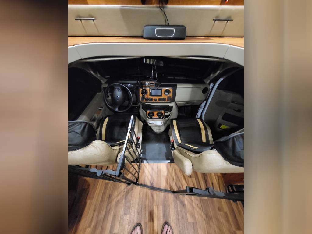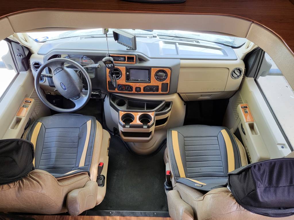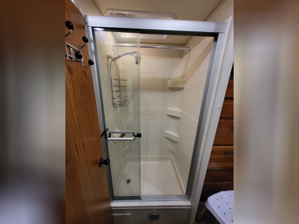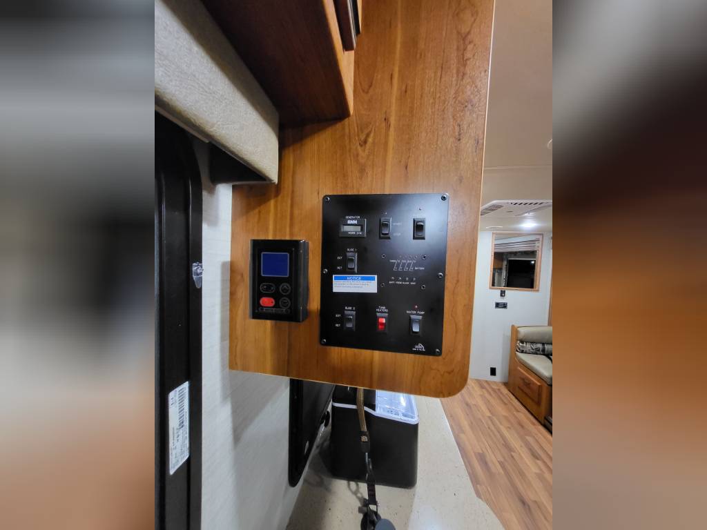 F450, Ford V10, Smoke Free, Onan Generator 525hrs, Automatic leveling system, 2 slideouts, Blackwater flushout, Outside shower, Country Fill Option, Front entertainment Center package with flat screen TV and sleeping area, TV in bedroom, Instant Hot water heater, Ducted Heat and Air, Water Filtration System, 4 Door extra large refrigerator with wood accent, Tank Heaters, J Ride stabilization system with Bilstein Shocks.
