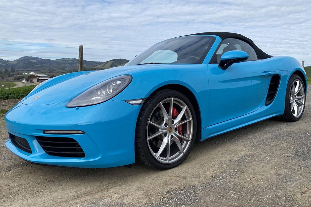 THIS… is a 2017 Porsche Boxster S, finished in Miami Blue with a black soft top and a black interior. The attached Carfax history report shows no accidents or mileage discrepancies in this Boxster’s past. Factory equipment includes the Premium Package Plus, which adds bi-xenon PDLS adaptive headlights, power-adjustable heated and ventilated sport seats with memory function, dual-zone automatic climate control, ambient lighting, rain-sensing wipers, and the Porsche Entry & Drive keyless system. Other notable equipment includes 20-inch Carrera S wheels, a body-colored roll bar, black sport tailpipes, and more as listed below. Modifications reported by the seller are limited to Euro-spec white side reflectors and a set of AlloyGator wheel curb protectors. The “982” generation of the mid-engine Porsche 718 Boxster introduced a new range of turbocharged 4-cylinder engines, replacing the 6-cylinder powerplants of previous Boxster models. The intent was to increase performance and efficiency but retain the nimble handling and distinct styling of past Boxsters. Power comes from a turbocharged 2.5-liter flat-4 engine, rated at 350 horsepower and 309 lb-ft of torque. Output is sent to the rear wheels via a 6-speed manual transmission.