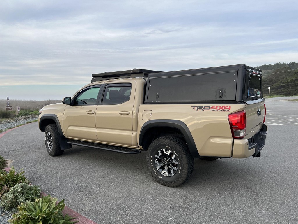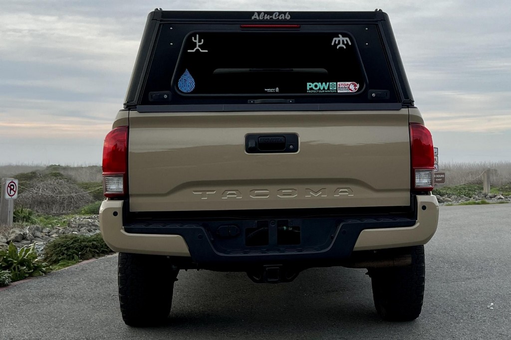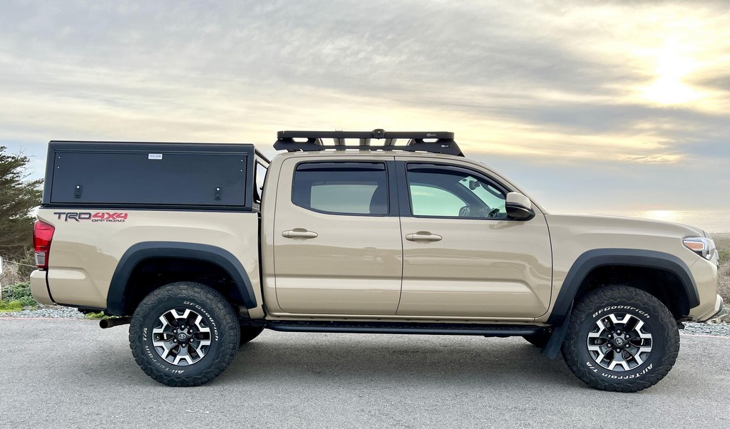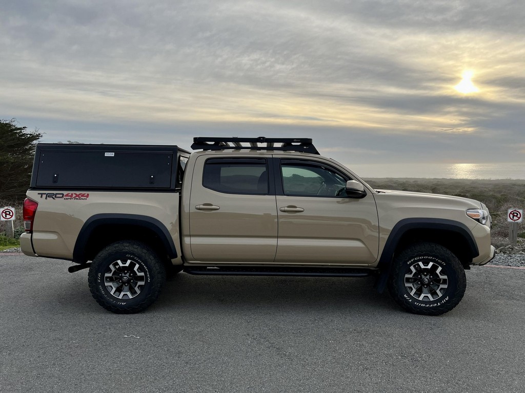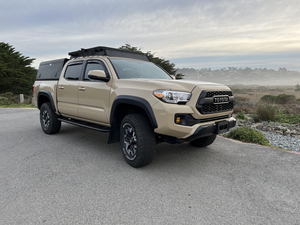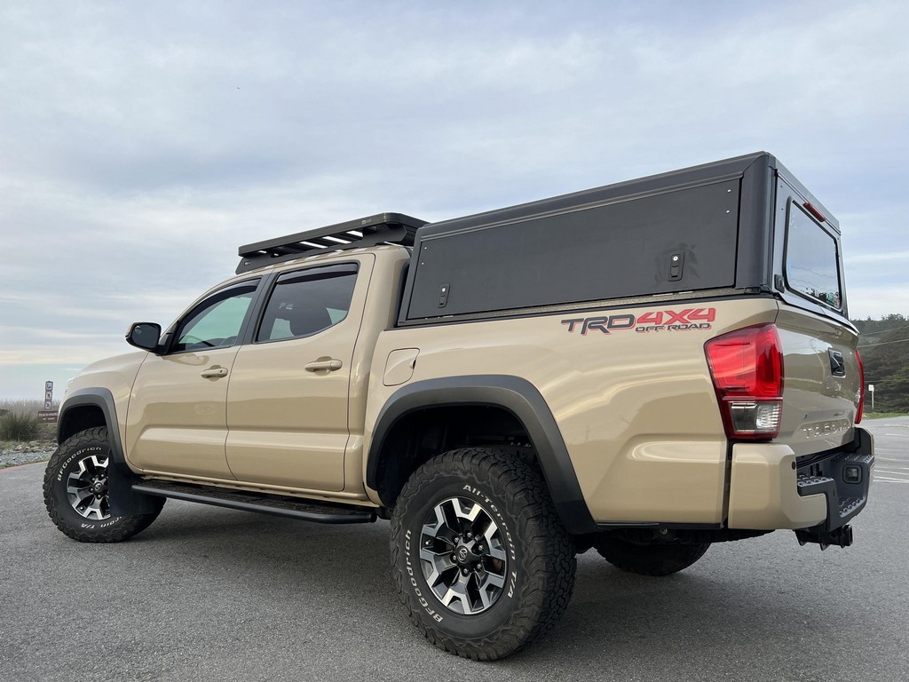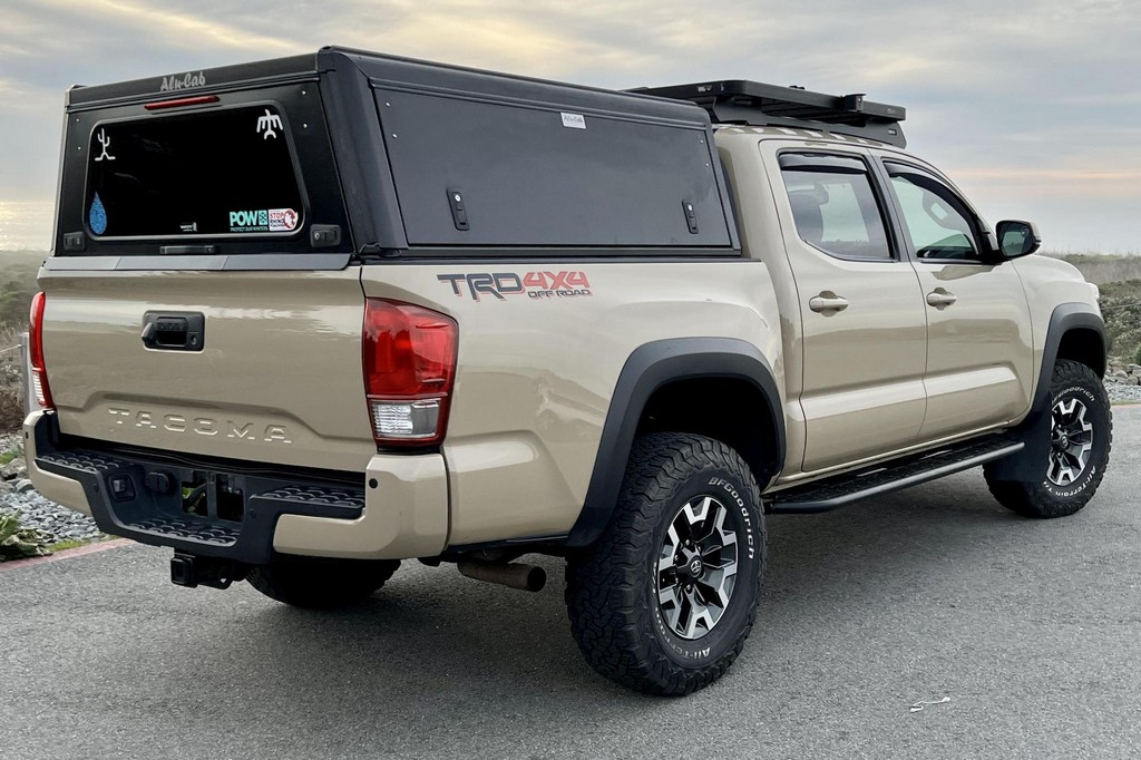 THIS… is a 2017 Toyota Tacoma TRD Off-Road Double Cab, finished in Quicksand with a black interior.The attached Carfax vehicle history report lists no accidents or mileage discrepancies in this Toyota’s past. This Tacoma came equipped with the Premium and Technology package, which adds features such as heated front seats, a wireless smartphone charging station, and a blind-spot monitor. Additional features include a locking rear differential with A-TRAC, off-road-tuned suspension, an Entune premium audio/navigation system, and more as detailed below. Some highlights include an Alu-Cab Explorer III bed canopy, Toytec Lift rear add-a-leaf kit, Timbren active off-road bump stops, Total Chaos bedside reinforcement braces, and an OVTune 91 octane ECU tune. Introduced in 2015, the third-generation Tacoma came equipped with an optional Atkinson cycle V6 engine utilizing Variable Valve Timing with intelligence (VVT-i), which replaced Toyota’s previous VVT system. The third-generation “Taco” also featured updated styling, a more comfortable interior, and a more rigid high strength steel frame. Power for this Tacoma comes from a “2GR-FKS” 3.5-liter V6 engine, rated at 278 horsepower and 265 lb-ft of torque. Due to the tune added to this Taco, it may produce more power, but a dyno sheet was not provided to confirm. Output is sent to all four wheels via a 6-speed manual transmission.