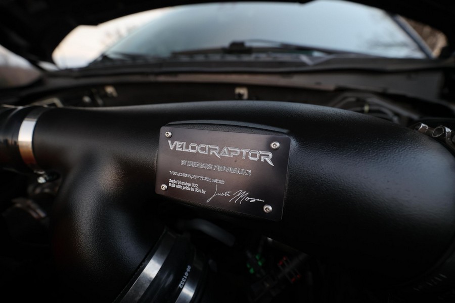 THIS… is a 2018 Ford F-150 Raptor, finished in Shadow Black with a black interior. The attached Carfax history report lists no mileage discrepancies in this truck’s past. It also shows just one owner prior to the selling delays acquisition. Built by Hennessey, this VelociRaptor is powered by a twin-turbocharged 3.5-liter V6 tuned to produce 500 horsepower, a 50-horsepower increase over a non-modified Ford F150 Raptor. It also features a 3-inch suspension lift, an array of model-specific exterior badges, and embroidered headrests, among other modifications made by the Texas-based tuner. Hennessey builds a small handful of VelociRaptors annually; this is number 22, according to a plaque in the engine bay and on the dash.
