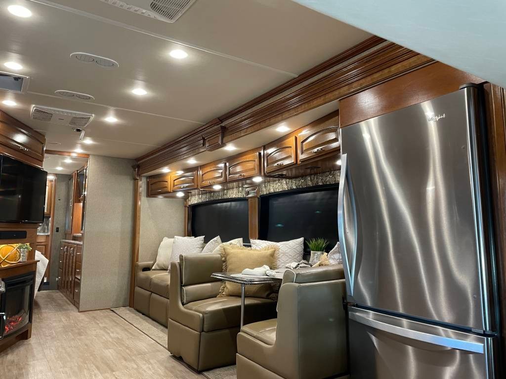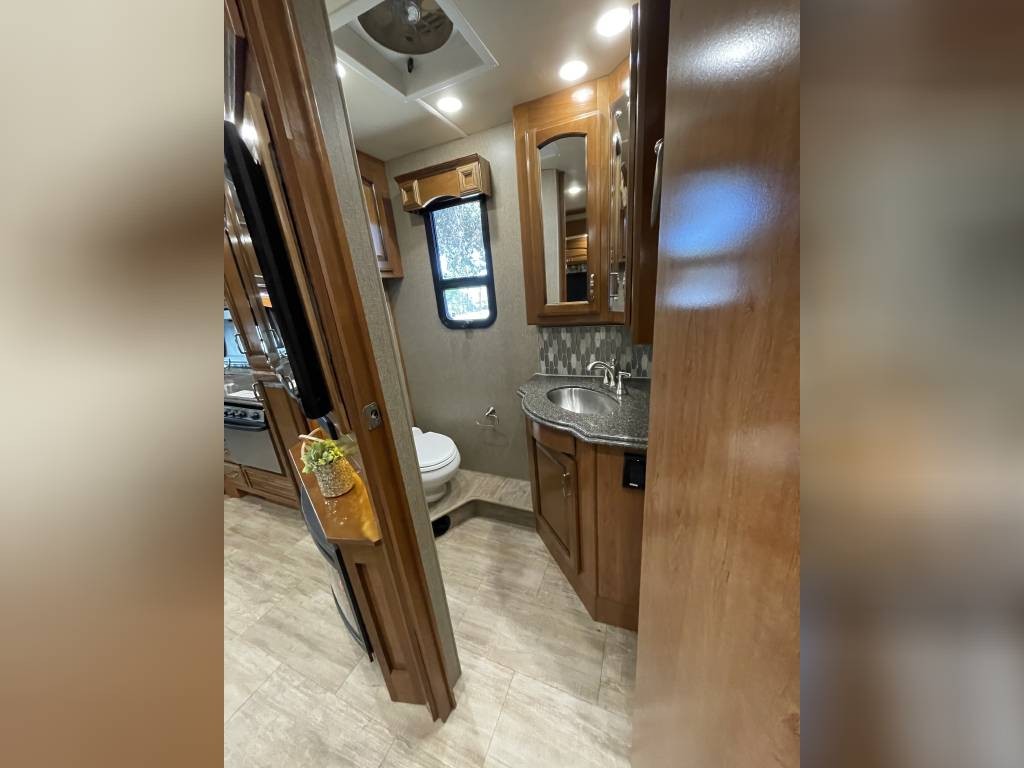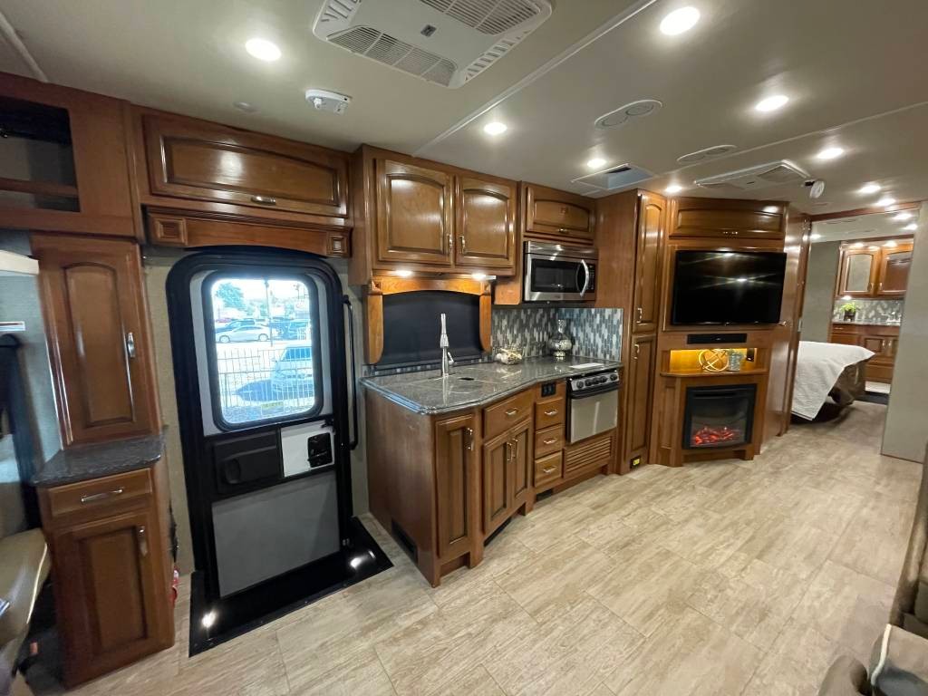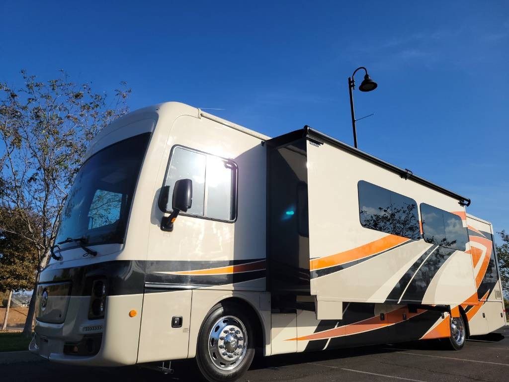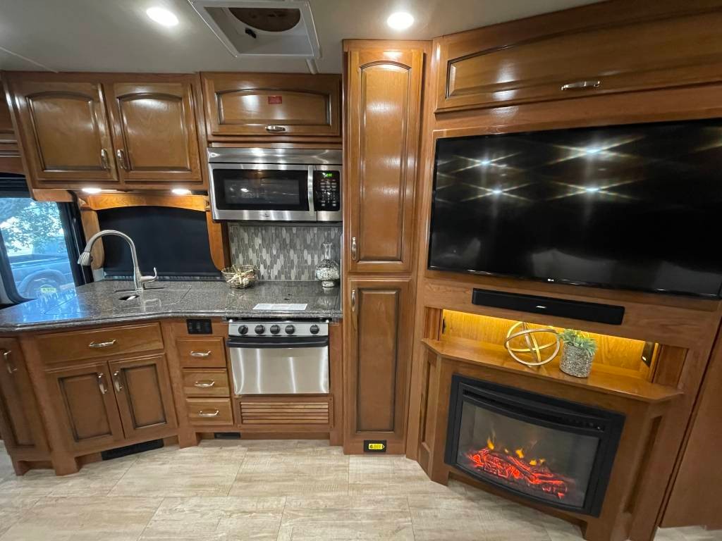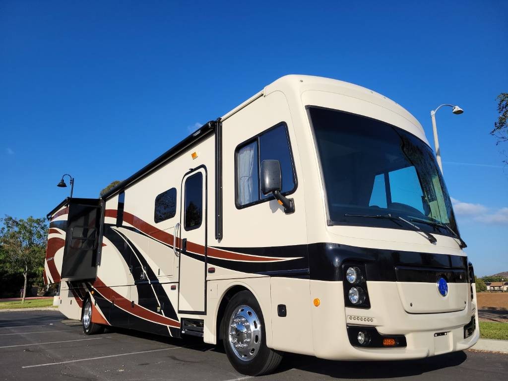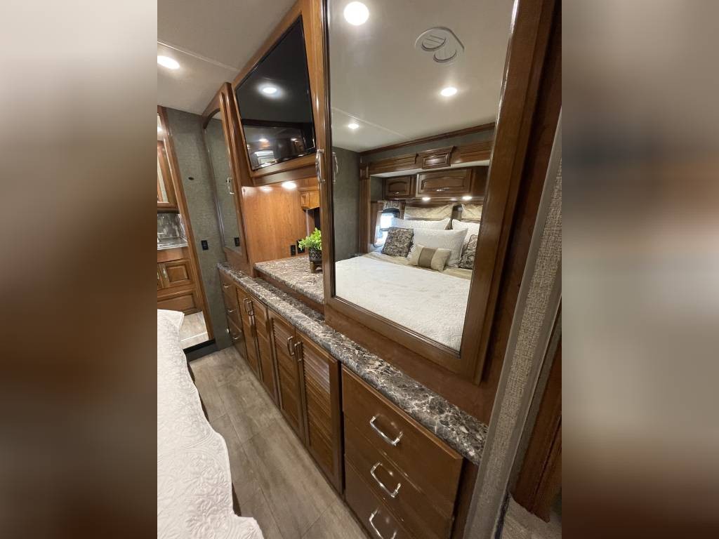 Full body paint high quality gelcoat fiberglass exterior rollout basement storage drawers pass-through storage Beautiful luxurious floorplan leather interior granite countertops real wood cabinetry full kitchen with oven Bath and a half Master bedroom suite with king size walk around access bed large rear restroom Power everything fully loaded too many options to list like new