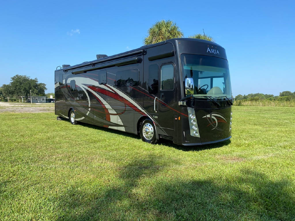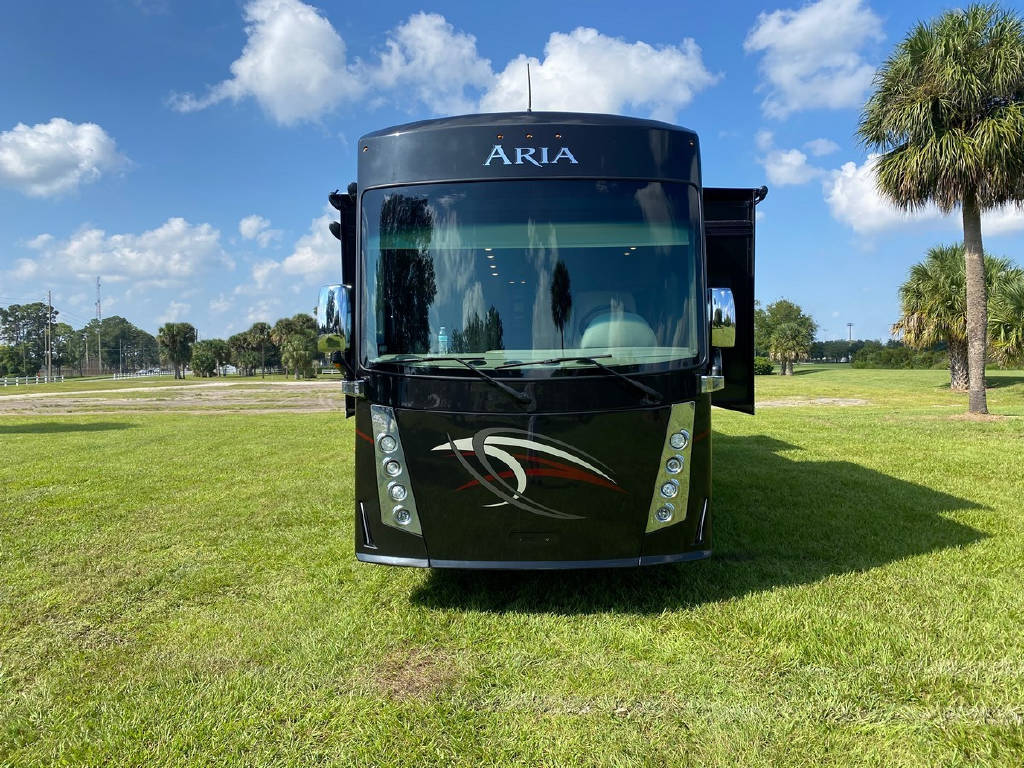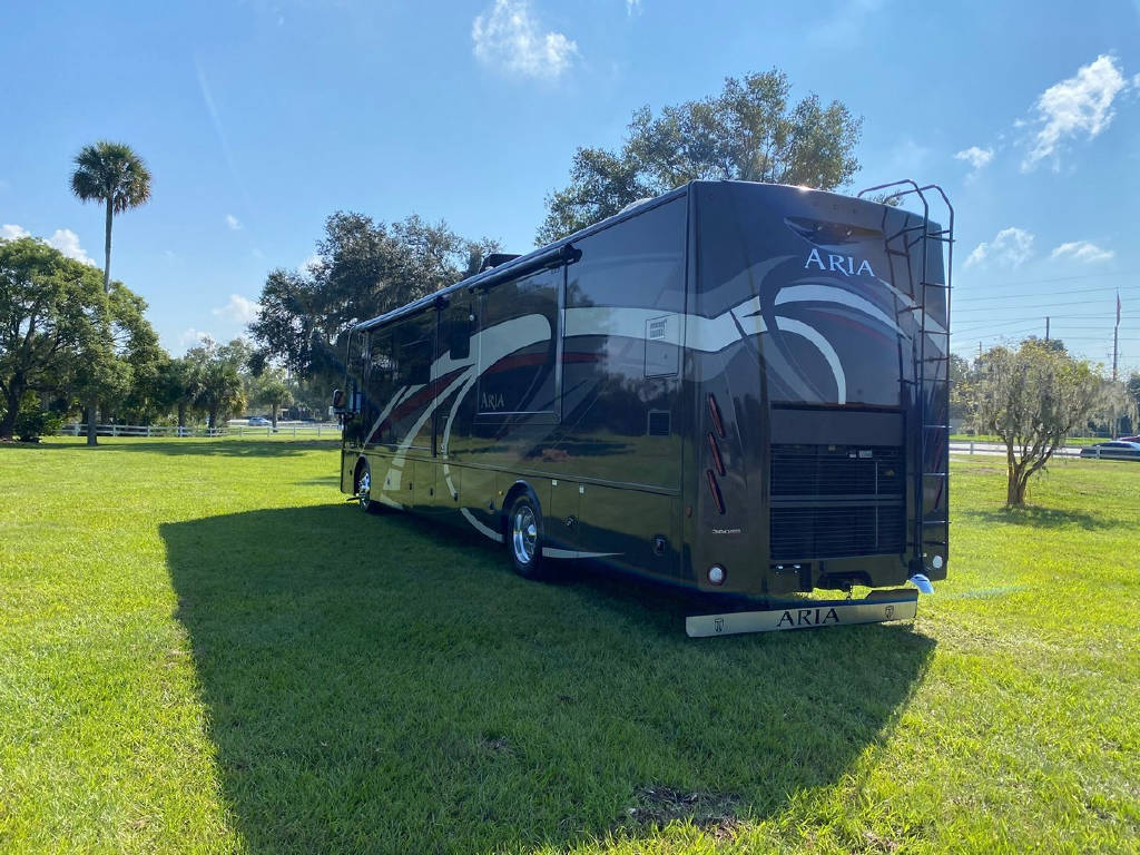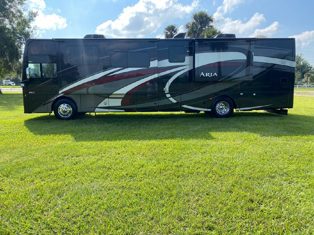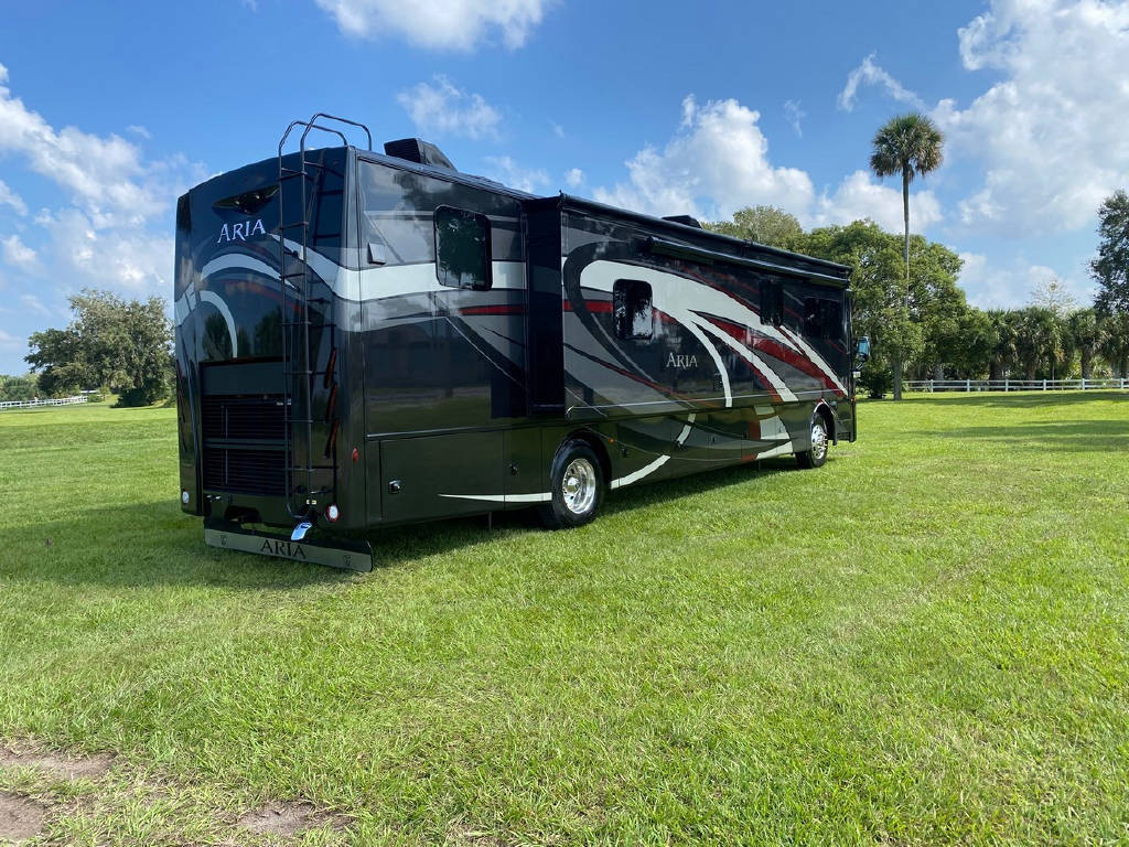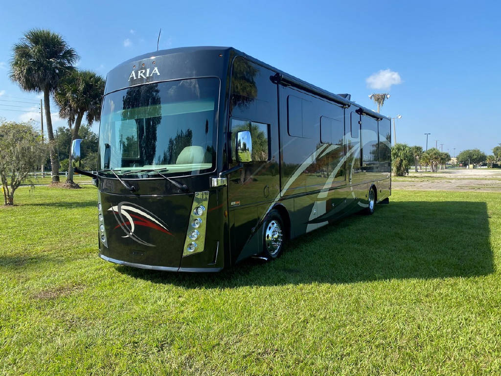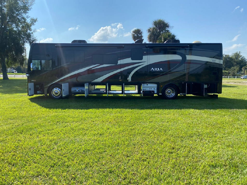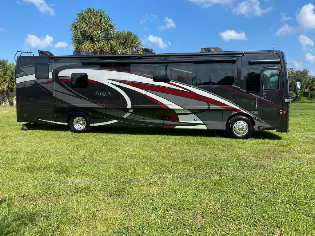 2018 Thor Aria 3901 3 slide motorhome with only 13001 miles. This coach is on a Freightliner chassis powered by a 360HP Cummins Diesel with Allison Transmission. This coach is brand new!! & includes a retractable HDTV, dream dinette table, reclining theater seating, pull out cabinet, fireplace, residential fridge, more HD TVs, Tilt-a-view inclining king bed, drop-down overhead bunk, stacked washer/dryer, outdoor entertainment & more !!!!!