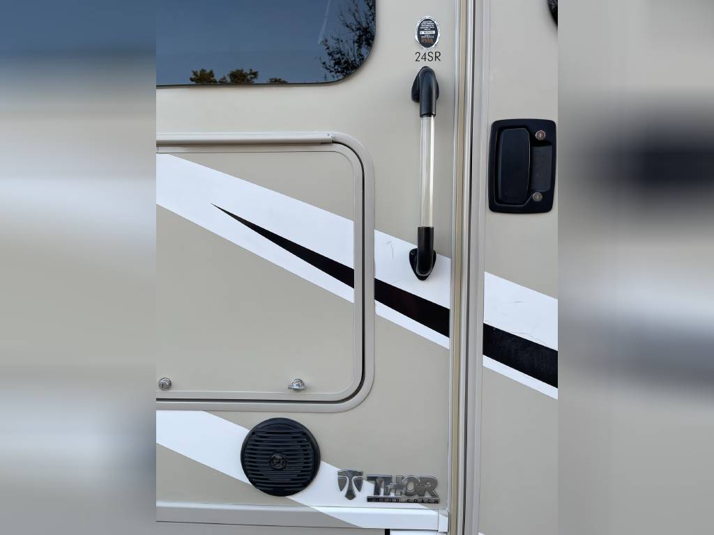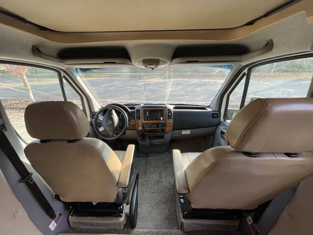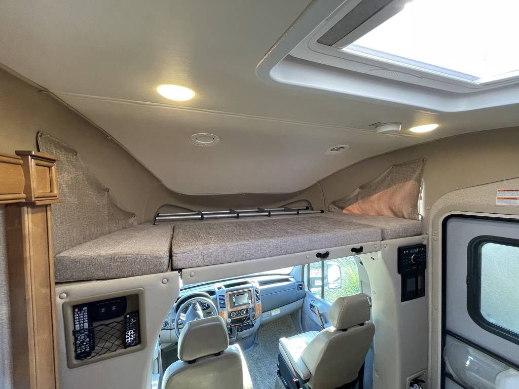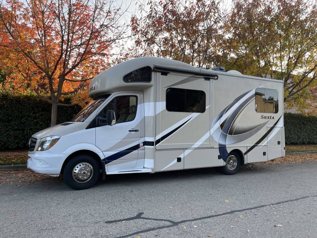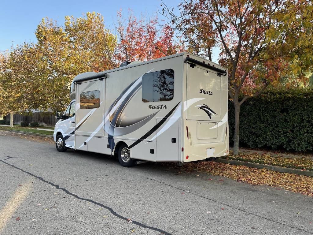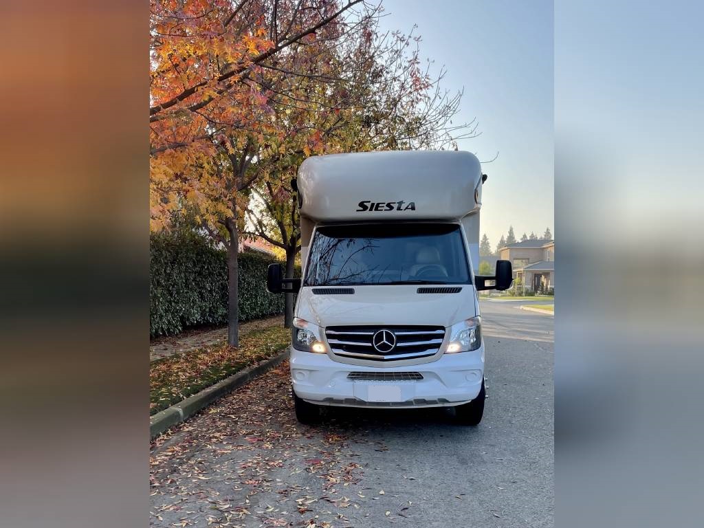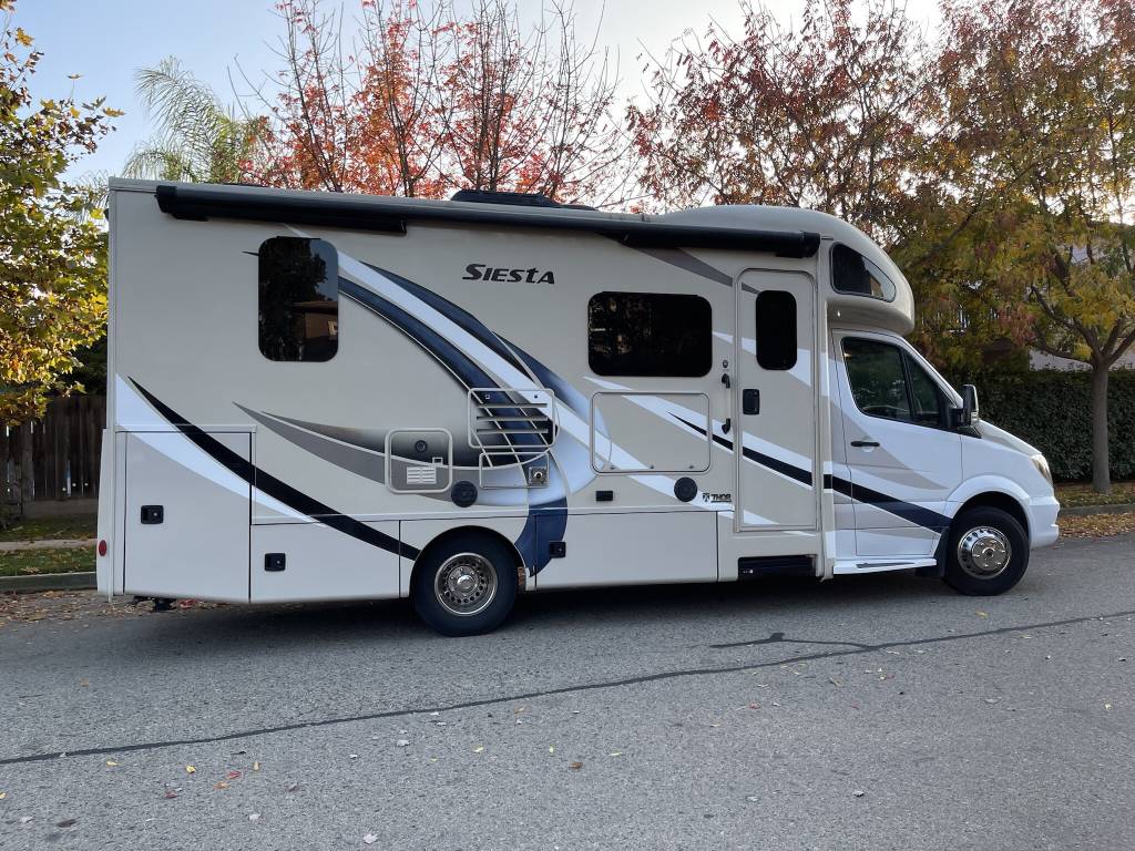 Beautiful 2018 Thor Motor Coach Siesta Sprinter 24SR Class C Diesel motorhome with only 16K miles. This fabulous little unit has two slides for a spacious interior, but with a total length of only 25 ft making it a breeze to drive and park. Gorgeous interior with high-gloss glazed Monterey Maple cabinetry with raised panel cabinet doors and hidden hinges, solid surface countertops, stainless steel refrigerator, stainless convection microwave, induction cooktop, stainless sinks in kitchen and bath, leatherette furniture, skylight, and roller privacy shades. The bedroom features a queen bed, 32″ flat screen TV, 12V attic fan and 2 closets. It also has a convenient over cab bunk bed on hydraulic struts with a detachable ladder, so that it easily lifts up out of the way when not in use. Entertainment system includes a Bluetooth Coach Radio System with DVD player, HDMI and App control, a power charging center for electronics with Safety Net. This unit is on a Mercedes Benz Sprinter chassis and is powered by a Mercedes-Benz 3.0L V6 turbo diesel engine with 188hp and an automatic transmission and equipped with a Cummins Onan 3.2KW generator, 13,500 BTU low-profile roof A/C unit, 30,000 BTU furnace, an instant tankless water heater, second auxiliary battery, and electric stabilizing system. It has an 11 ft power patio awning with integrated LED lighting, slide awnings, frameless windows, heated exterior mirrors, an exterior entertainment center with a flat screen TV and marine grade speakers, outside shower, exterior LP/BBQ connection, enclosed and heated holding tanks, with an abundance of exterior storage space including a large rear pass through compartment with three side access doors.
