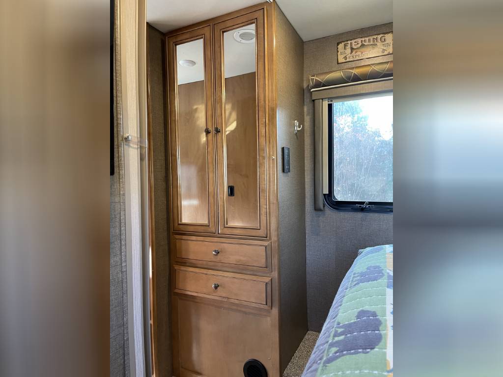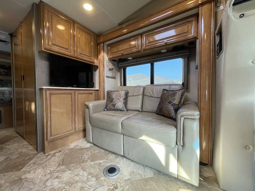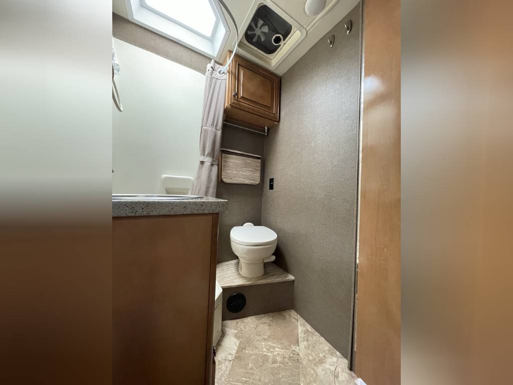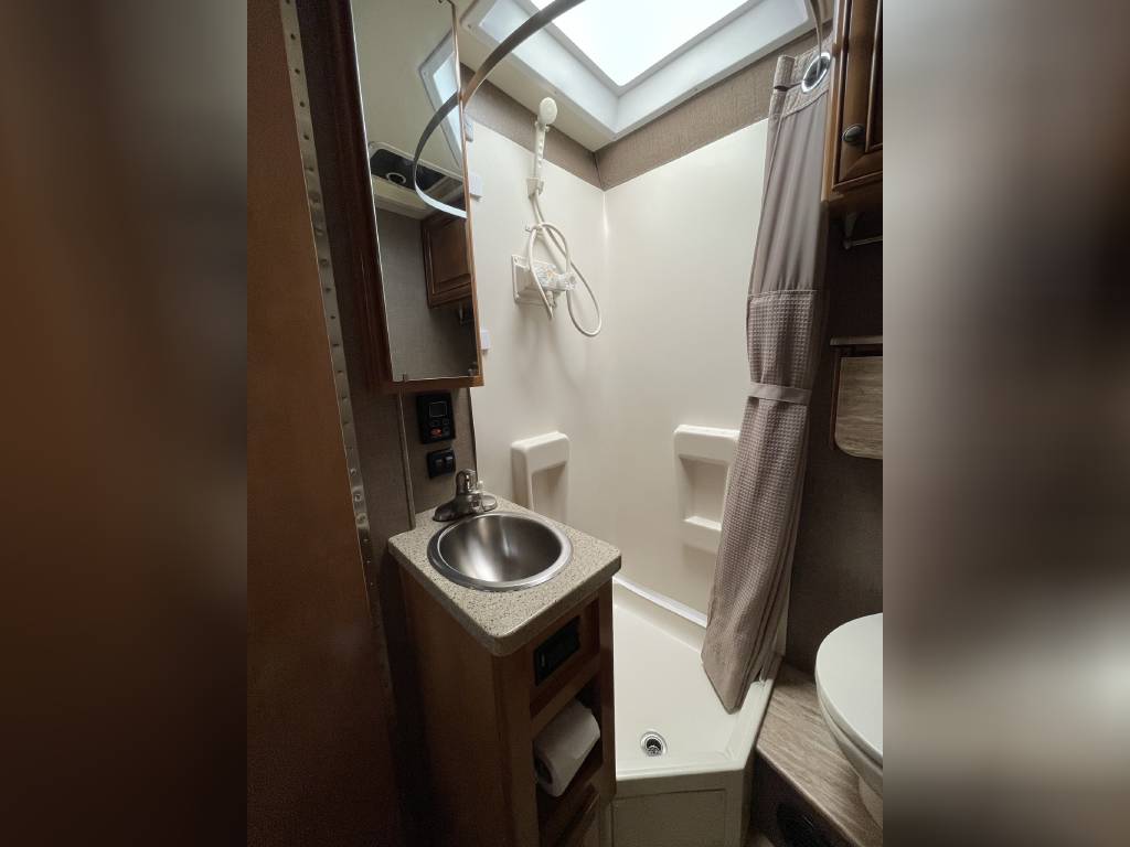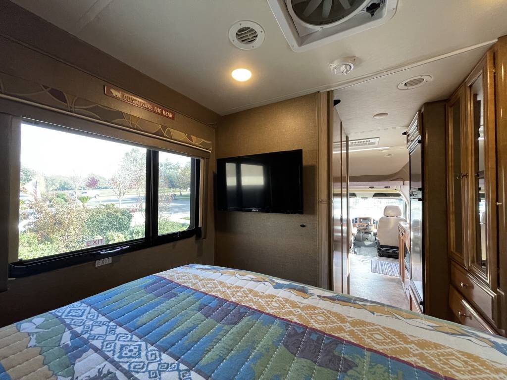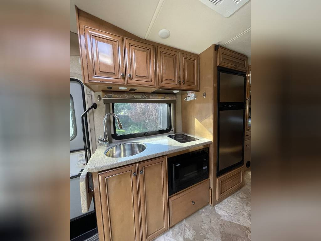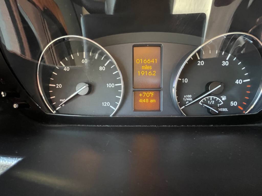 Beautiful 2018 Thor Motor Coach Siesta Sprinter 24SR Class C Diesel motorhome with only 16K miles. This fabulous little unit has two slides for a spacious interior, but with a total length of only 25 ft making it a breeze to drive and park. Gorgeous interior with high-gloss glazed Monterey Maple cabinetry with raised panel cabinet doors and hidden hinges, solid surface countertops, stainless steel refrigerator, stainless convection microwave, induction cooktop, stainless sinks in kitchen and bath, leatherette furniture, skylight, and roller privacy shades. The bedroom features a queen bed, 32″ flat screen TV, 12V attic fan and 2 closets. It also has a convenient over cab bunk bed on hydraulic struts with a detachable ladder, so that it easily lifts up out of the way when not in use. Entertainment system includes a Bluetooth Coach Radio System with DVD player, HDMI and App control, a power charging center for electronics with Safety Net. This unit is on a Mercedes Benz Sprinter chassis and is powered by a Mercedes-Benz 3.0L V6 turbo diesel engine with 188hp and an automatic transmission and equipped with a Cummins Onan 3.2KW generator, 13,500 BTU low-profile roof A/C unit, 30,000 BTU furnace, an instant tankless water heater, second auxiliary battery, and electric stabilizing system. It has an 11 ft power patio awning with integrated LED lighting, slide awnings, frameless windows, heated exterior mirrors, an exterior entertainment center with a flat screen TV and marine grade speakers, outside shower, exterior LP/BBQ connection, enclosed and heated holding tanks, with an abundance of exterior storage space including a large rear pass through compartment with three side access doors.