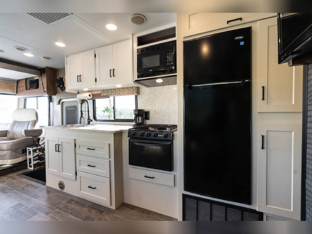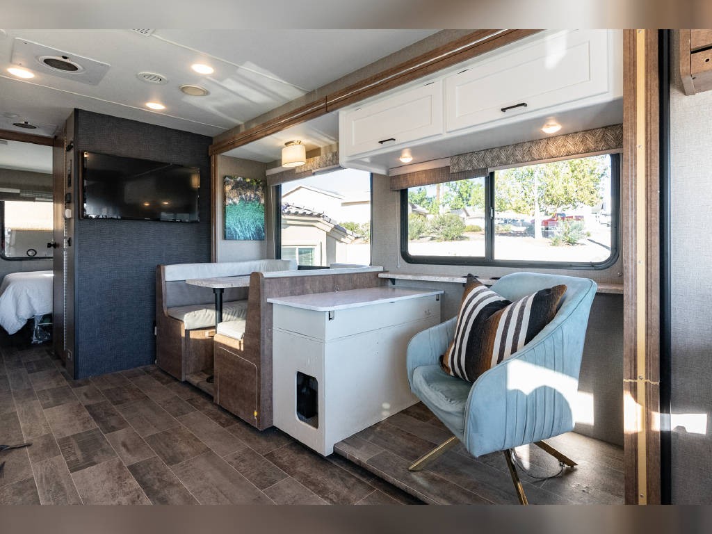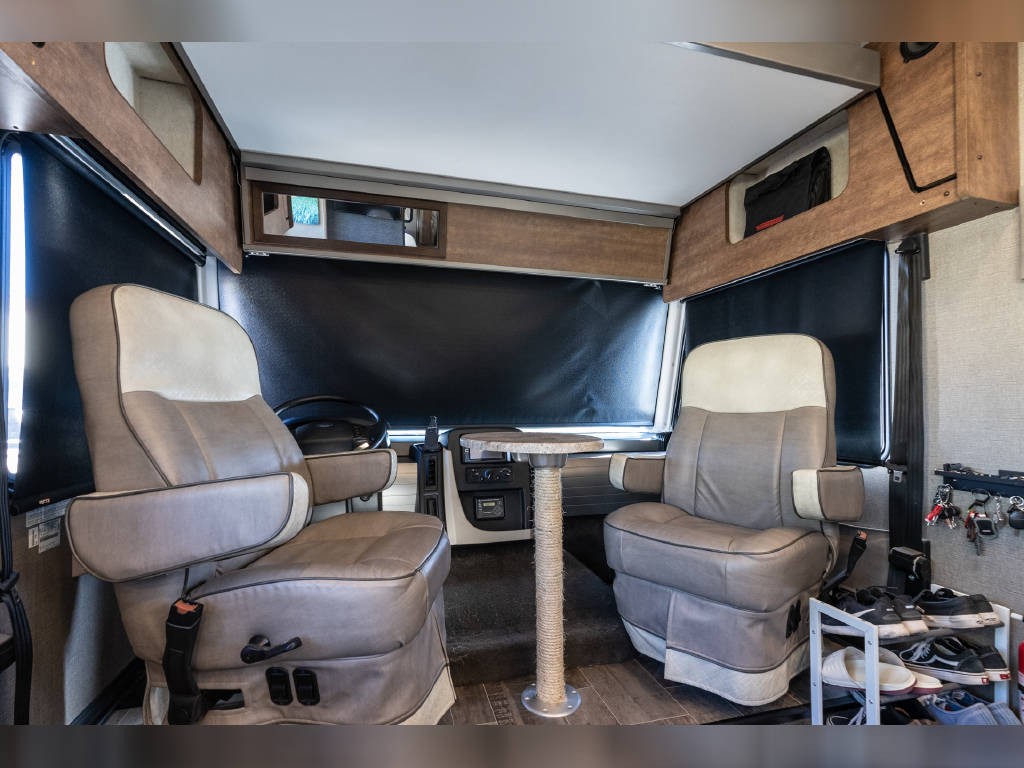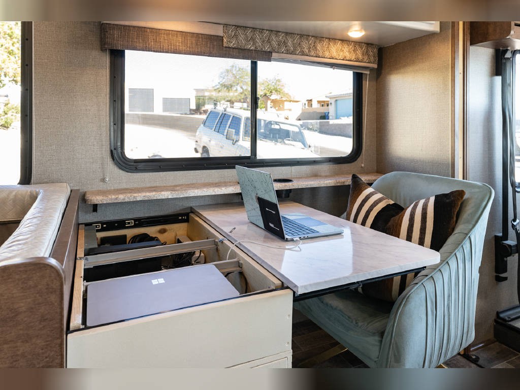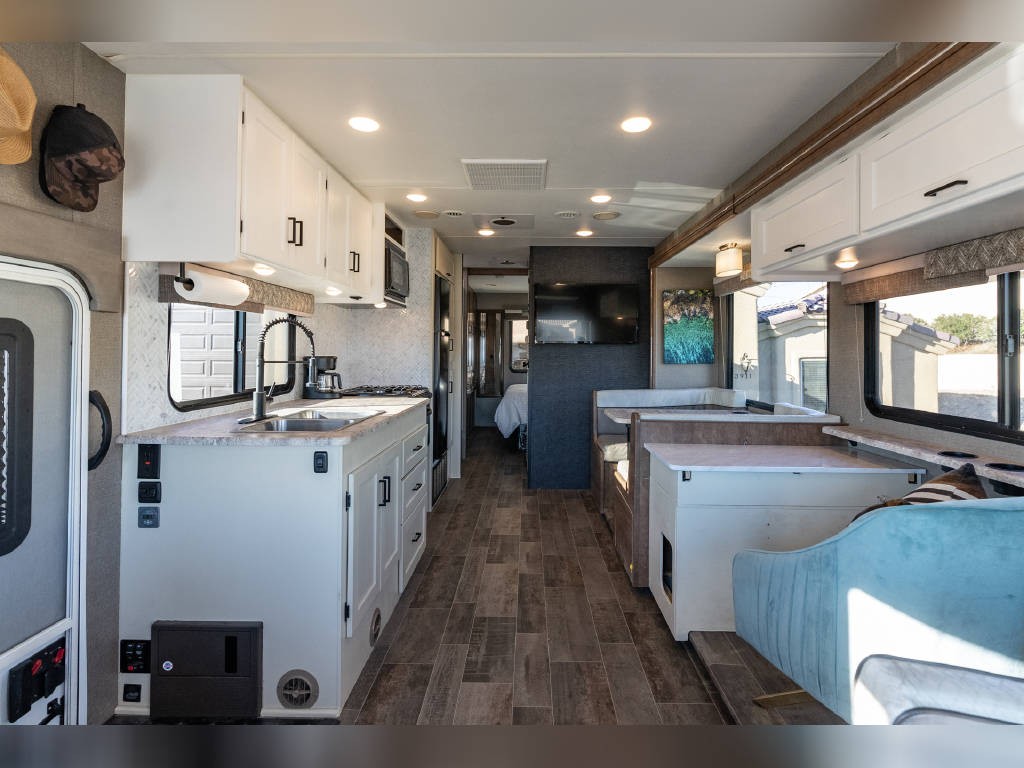 Upgraded with modern amenites and ready to hit the road while staying connected! Very clean, 14,900 miles on ODO, Triton V10 with 6-speed trans. Kitchen has been remodeled/updated to a brighter, more modern feel. Upgraded electrical system with larger capacity Battle Born lithium batteries & larger Victron Energy inverter/charger that’s wired to all the outlets (originally just fridges and TV) so everything has power when using just the batteries (AC excluded; that still requires shore power or generator). Sofa has been removed and replaced with an office area that is equipped with a pull-out desk, outlets, and padded trays to keep electronics safe and charged while traveling.