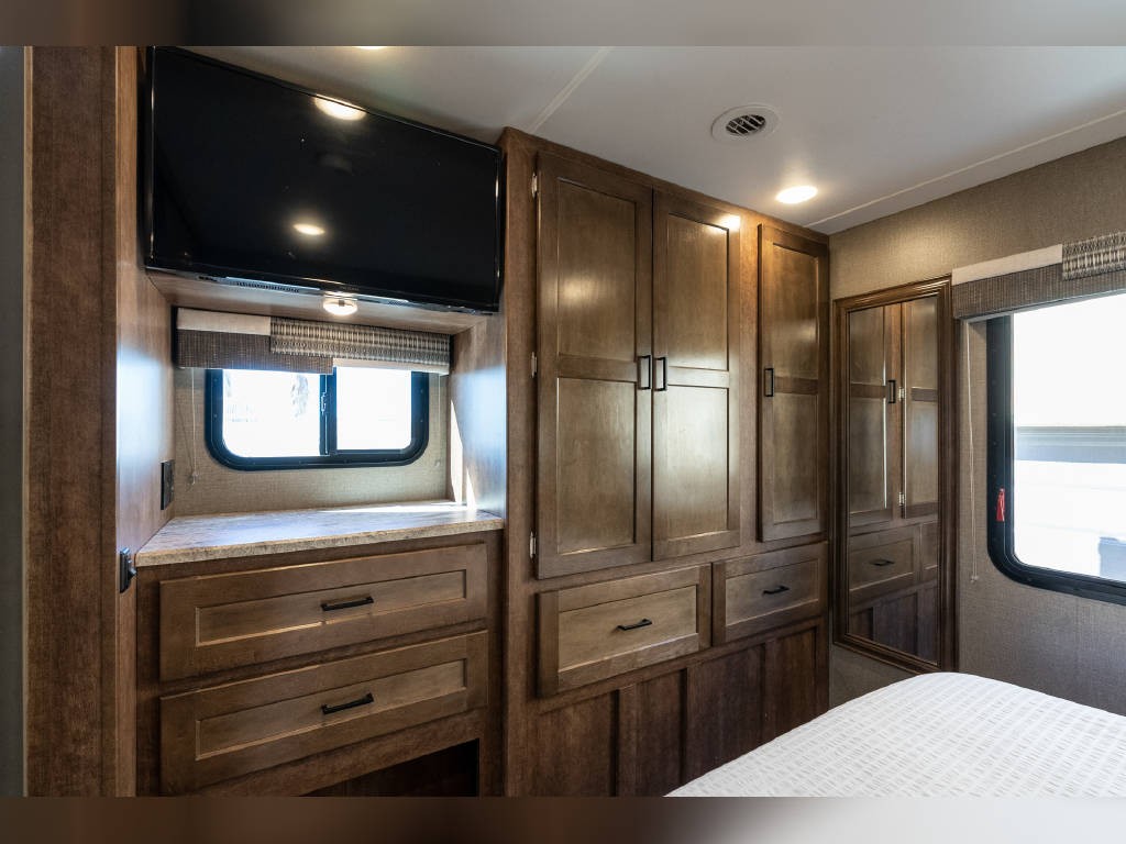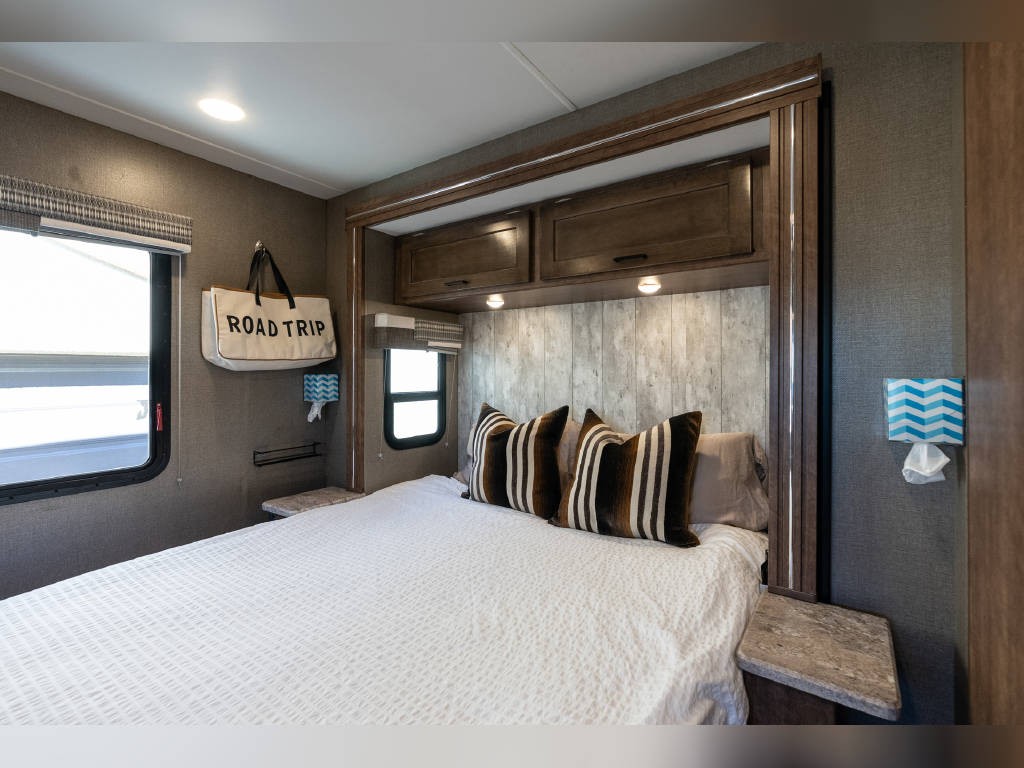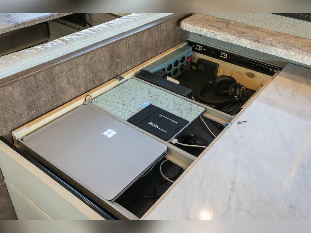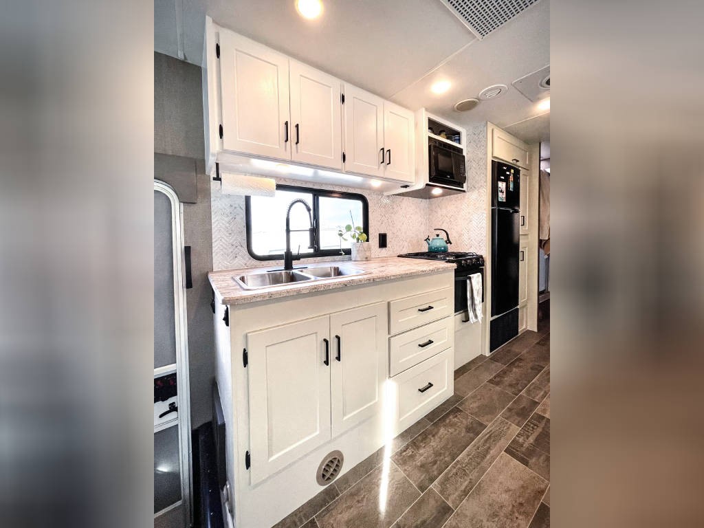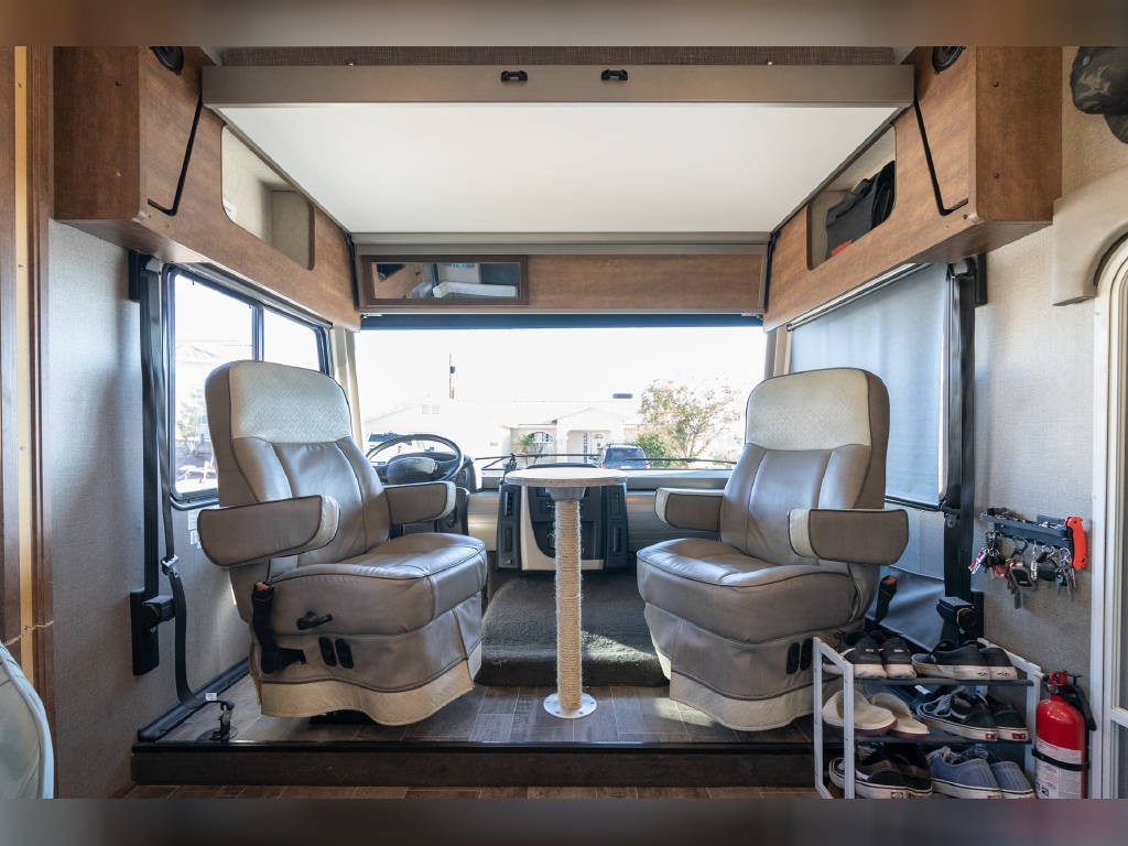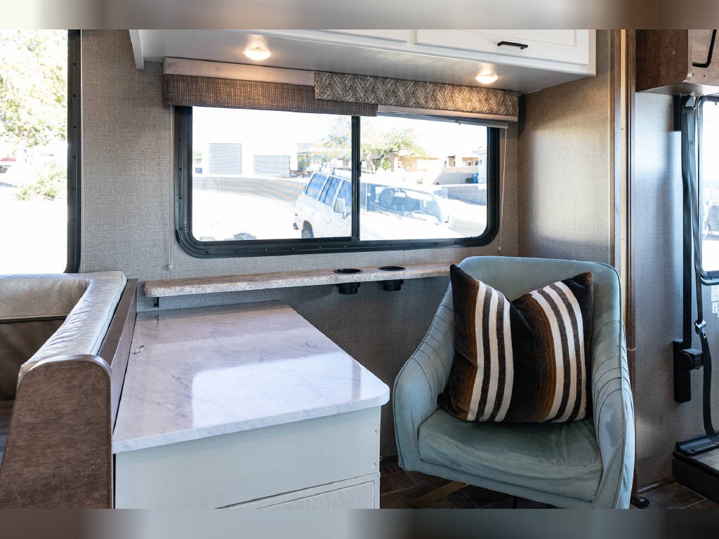 Upgraded with modern amenites and ready to hit the road while staying connected! Very clean, 14,900 miles on ODO, Triton V10 with 6-speed trans. Kitchen has been remodeled/updated to a brighter, more modern feel. Upgraded electrical system with larger capacity Battle Born lithium batteries & larger Victron Energy inverter/charger that’s wired to all the outlets (originally just fridges and TV) so everything has power when using just the batteries (AC excluded; that still requires shore power or generator). Sofa has been removed and replaced with an office area that is equipped with a pull-out desk, outlets, and padded trays to keep electronics safe and charged while traveling.