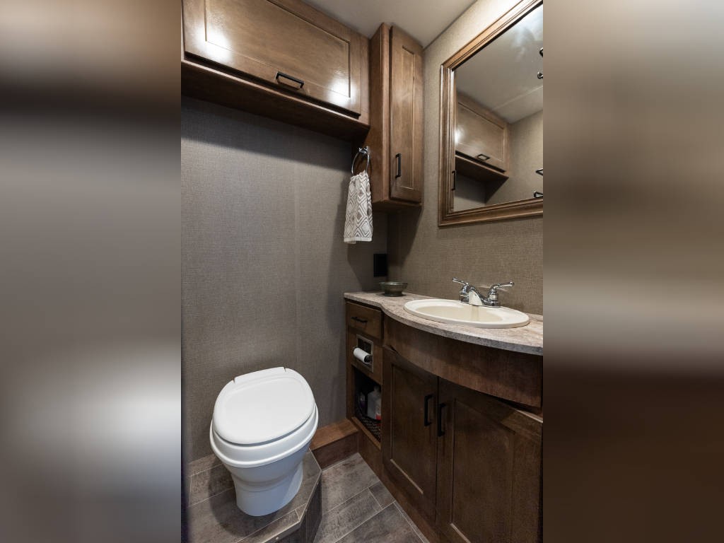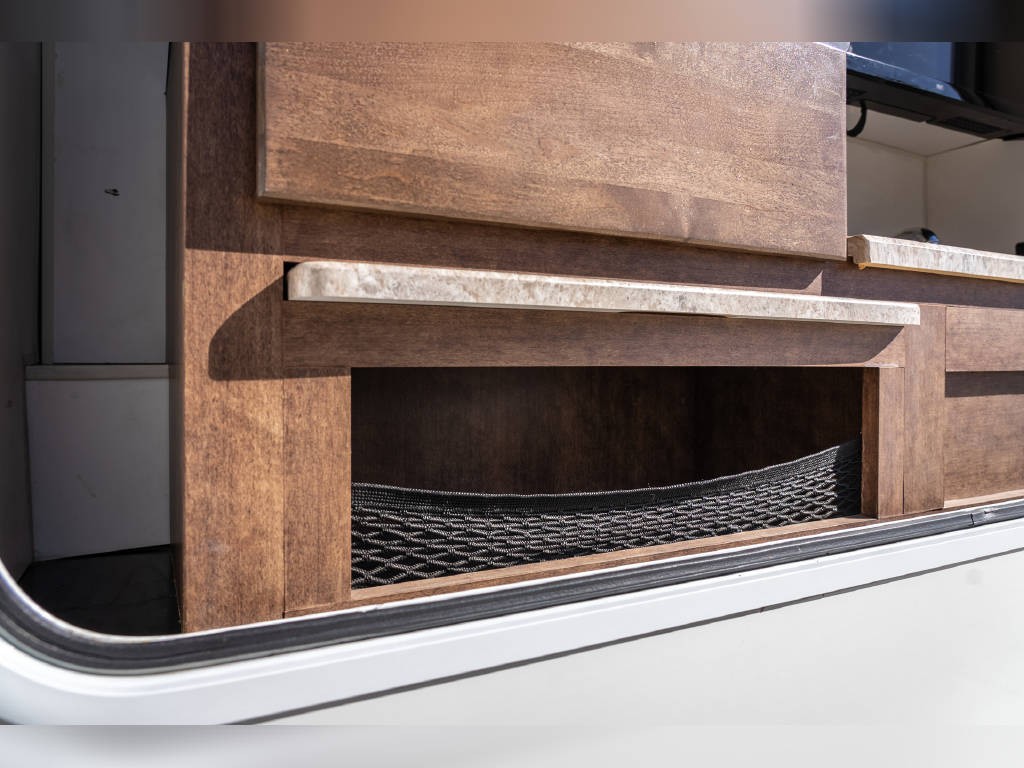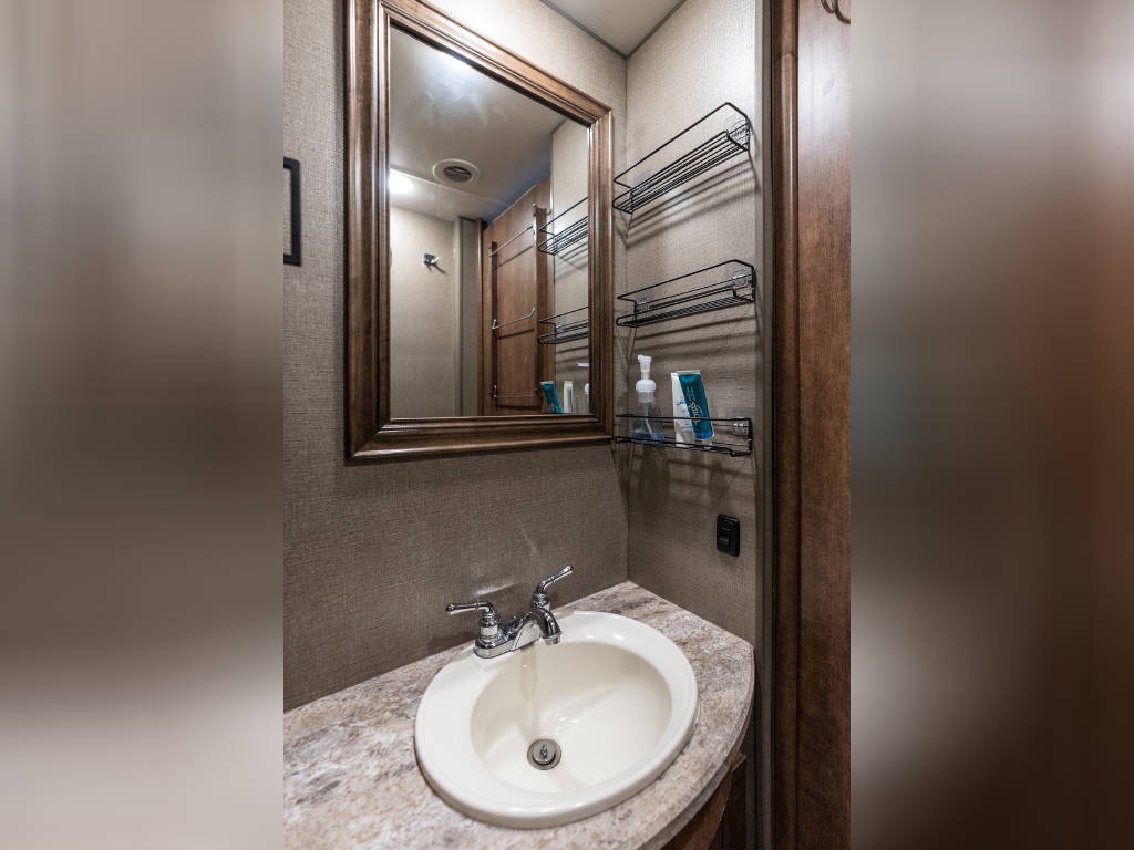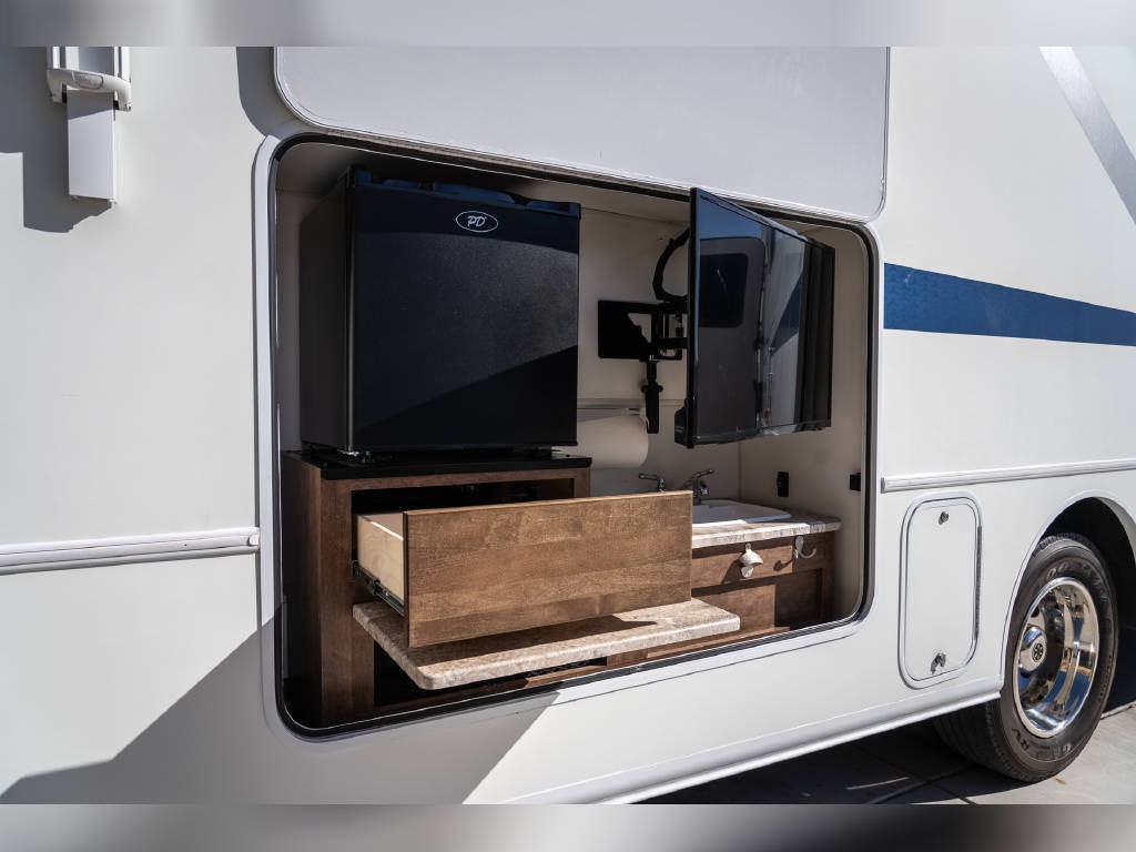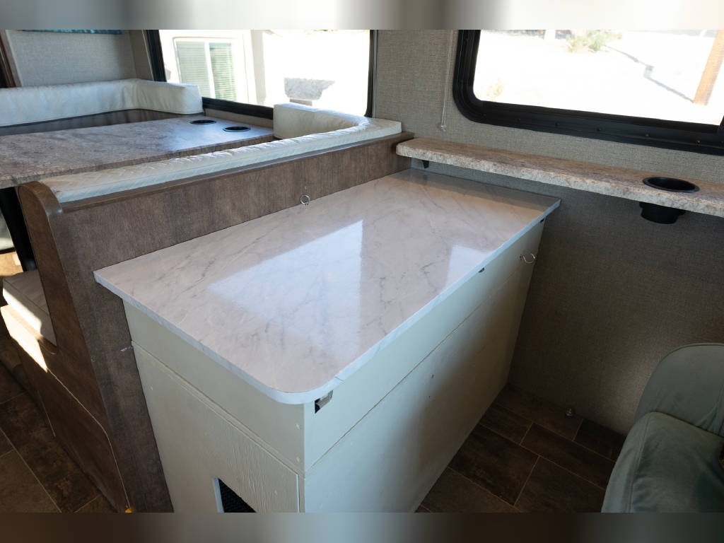 Upgraded with modern amenites and ready to hit the road while staying connected! Very clean, 14,900 miles on ODO, Triton V10 with 6-speed trans. Kitchen has been remodeled/updated to a brighter, more modern feel. Upgraded electrical system with larger capacity Battle Born lithium batteries & larger Victron Energy inverter/charger that’s wired to all the outlets (originally just fridges and TV) so everything has power when using just the batteries (AC excluded; that still requires shore power or generator). Sofa has been removed and replaced with an office area that is equipped with a pull-out desk, outlets, and padded trays to keep electronics safe and charged while traveling.