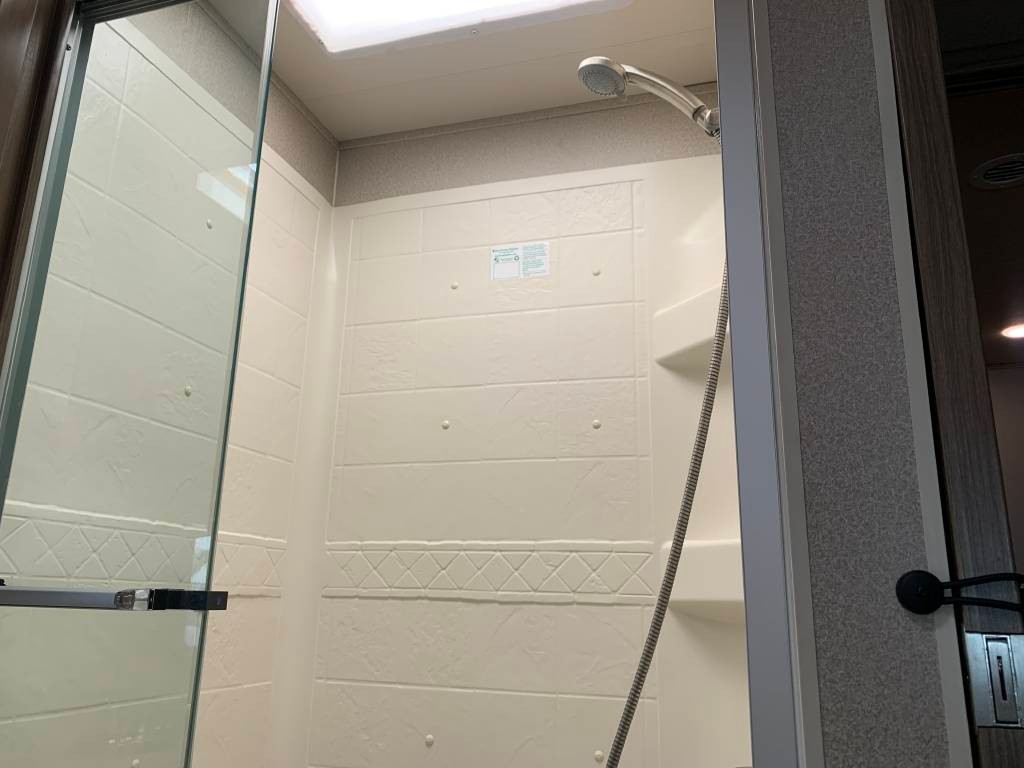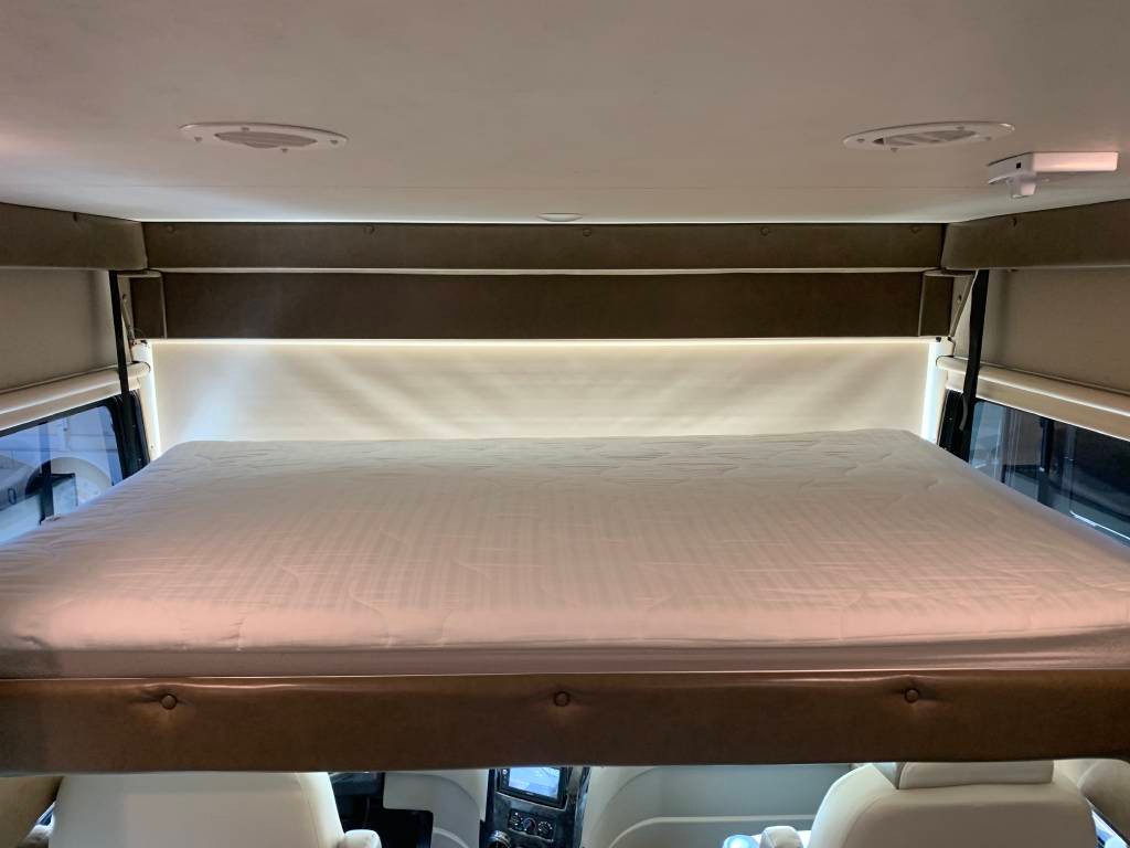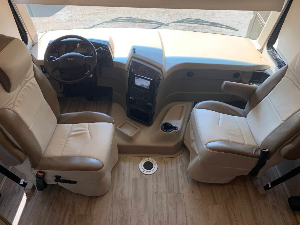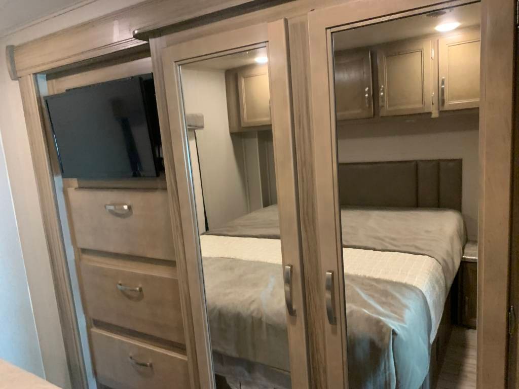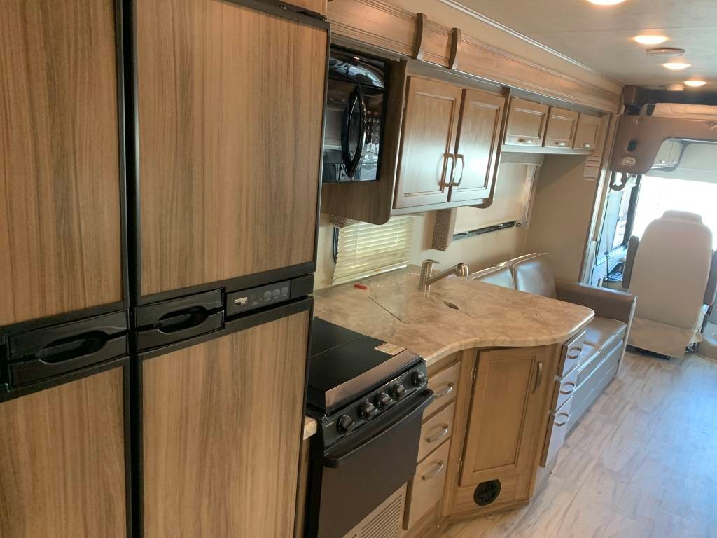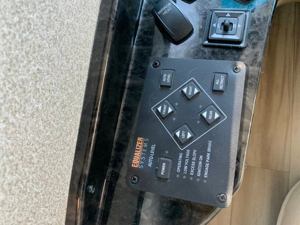 Heated Mirrors, Power Seats, 2 Air Conditioning Units, Full Swivel Seats, Mounted Card Table, Power Sun Visor, Color Backup Camera, Bluetooth Stereo, Power Overcab Dropdown Bunk, Large Flatscreen TV, Booth Dinette folds into Bed,, Sofa with Foldout Bed, Solid Surface Countertops, Sink with Stainless steel fixtures, Range top Microwave, 3 burner Stove with Oven, Backslash, Large 4 Door Refrigerator, slide out drawers, lots of additional storage, Porcelain Toilet, Large Walk-in Shower, Bathroom Cabinets, Close off Bedroom, Walk-around King Size Bed, Large Wardrobe, Lots of Cabinets & Drawers, Bedroom Flatscreen TV, and Much more