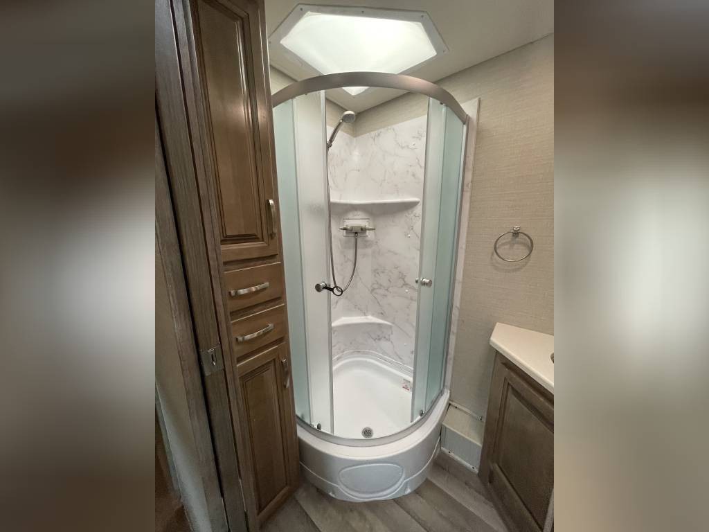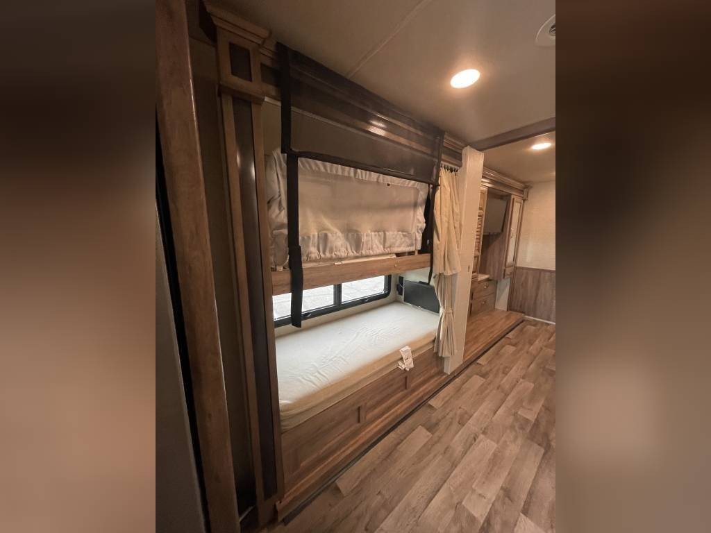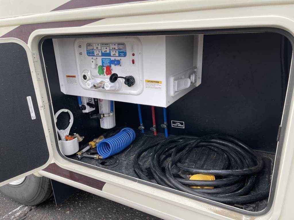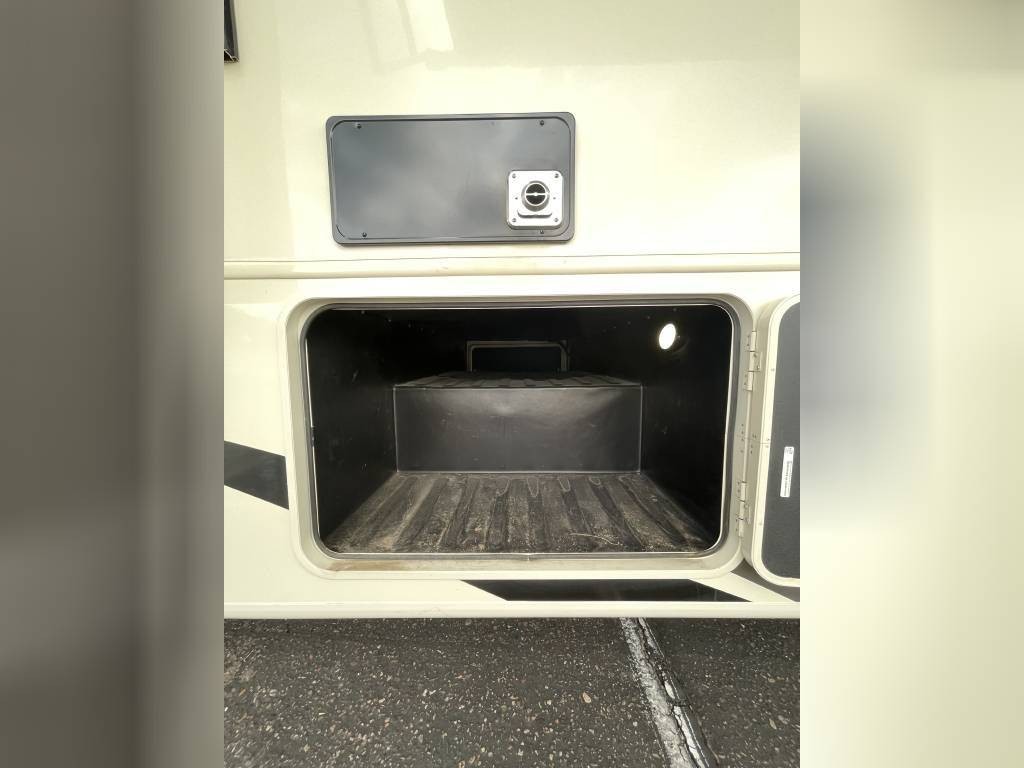 Basement includes two large full through storage compartments. Will come with our go to accessories, including heated water hose, 50A surge protector, heavy duty extension cords, and sewer hose support. Excellent option for full time living or large family trips.