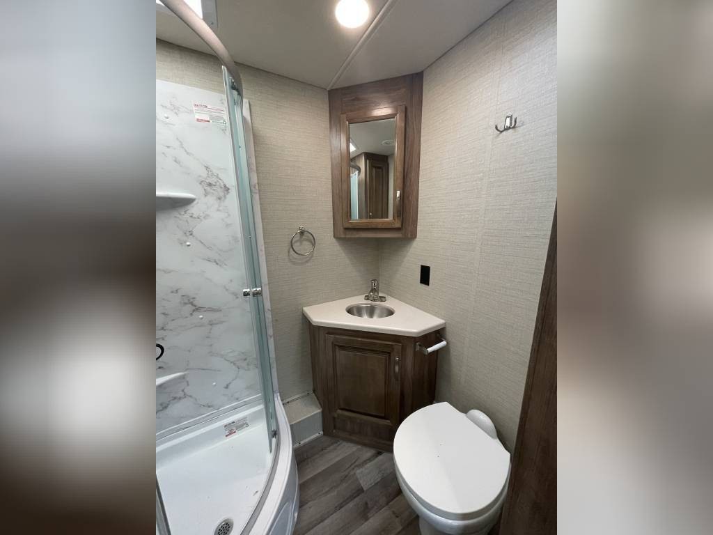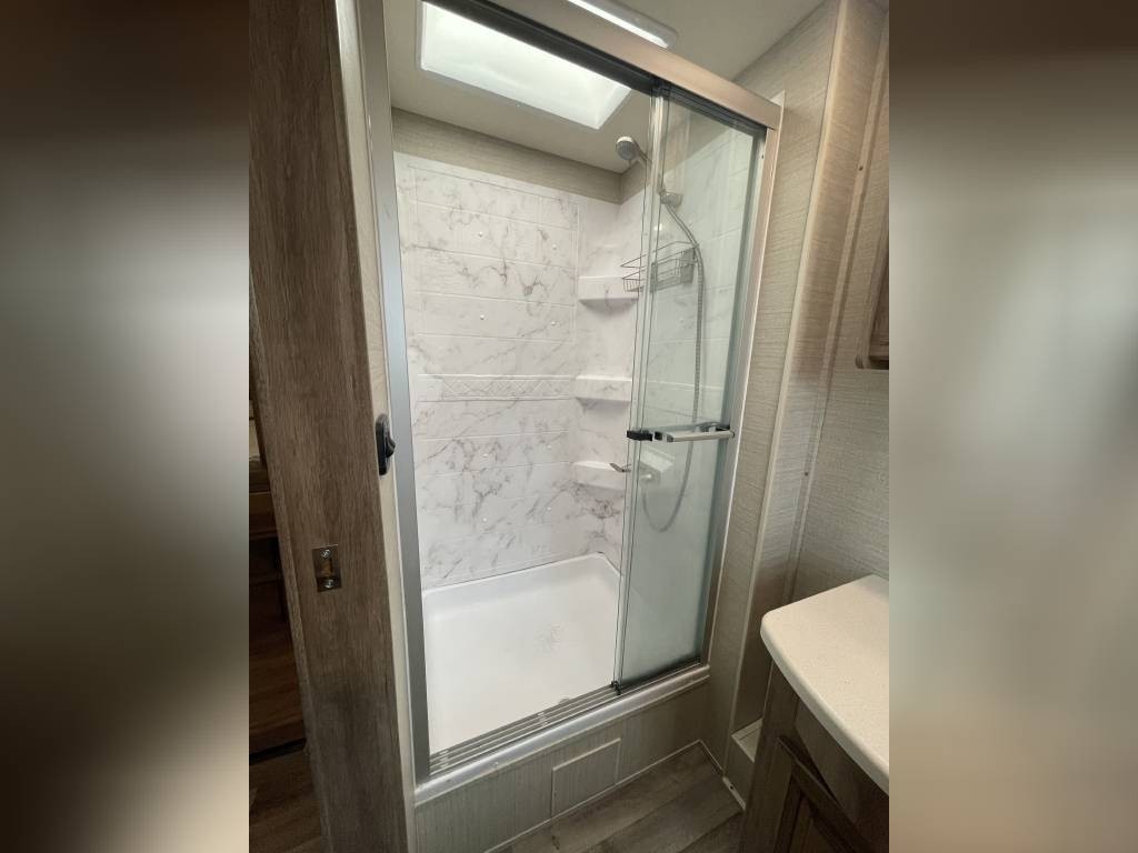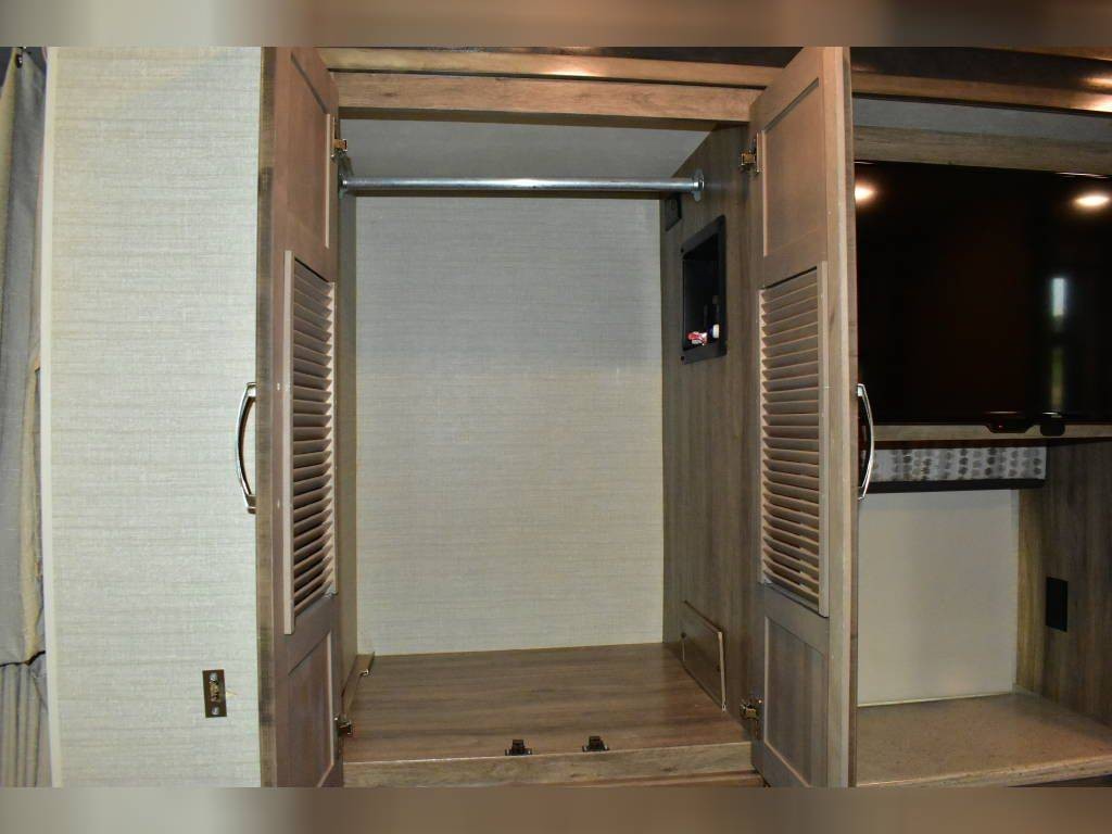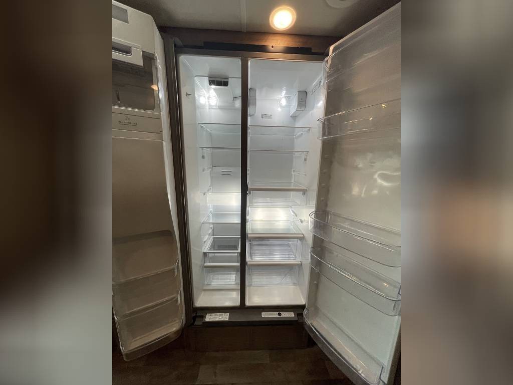 Basement includes two large full through storage compartments. Will come with our go to accessories, including heated water hose, 50A surge protector, heavy duty extension cords, and sewer hose support. Excellent option for full time living or large family trips.