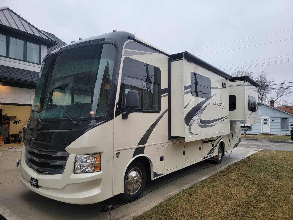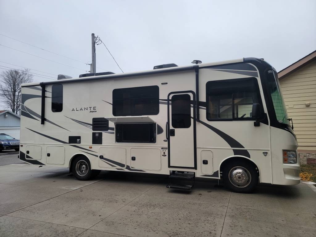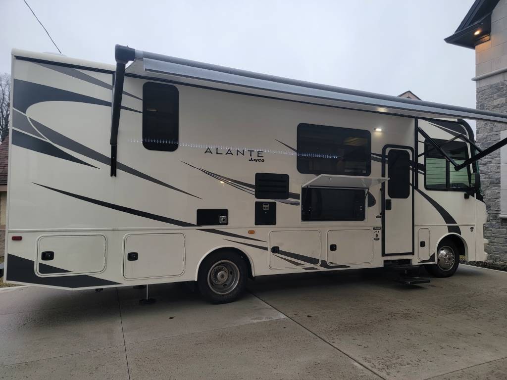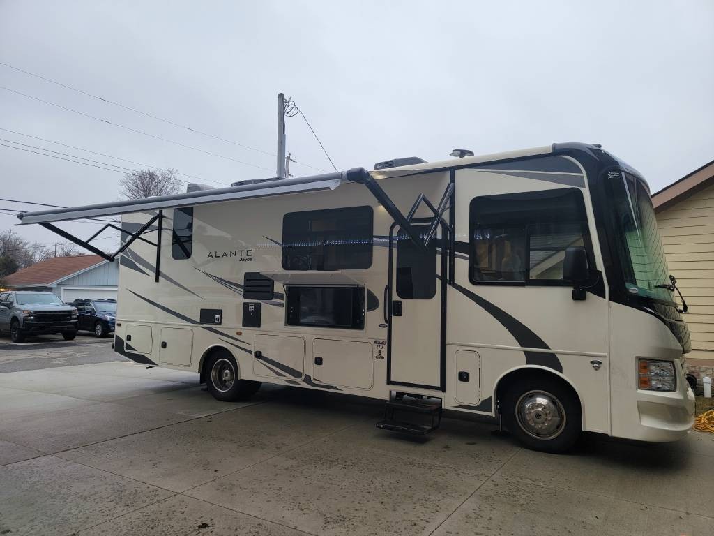 2021 Jayco Alante 27A.Only 11 hrs on generator Excellent condition, no issues. Added above and beyond factory standard: – Safe-T-Plus steering stabilizer – Electronic brake controller – Safe – Maxx-Air Bath Van Cover All warranty/maintenance done by General RV in Clarkston. All oil changes done at Suburban Ford of Waterford (has just had 2nd oil change). Highlights: – King bed in bedroom – Drop down overhead bunk – Sofa unfolds into bed – Dinette drops down into bed – TV at dinette is motorized to raise/lower – Oven & 3 burner cooktop – Full size microwave – Outdoor TV – Tons of storage inside & out – Sleeps 8 – Seatbelts for 8 – Has new 7.3L V8 Godzilla motor by Ford